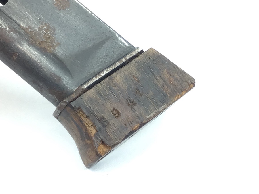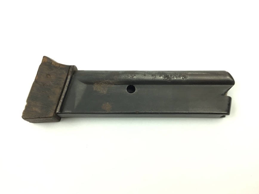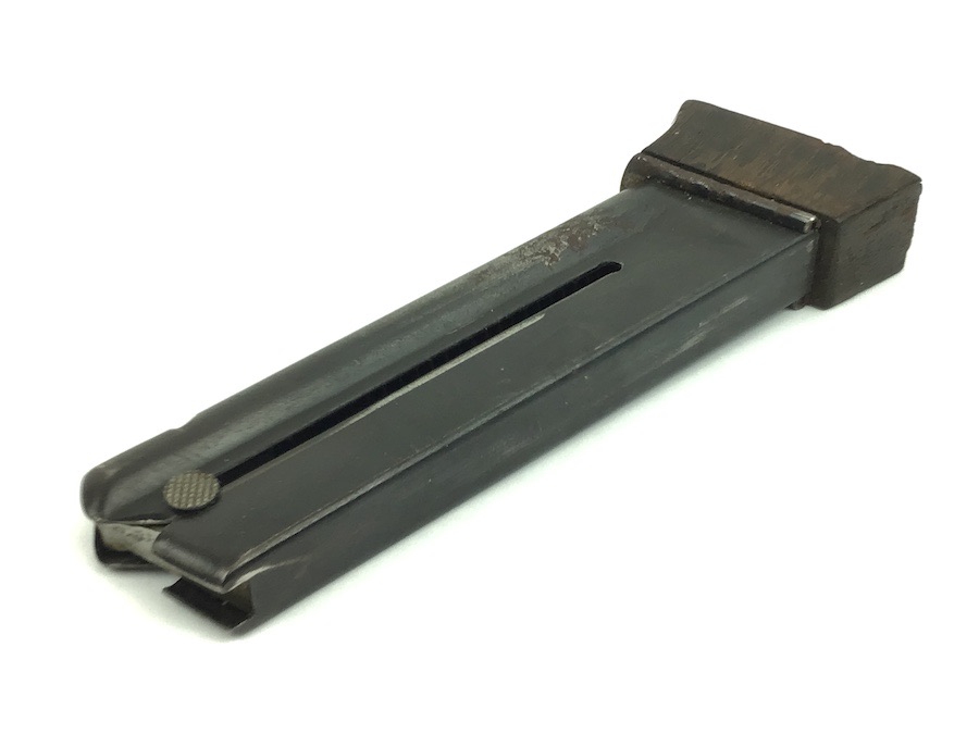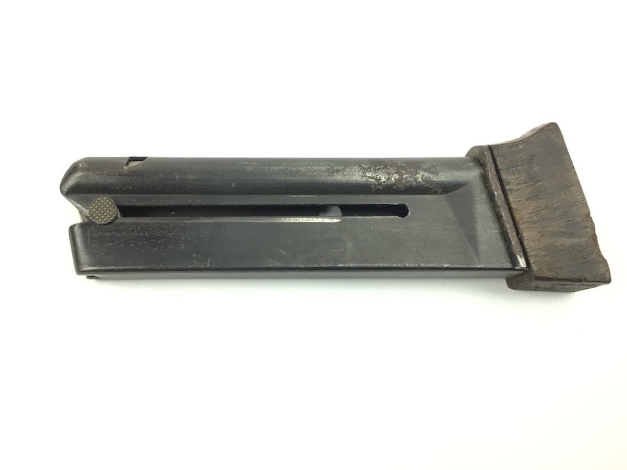 3/1/22 – This is an original Walther Olympia magazine in .22 caliber. This magazine has a hardwood base and the numerals “6941” stamped on the side. There is minor chipping on the base. The magazine frame is showing minor pitting. Minimal bluing wear. Strong, smooth spring. Holds 8 rounds.