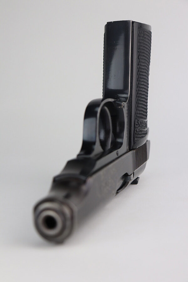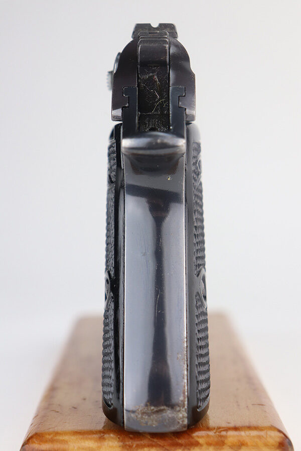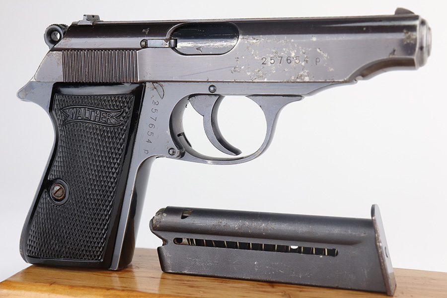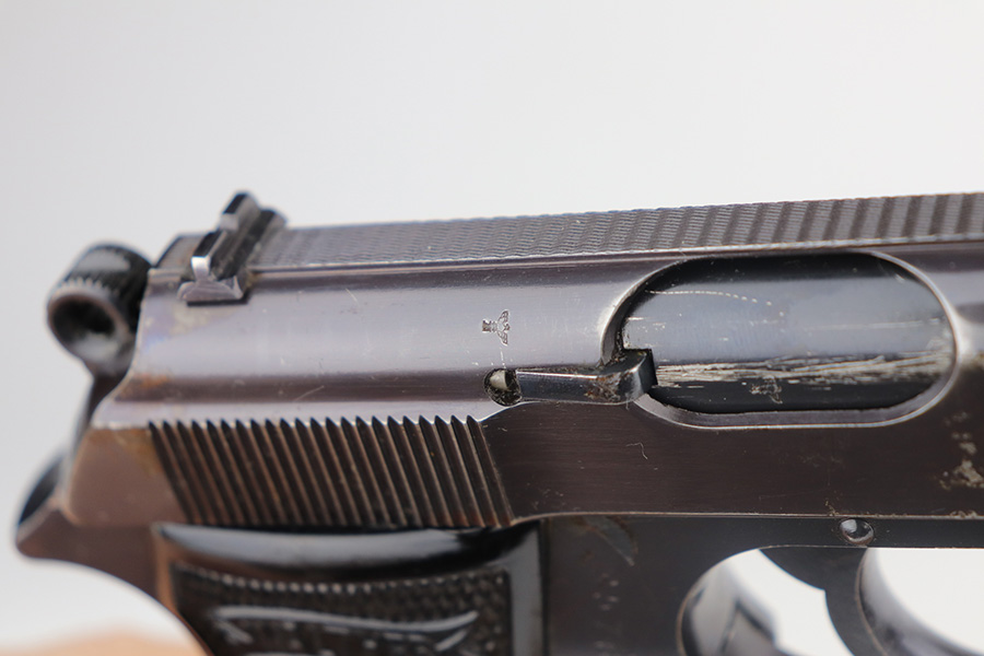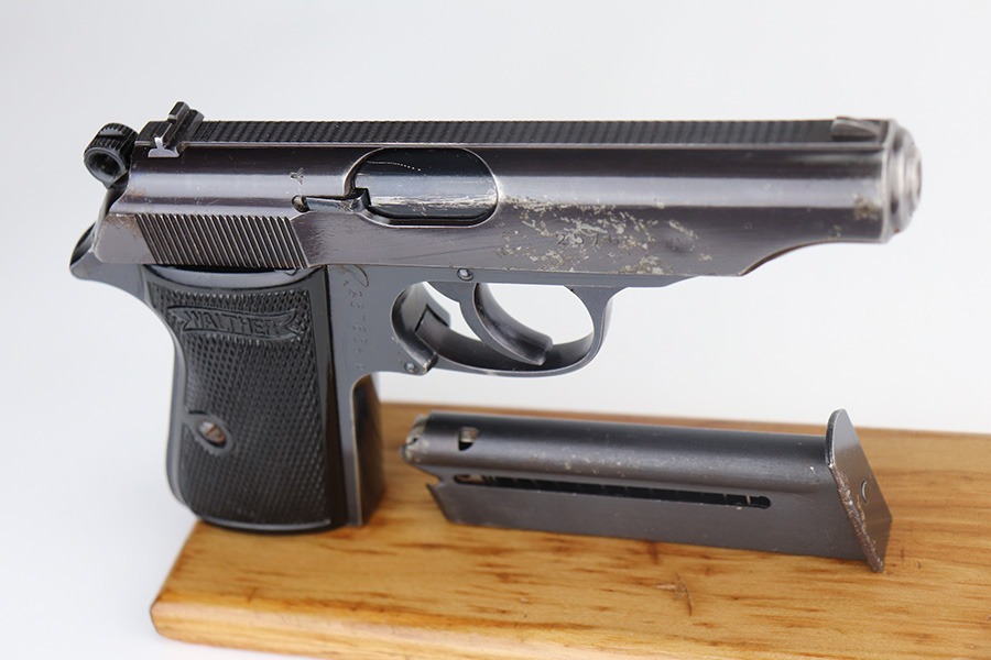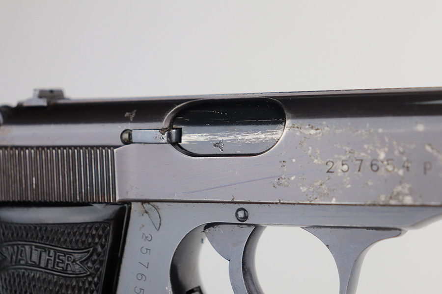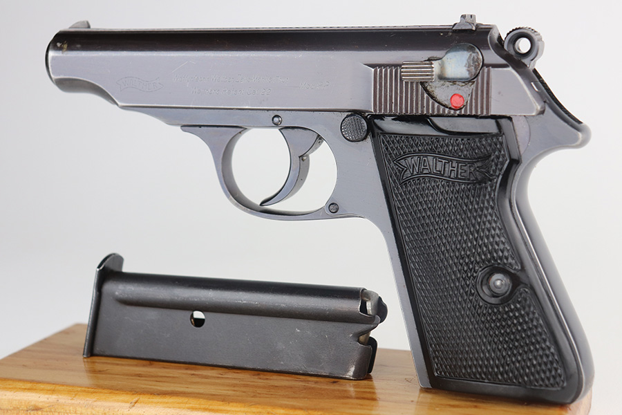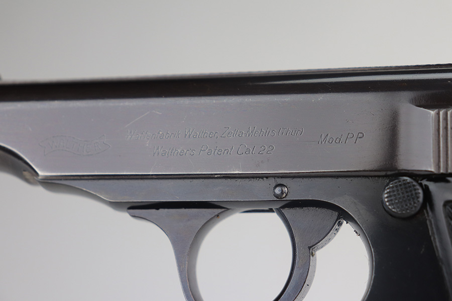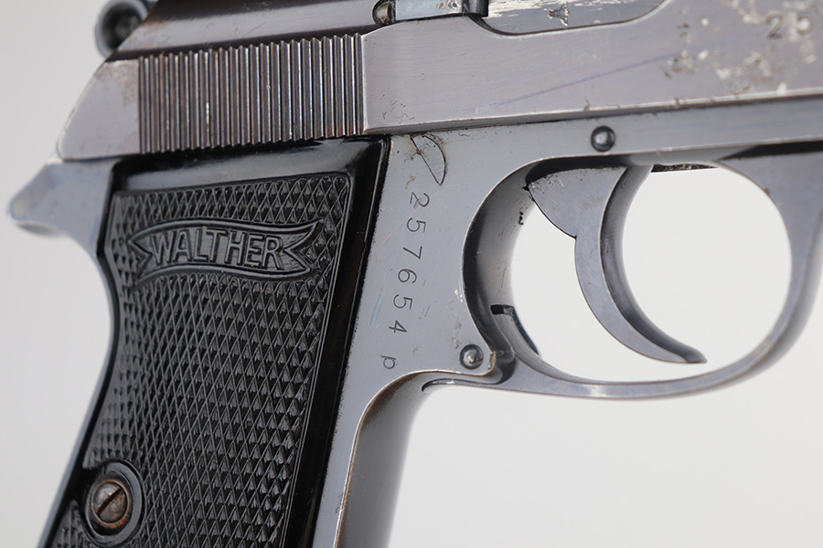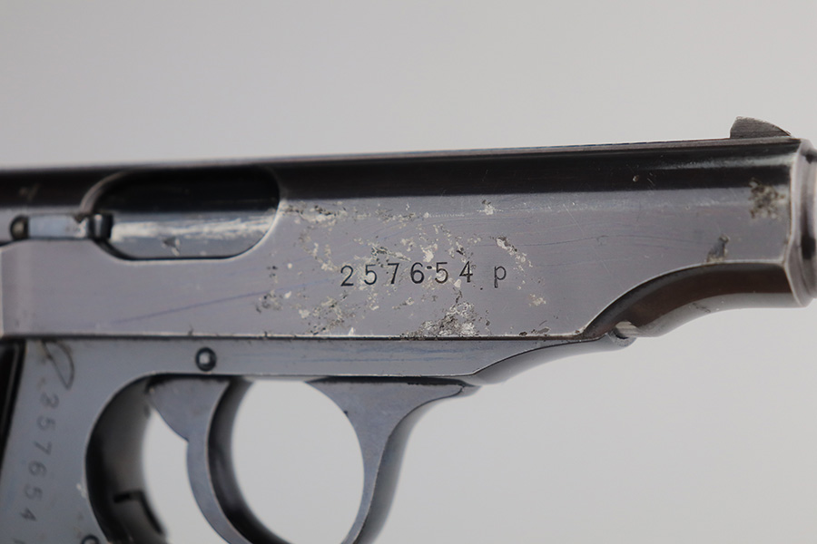 6/2/21 – This is a very nice example of a .22 Caliber Walther PP manufactured in 1942. It is matching and has the proper “Eagle N” proofs. It has retained about 93-94% of its original high polish finish. While there isn’t much actual finish loss, there is significant pitting on the whole right side of the slide and base of the back strap. Minor wear around the muzzle and very light handling marks along the slide and on the straps. Comes with excellent grips and a correct .22 caliber magazine. Minty bore.