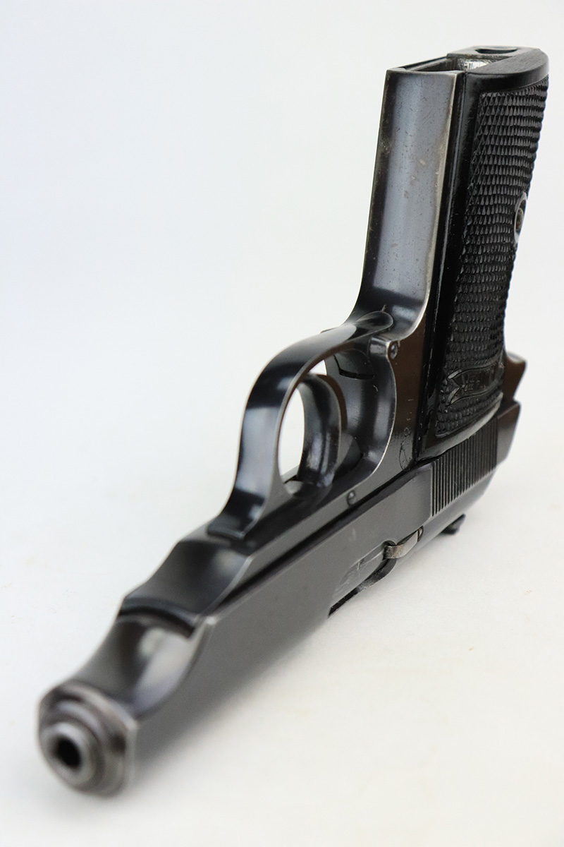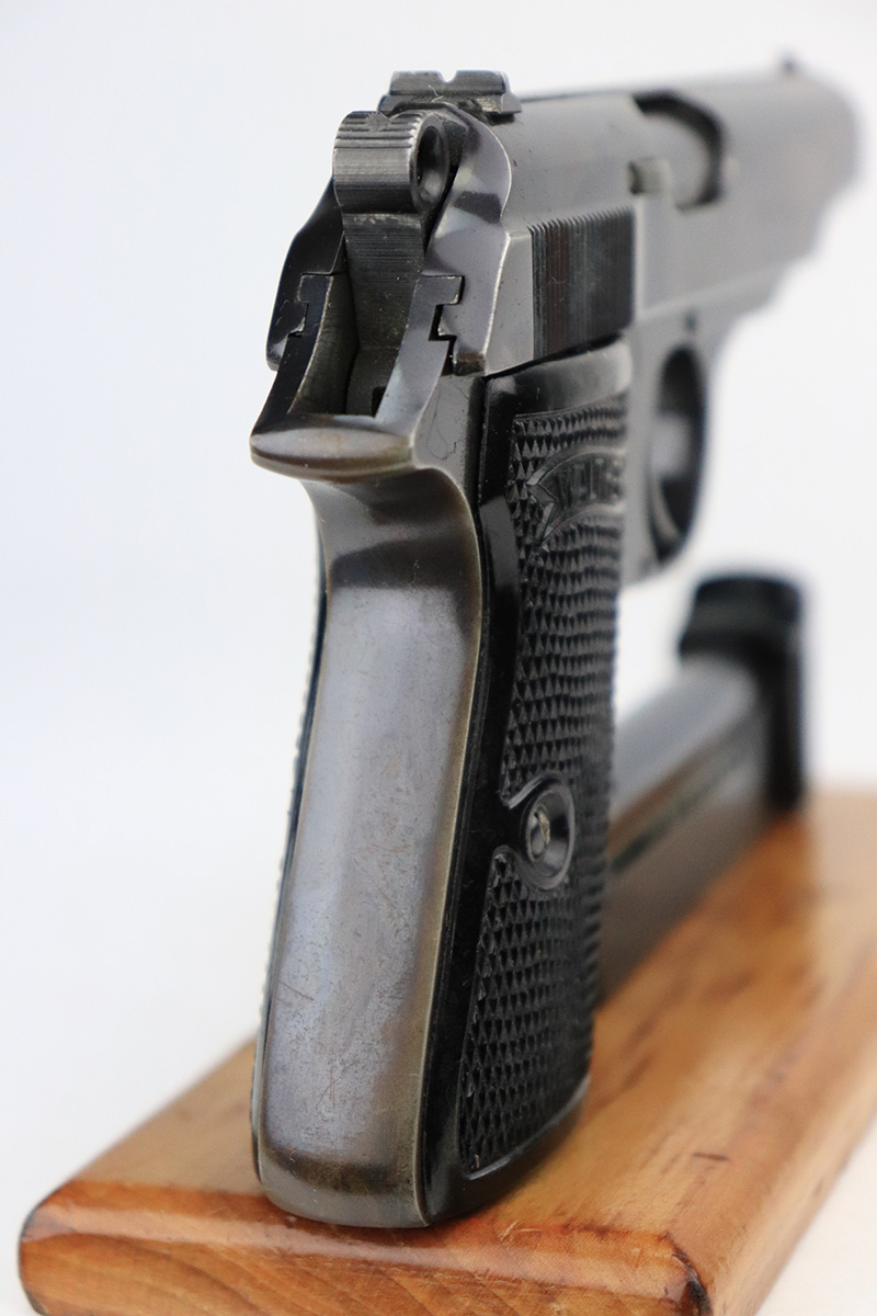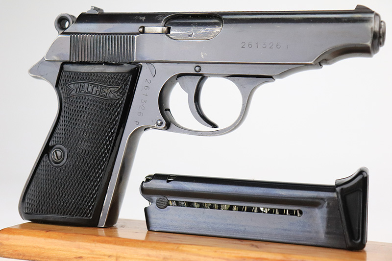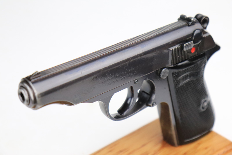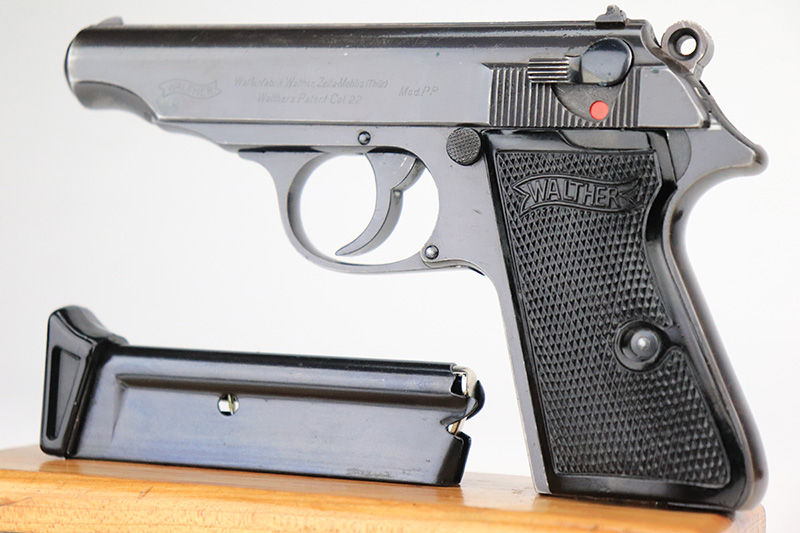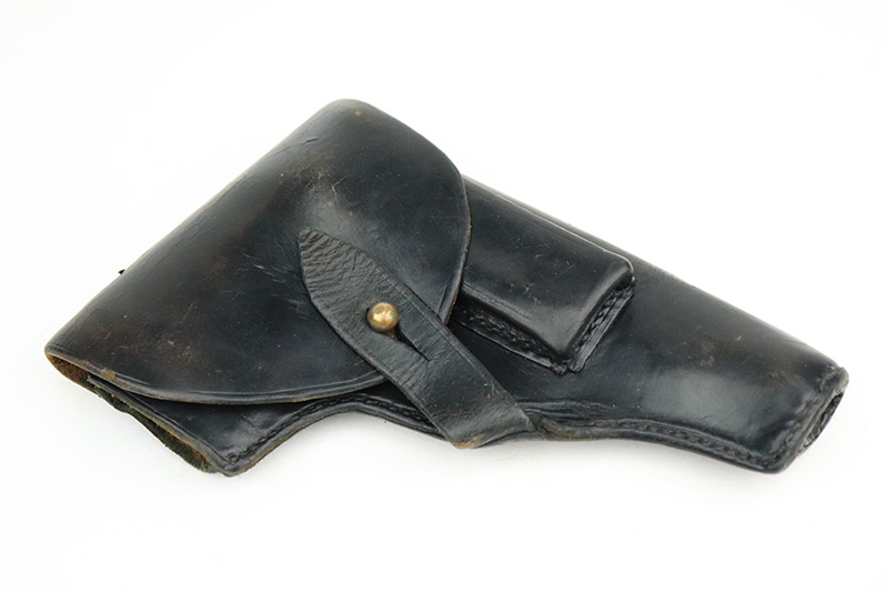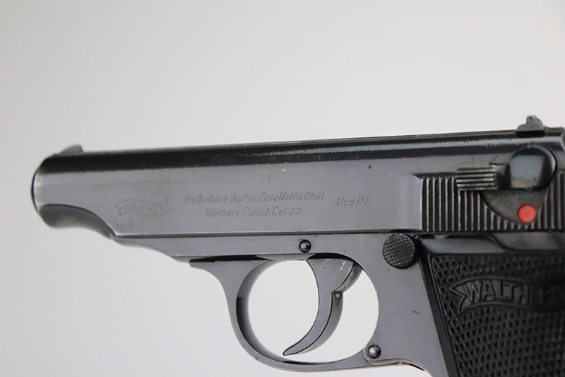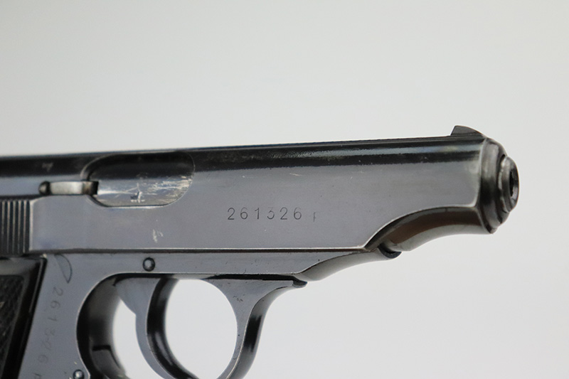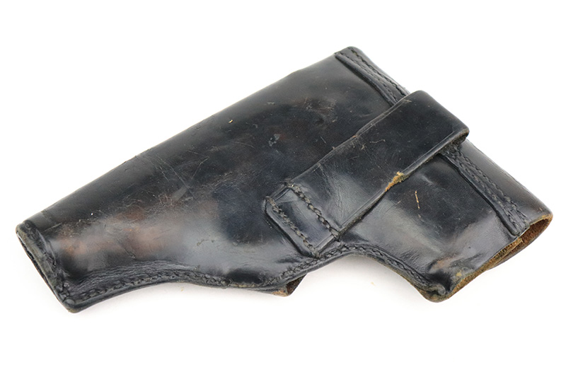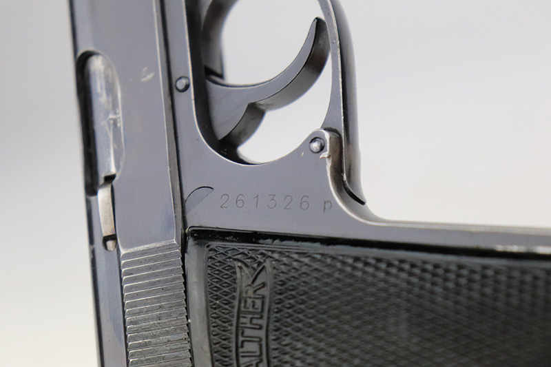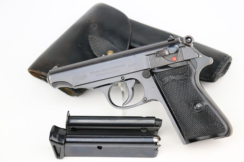 9/26/22 – This is a very nice example of a .22 Caliber Walther PP sold in the commercial market in 1942. It is all matching and has the proper “Eagle N” proofs. It comes as a rig with a generic 1942-dated black leather holster (fits the gun well) and two post-war .22 Caliber magazines – one is a flat bottom, the other is a finger extension. The gun itself has retained about 93-94% of its original high polish finish. There is minor muzzle wear, some light scratchy wear along both sides of the slide, and some spotty wear and light brown patina on both grip straps. Some light scratches on the barrel through the ejection port. Comes with excellent period-correct black bakelite grips. Mint bore.