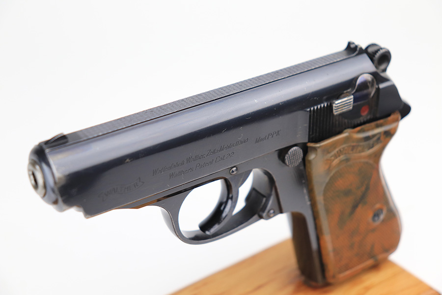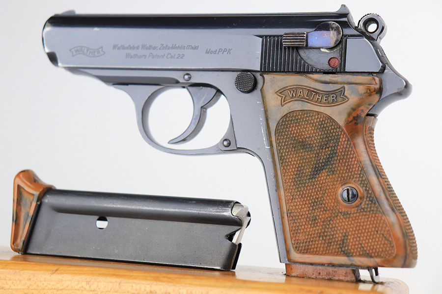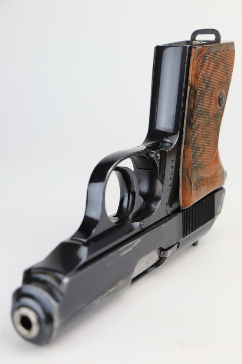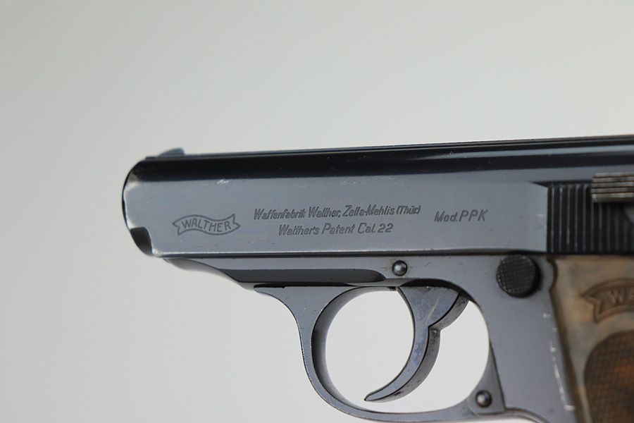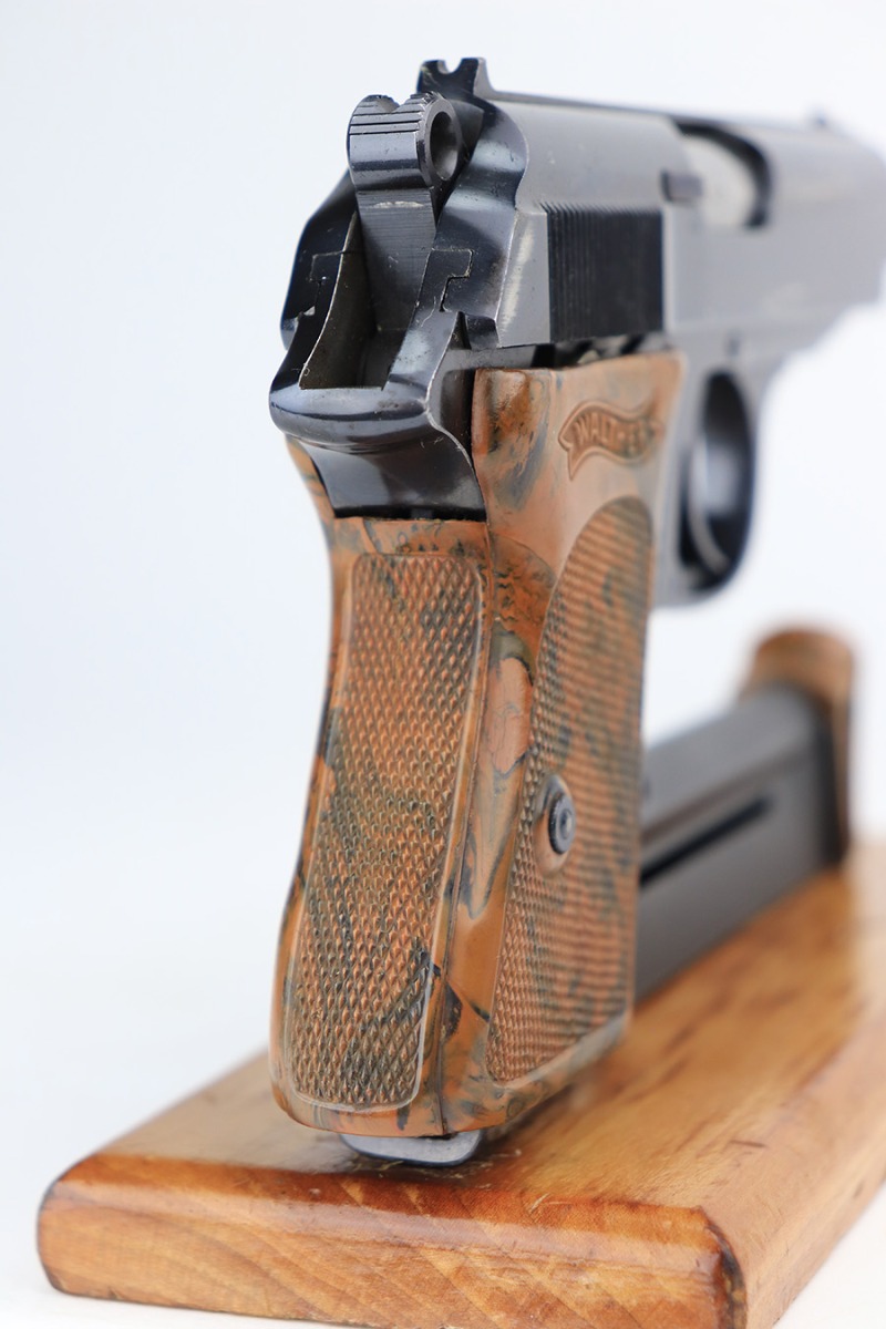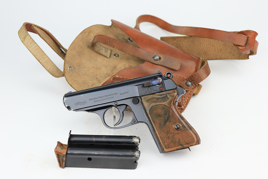 3/10/22 – This is an excellent example of a .22 Caliber Walther PPK sold in the commercial market in 1935. The gun is all matching and has the proper “Crown N” commercial proofs. It comes as a rig with a scarce tan leather shoulder holster, one period-correct brown finger extension magazine, and one spare period-correct flat bottom magazine. The gun has retained about 95-96% of its original high polish finish. There is wear around the muzzle and a few light streaks of wear along the right side of the slide. There are some micro-scratches and tiny handling marks here and there along the slide as well. Comes with an excellent period-correct brown grip – just one tiny crack in the spine. The bore is excellent – shiny with very strong rifling.
