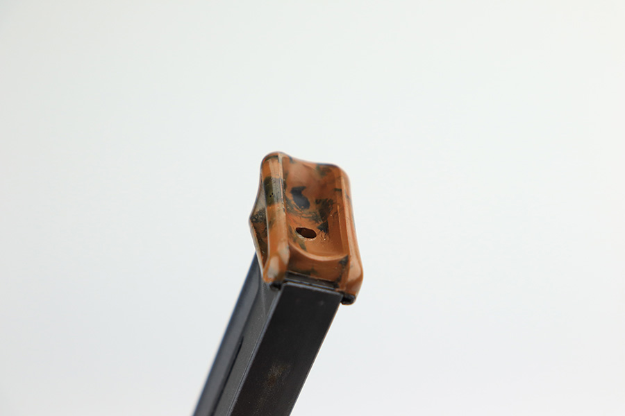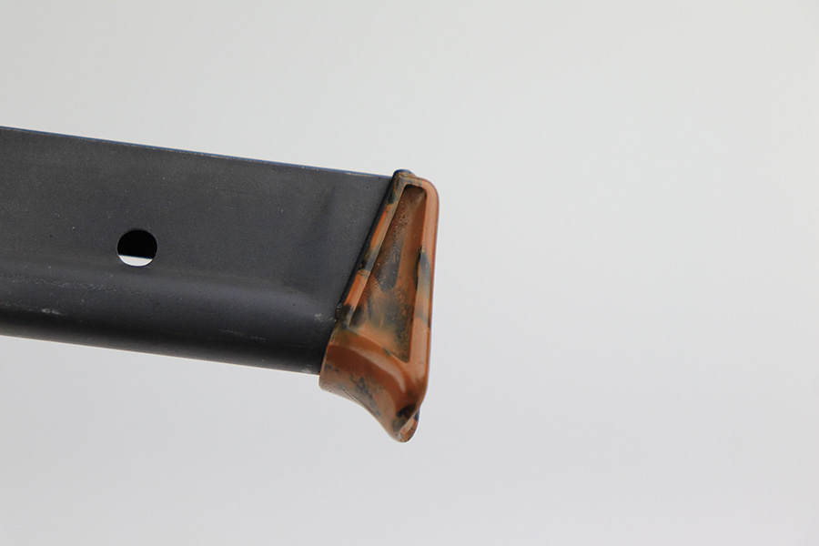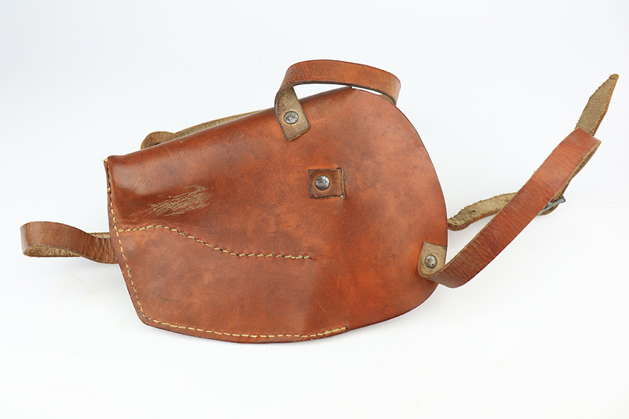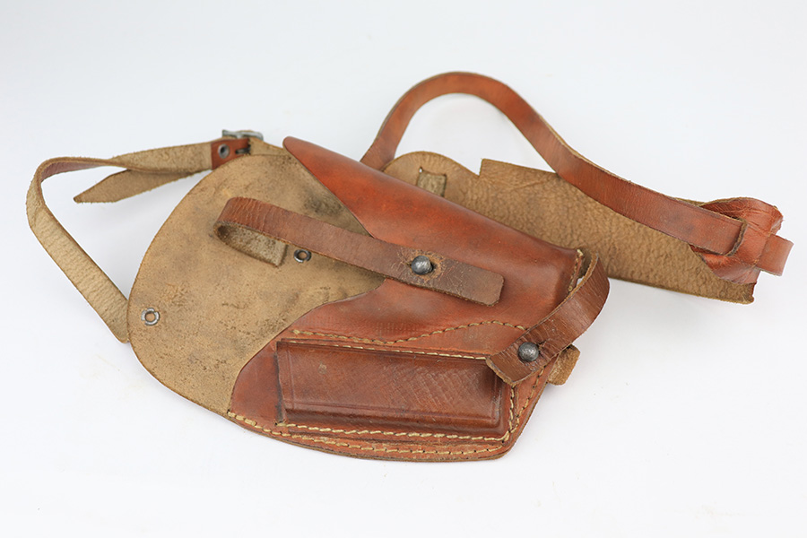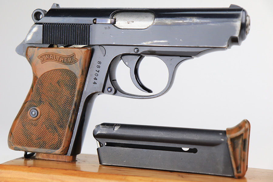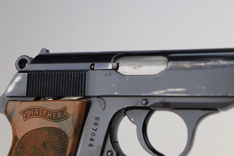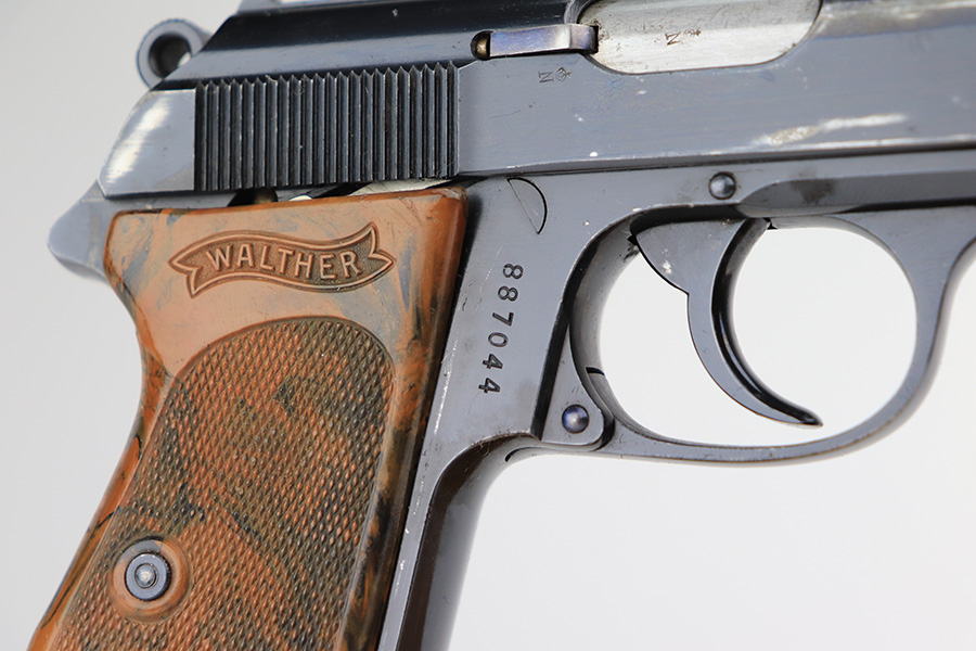3/10/22 – This is an excellent example of a .22 Caliber Walther PPK sold in the commercial market in 1935. The gun is all matching and has the proper “Crown N” commercial proofs. It comes as a rig with a scarce tan leather shoulder holster, one period-correct brown finger extension magazine, and one spare period-correct flat bottom magazine. The gun has retained about 95-96% of its original high polish finish. There is wear around the muzzle and a few light streaks of wear along the right side of the slide. There are some micro-scratches and tiny handling marks here and there along the slide as well. Comes with an excellent period-correct brown grip – just one tiny crack in the spine. The bore is excellent – shiny with very strong rifling.