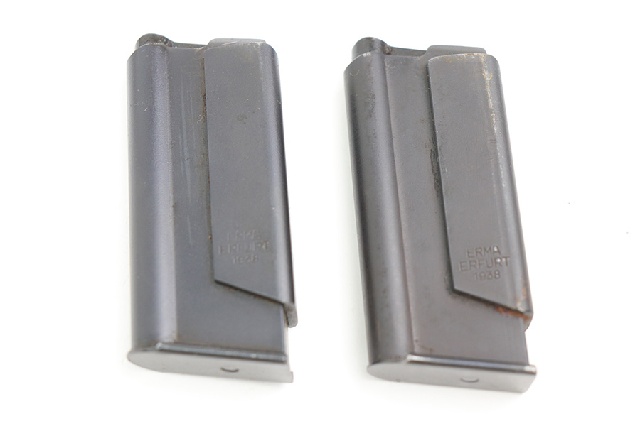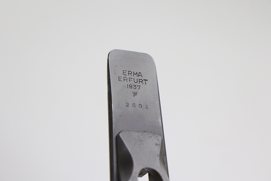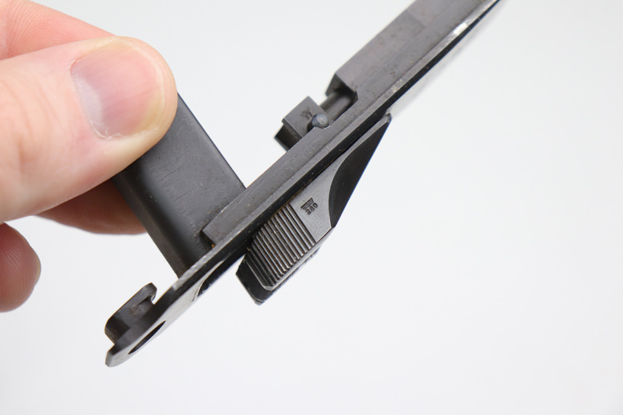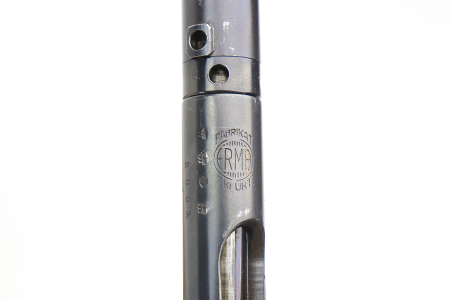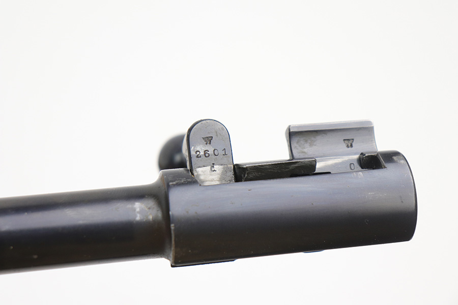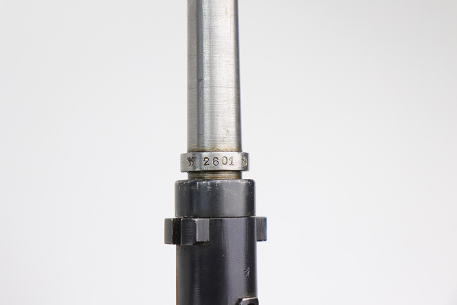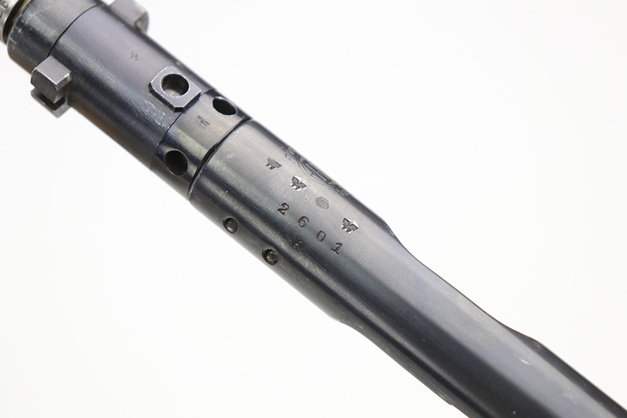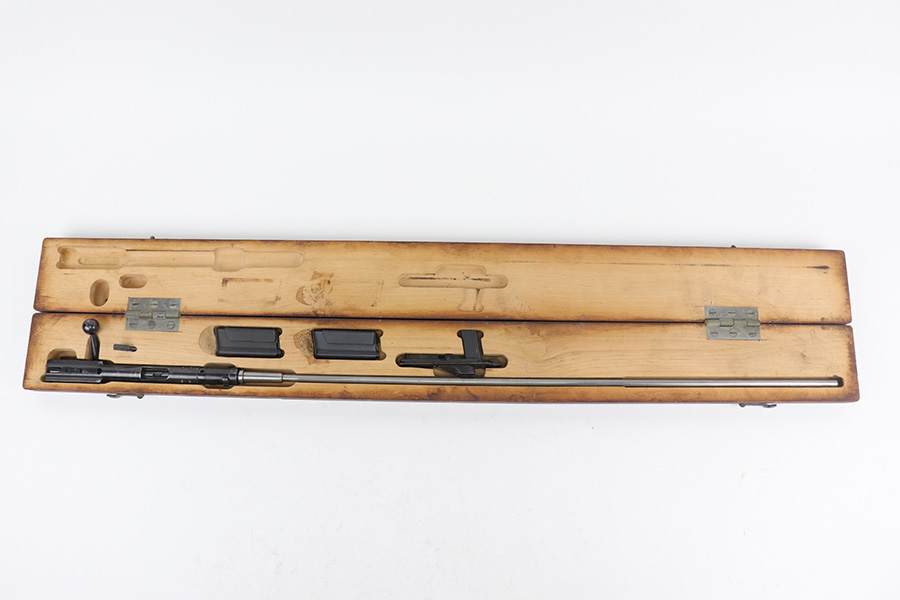 11/9/21 – This is a WW2 era production conversion kit for a K98 rifle. The kit is complete with everything required to turn a K98 rifle into .22 caliber. The barrel and bolt assembly is eagle/77 proof stamped and matching serial numbered. The blued finish is excellent overall despite some mild finish loss. No rust or pitting. Clean bore has minimal signs of previous use and excellent rifling. The base plate is also matching numbered and proof stamped. Fully functional.
