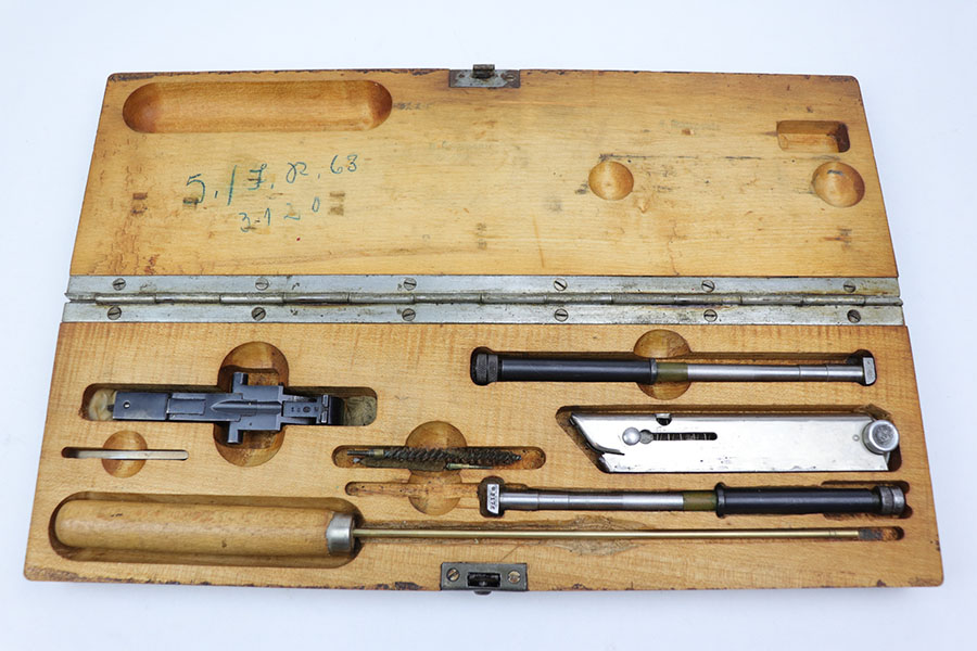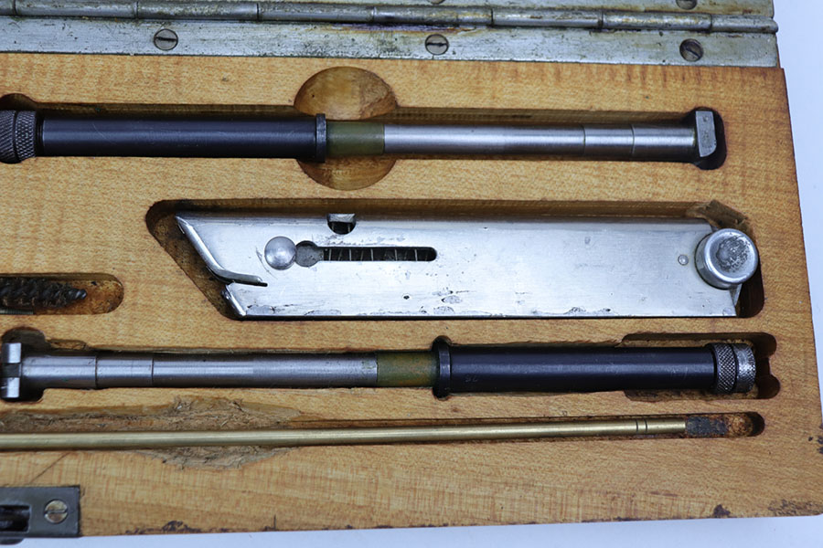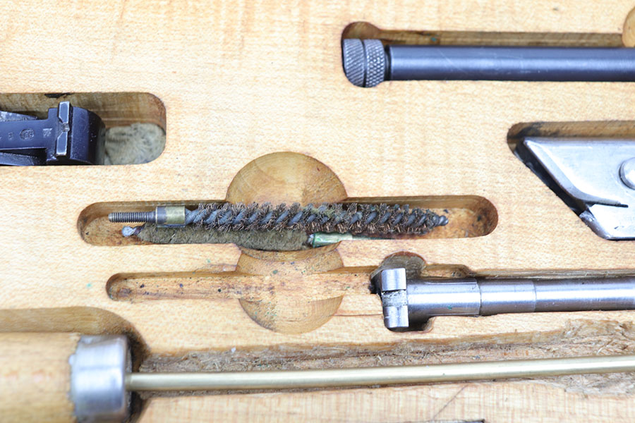 11/25/20 – This is an original, early / pre WW2 production Luger conversion kit. The kit is in excellent condition and complete. The parts are not matching numbered, as shown. There is minimal wear and both barrels (there are two included) have very nice bores, rating around 8/10 with some light residue but strong rifling. The magazine has a strong functional spring. Comes in the original wooden box that is marked “2.K.” on the front and the underside is marked “R.R.” with a 1932 date stamp. All original and authentic pieces.