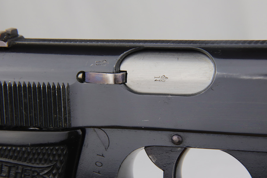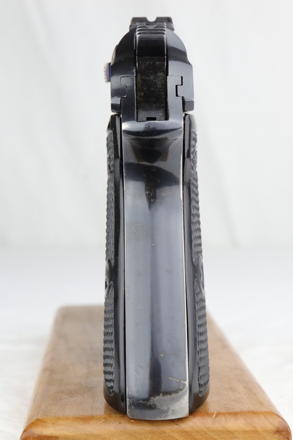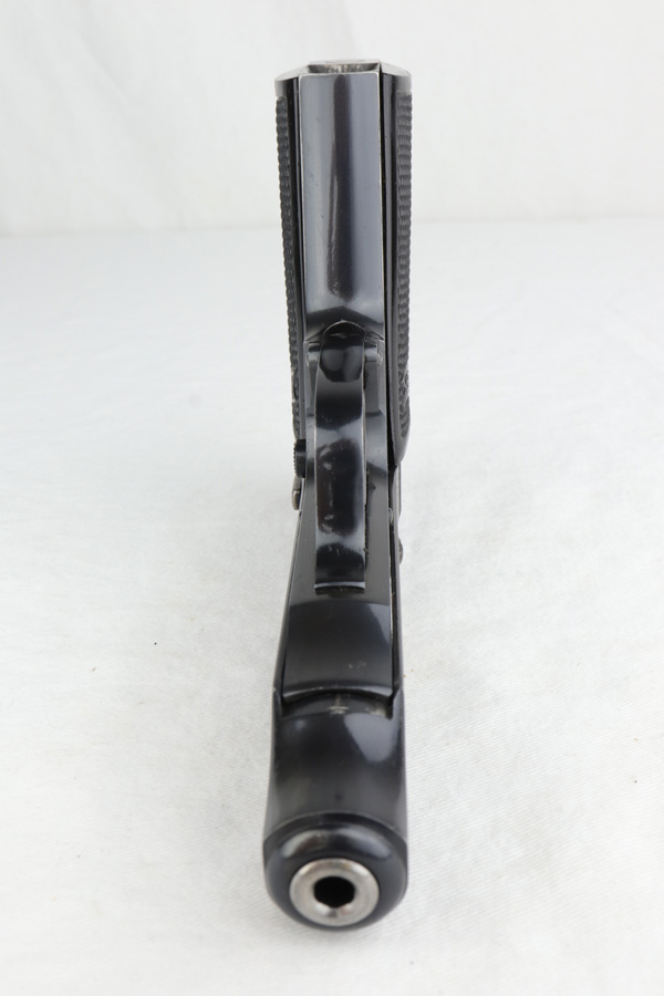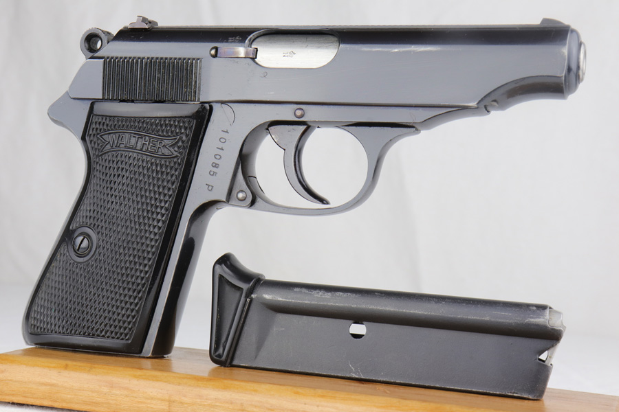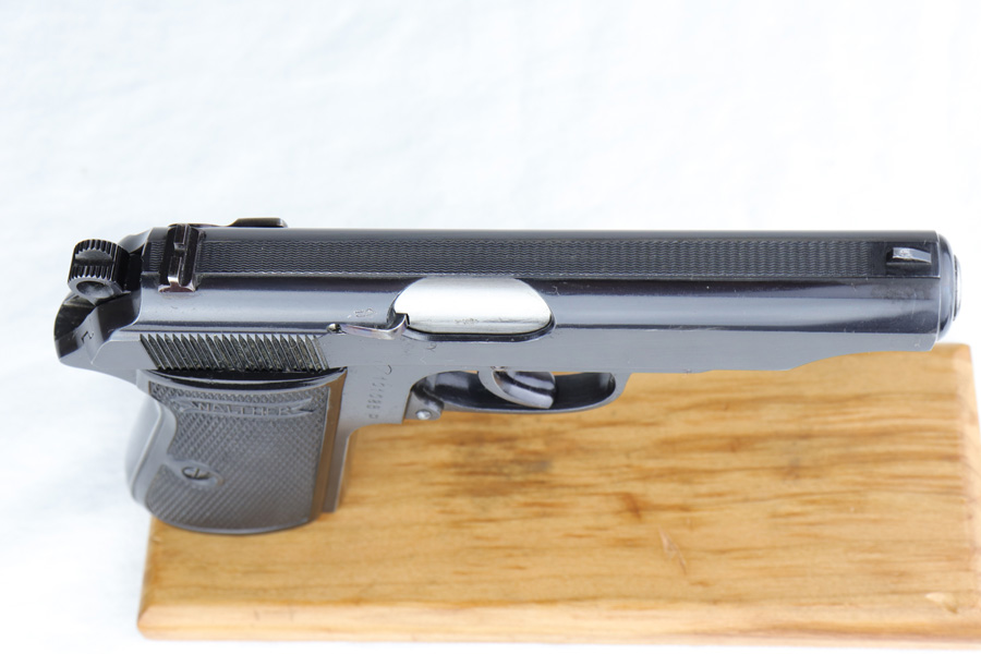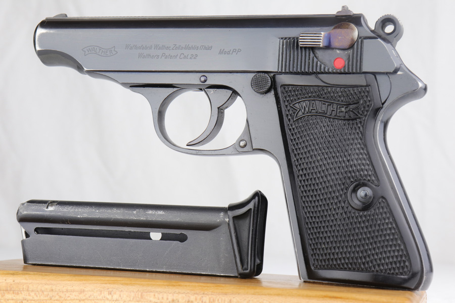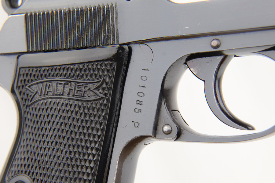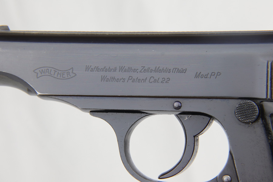1/4/18 – This is an excellent commercial Walther PP in the less common .22 caliber. It was made in 1938-39, so near the height of the Nazi era. The high-polish blue is original and rates at about 96% with muzzle wear on the left side slide, and an area of finish loss on the bottom of the back strap. Minty bore, grips and finger extension magazine.