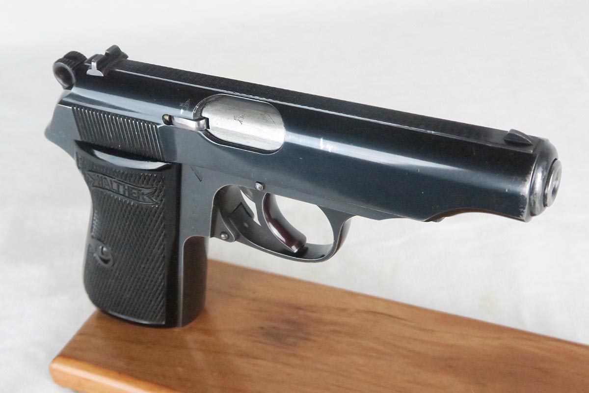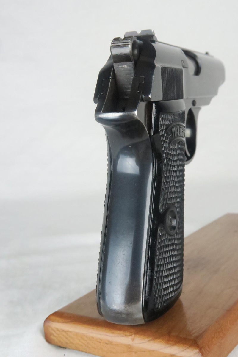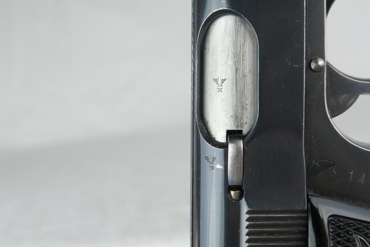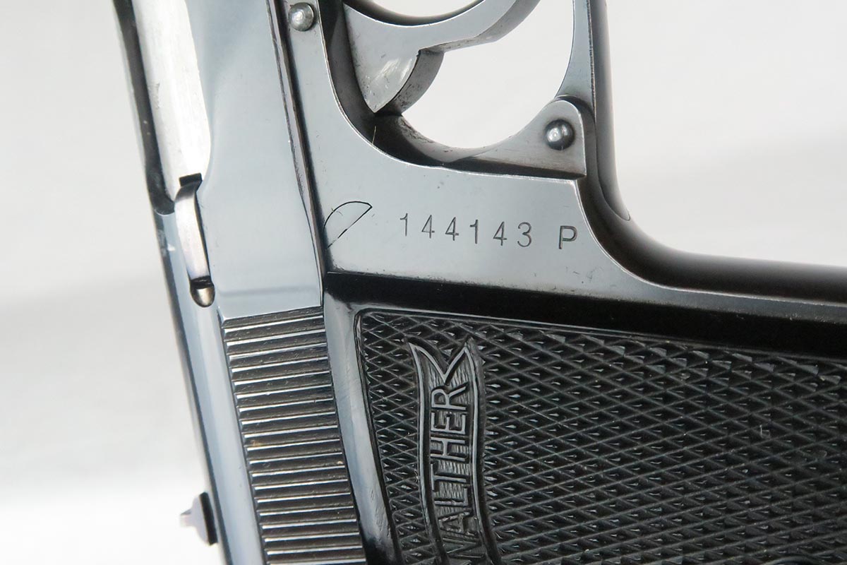 12/29/17 – This is a nice Walther PP chambered in .22 caliber. The original high-polish finish rates at 94-95% with muzzle wear on both sides of the slide, as well as some finish loss on the trigger guard and the bottom of the back strap. Serial dates this pistol to ~1940, and it has the appropriate eagle/N proofs for that date. Excellent black grips. Terrific bore. Postwar magazine.