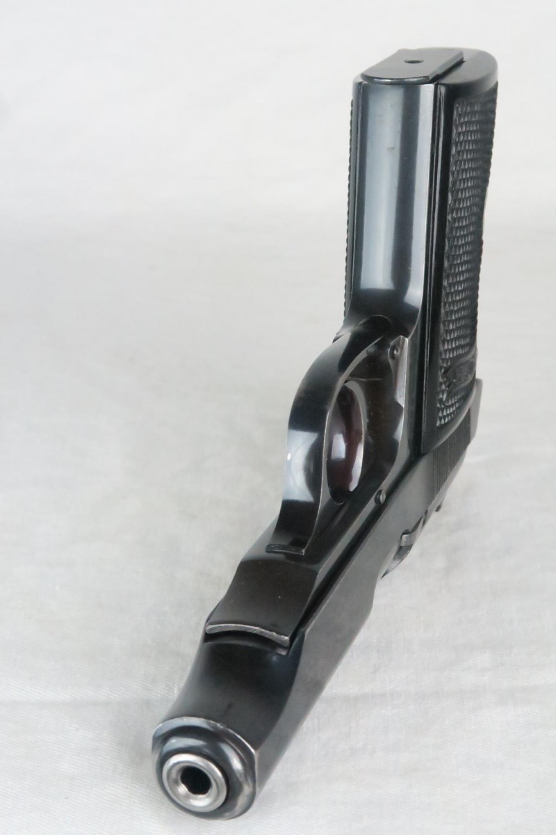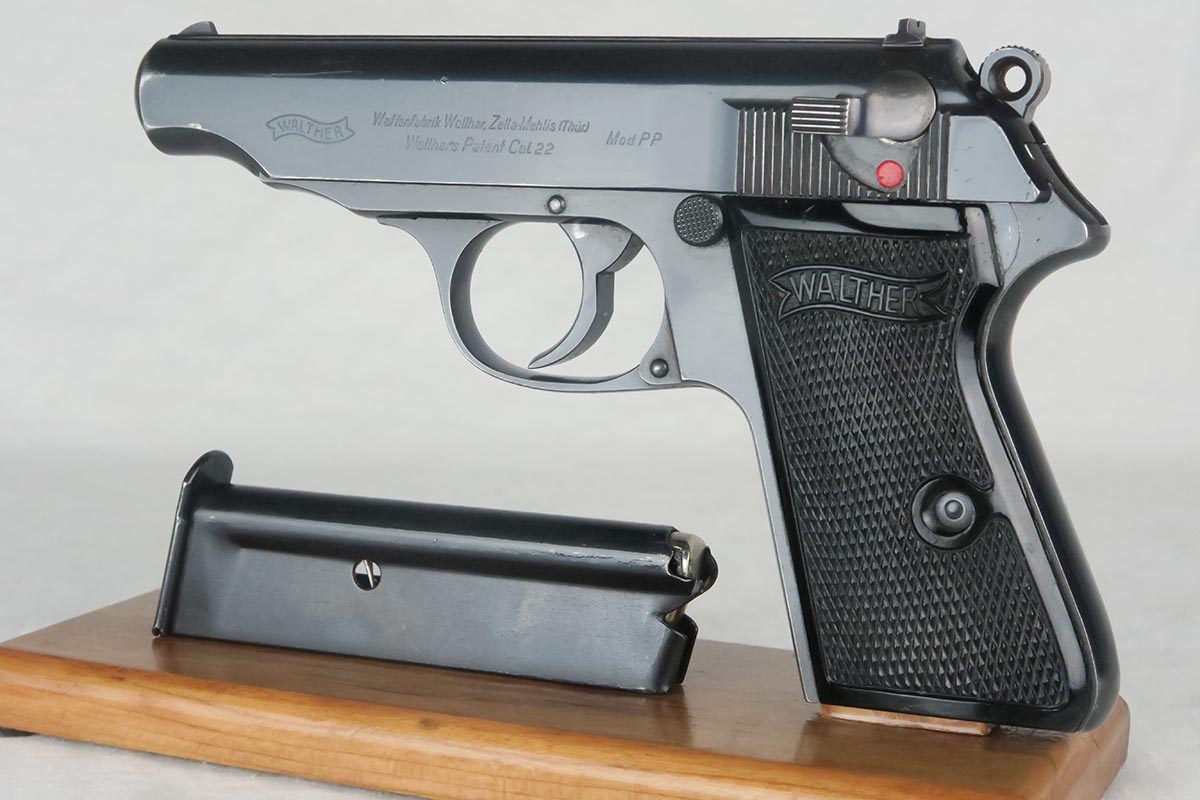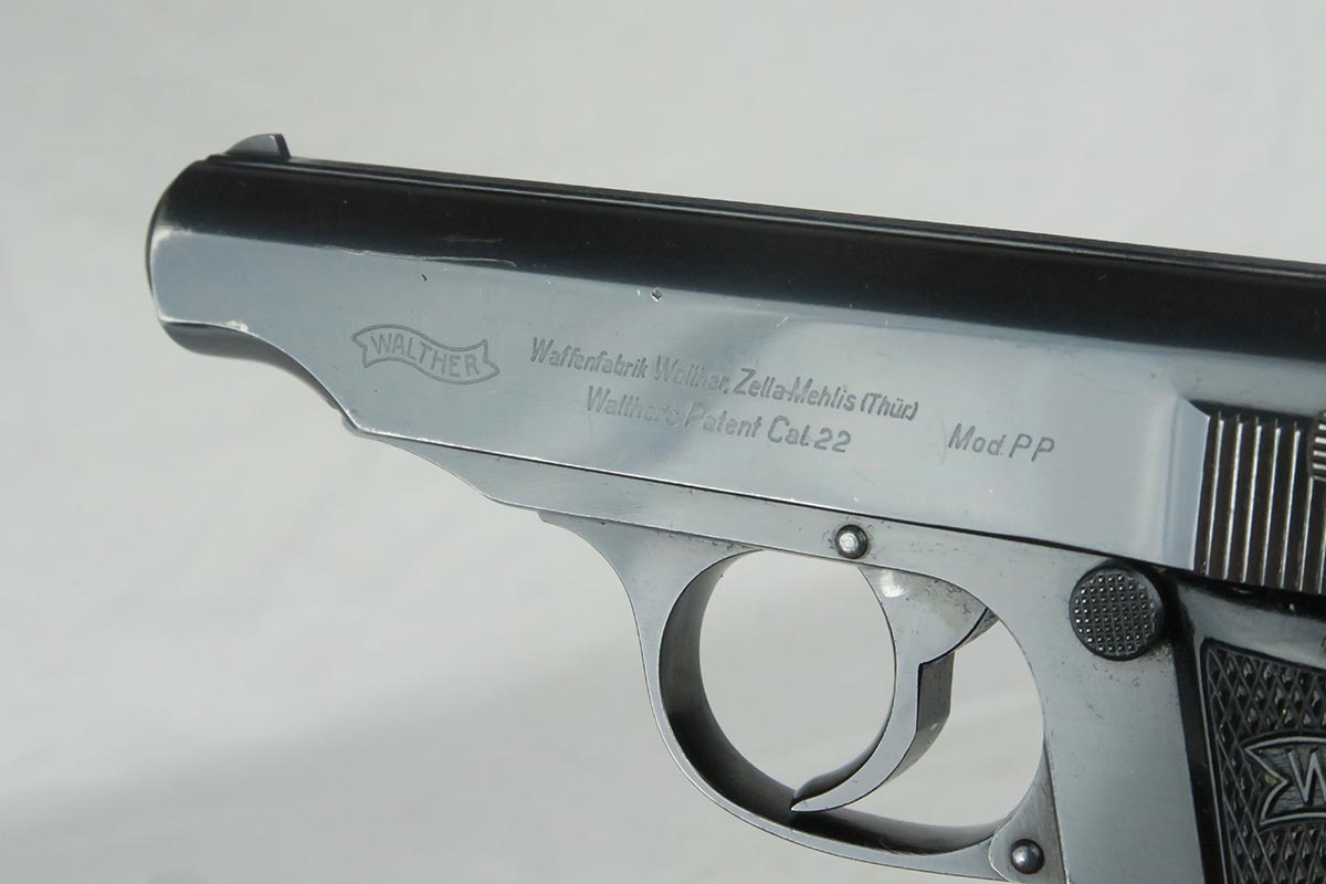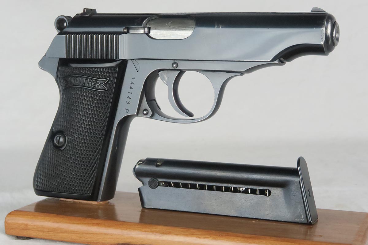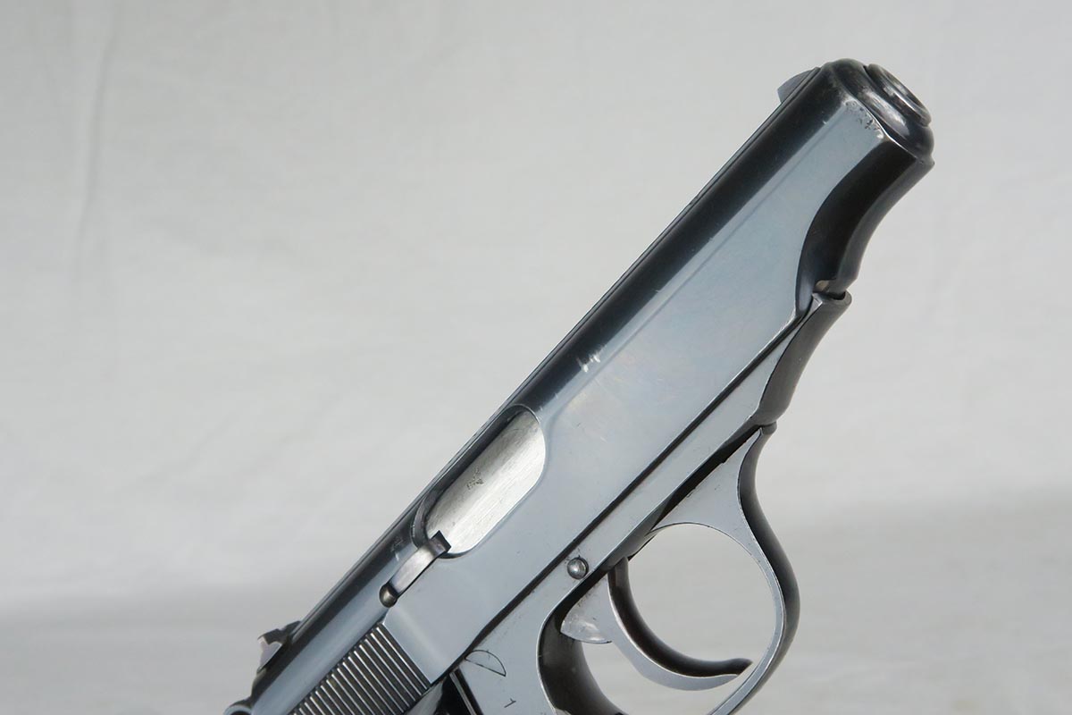 12/29/17 – This is a nice Walther PP chambered in .22 caliber. The original high-polish finish rates at 94-95% with muzzle wear on both sides of the slide, as well as some finish loss on the trigger guard and the bottom of the back strap. Serial dates this pistol to ~1940, and it has the appropriate eagle/N proofs for that date. Excellent black grips. Terrific bore. Postwar magazine.