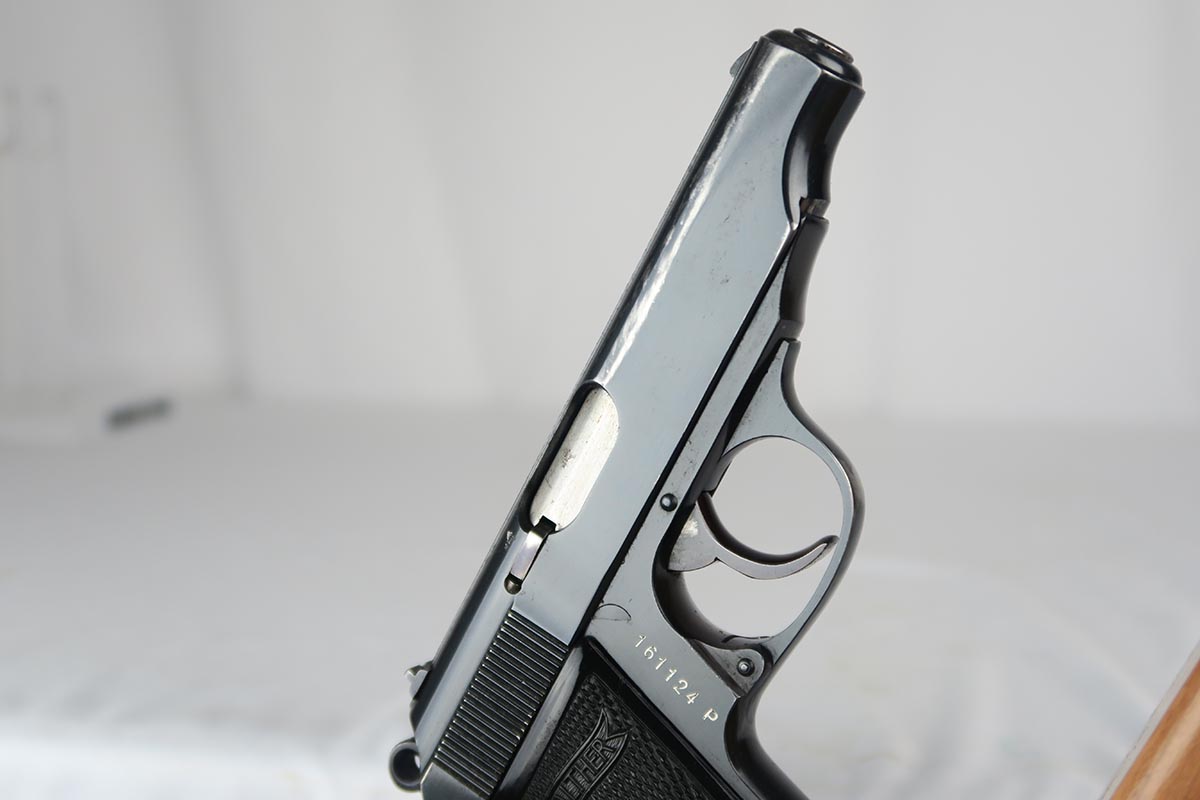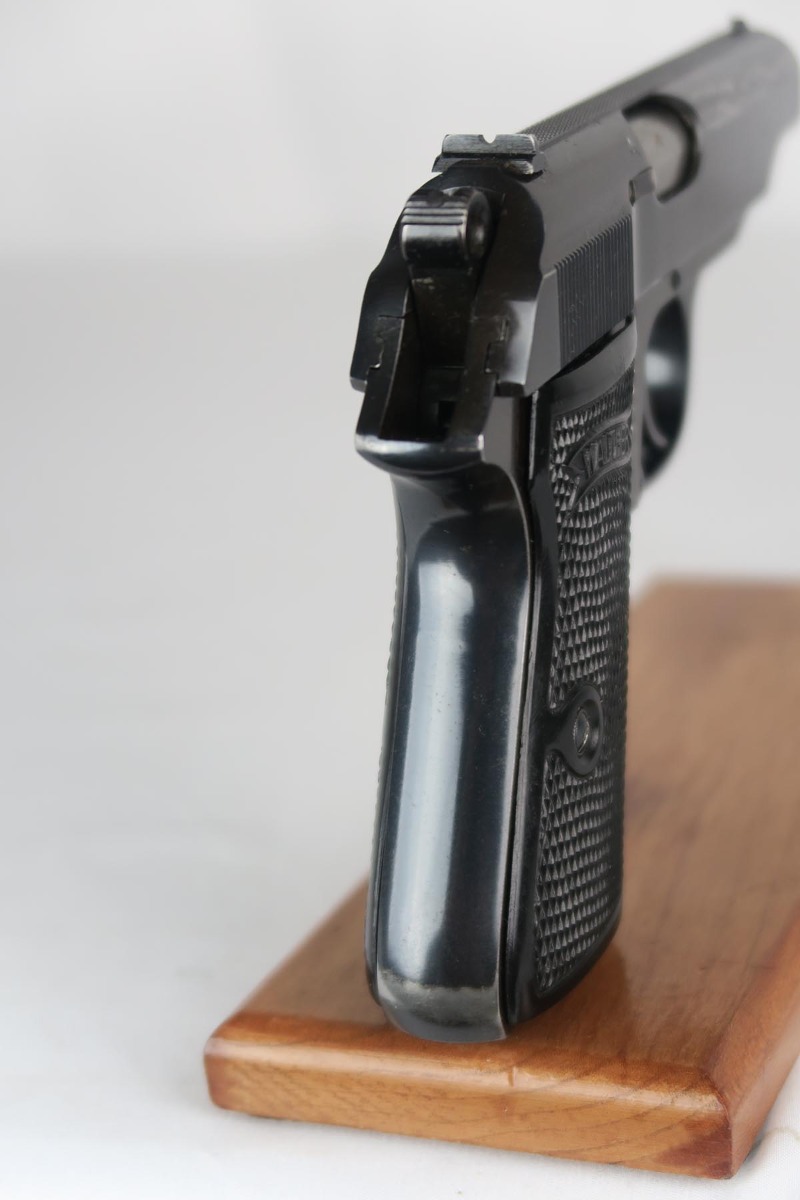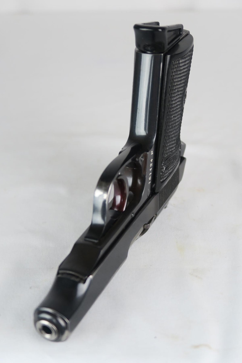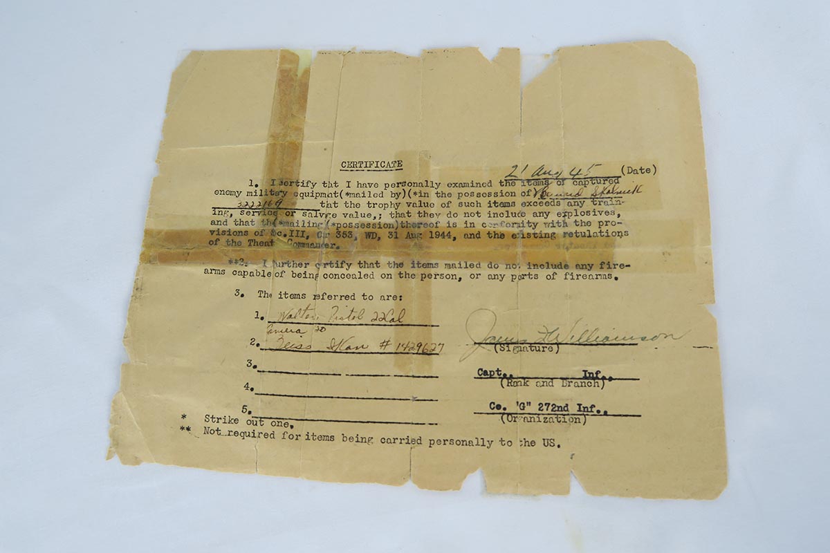 2/12/18 – This is a Walther PP chambered in .22 caliber, with the original capture document. The pistol was brought back in August of 1945, and is numbered by serial on the back of the document but listed as ‘Walther Pistol 22Cal’ on the item line of the sheet. The pistol is all original with about 90% blue remaining. There is wear on the trigger guard, as well as a notable area of finish loss along the top of the right side of the slide. Bore is shiny with strong rifling. Excellent grips and finger extension magazine.