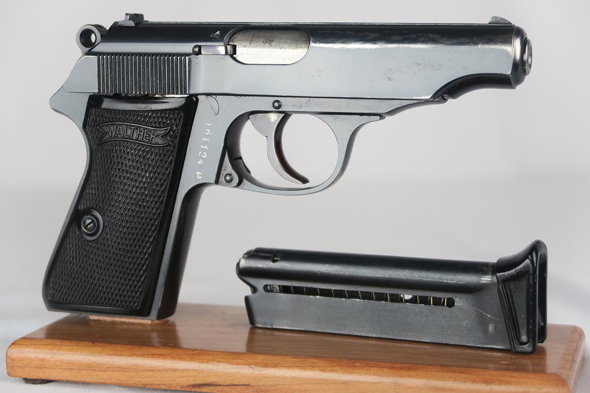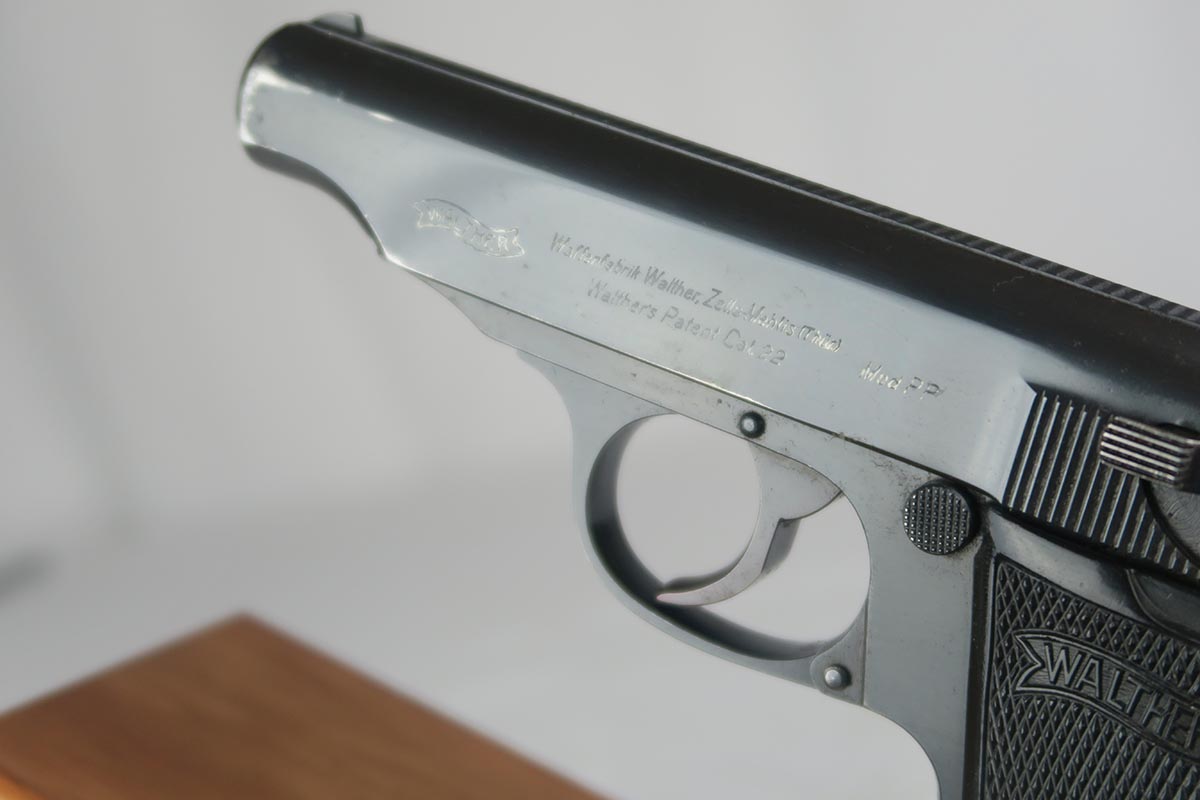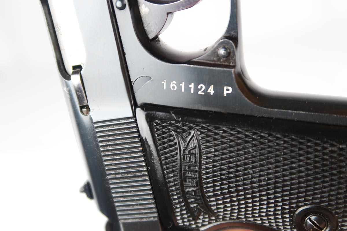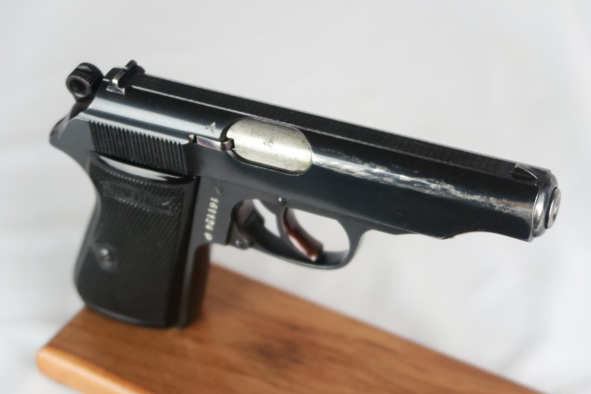 2/12/18 – This is a Walther PP chambered in .22 caliber, with the original capture document. The pistol was brought back in August of 1945, and is numbered by serial on the back of the document but listed as ‘Walther Pistol 22Cal’ on the item line of the sheet. The pistol is all original with about 90% blue remaining. There is wear on the trigger guard, as well as a notable area of finish loss along the top of the right side of the slide. Bore is shiny with strong rifling. Excellent grips and finger extension magazine.