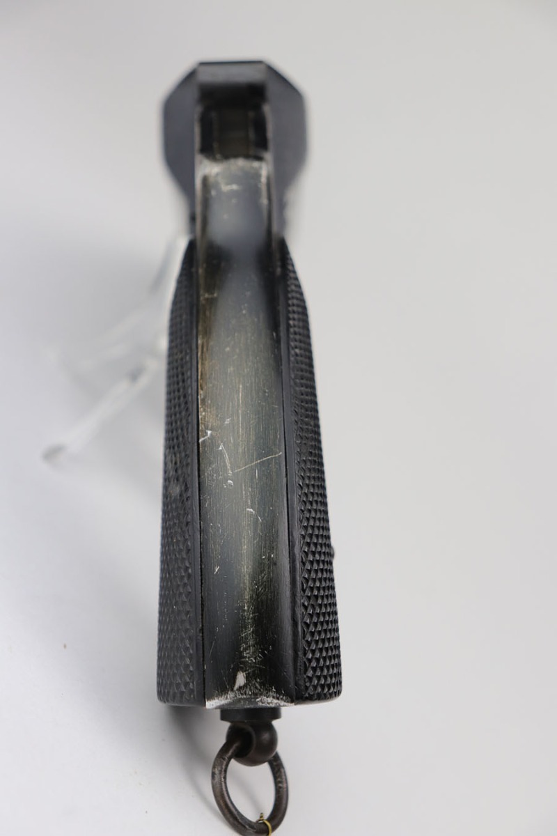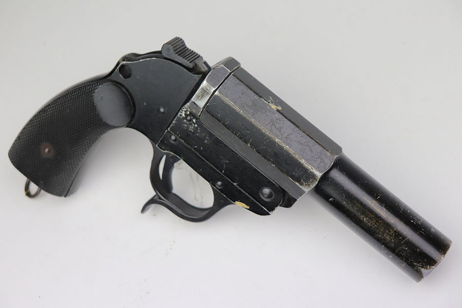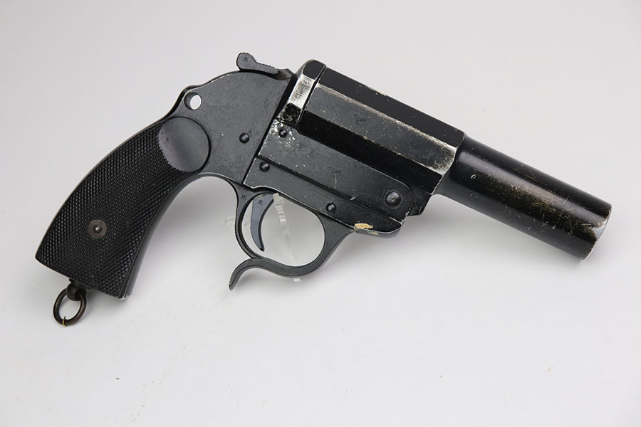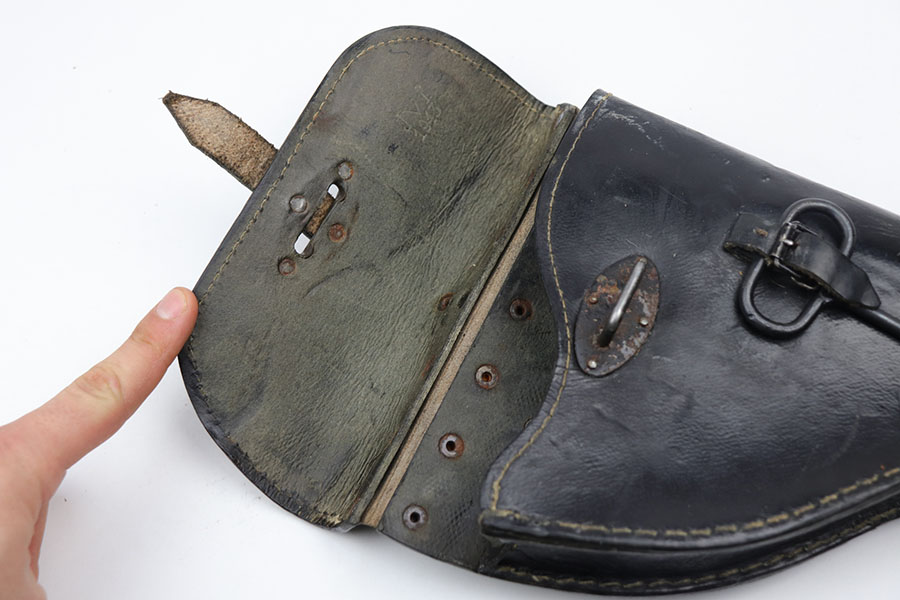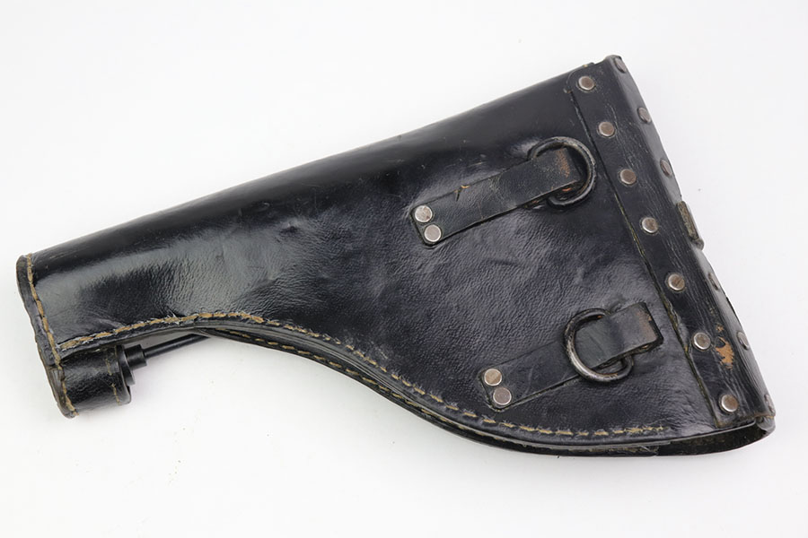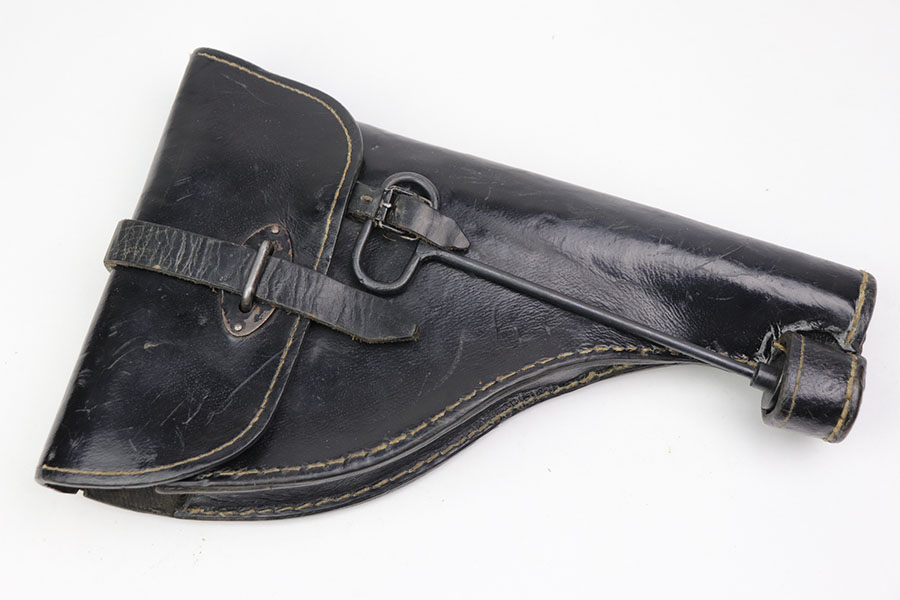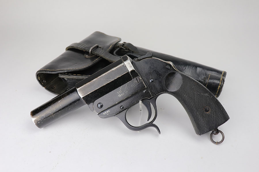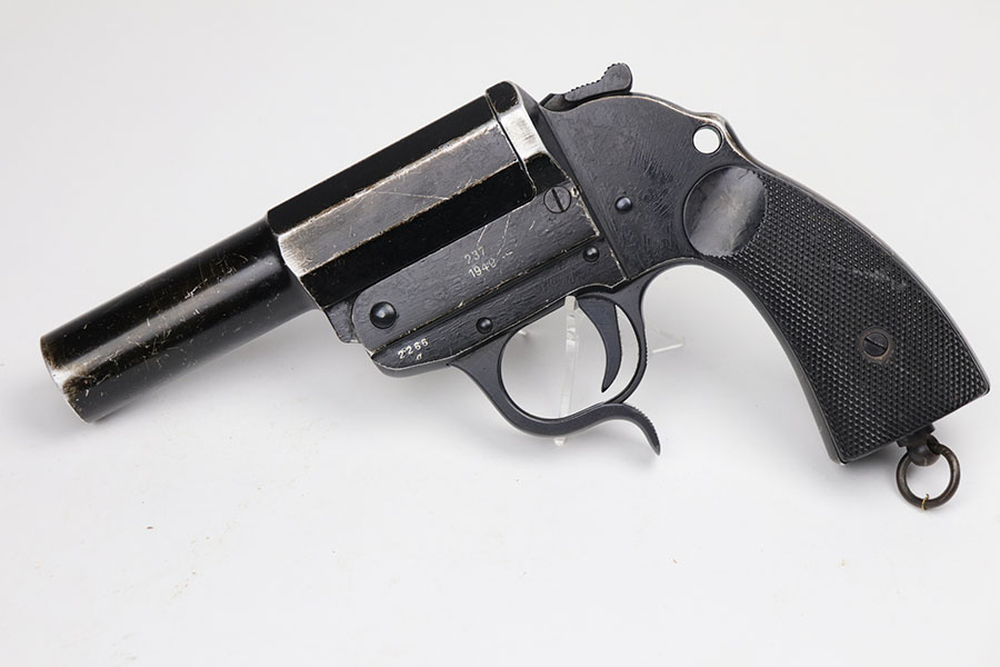1/6/21 – This is an original, early 237 code ERMA flare pistol with an original holster and cleaning rod. The pistol is dated 1940 and in great functional condition. There is some light edge wear and finish loss on the barrel and edges. The holster is excellent and a later style ersatz construction. The interior lid is maker stamped, dated 1943, and waffen proof stamped. The cleaning rod is unmarked with excellent bluing.