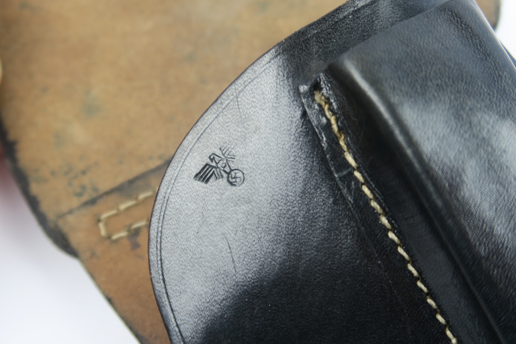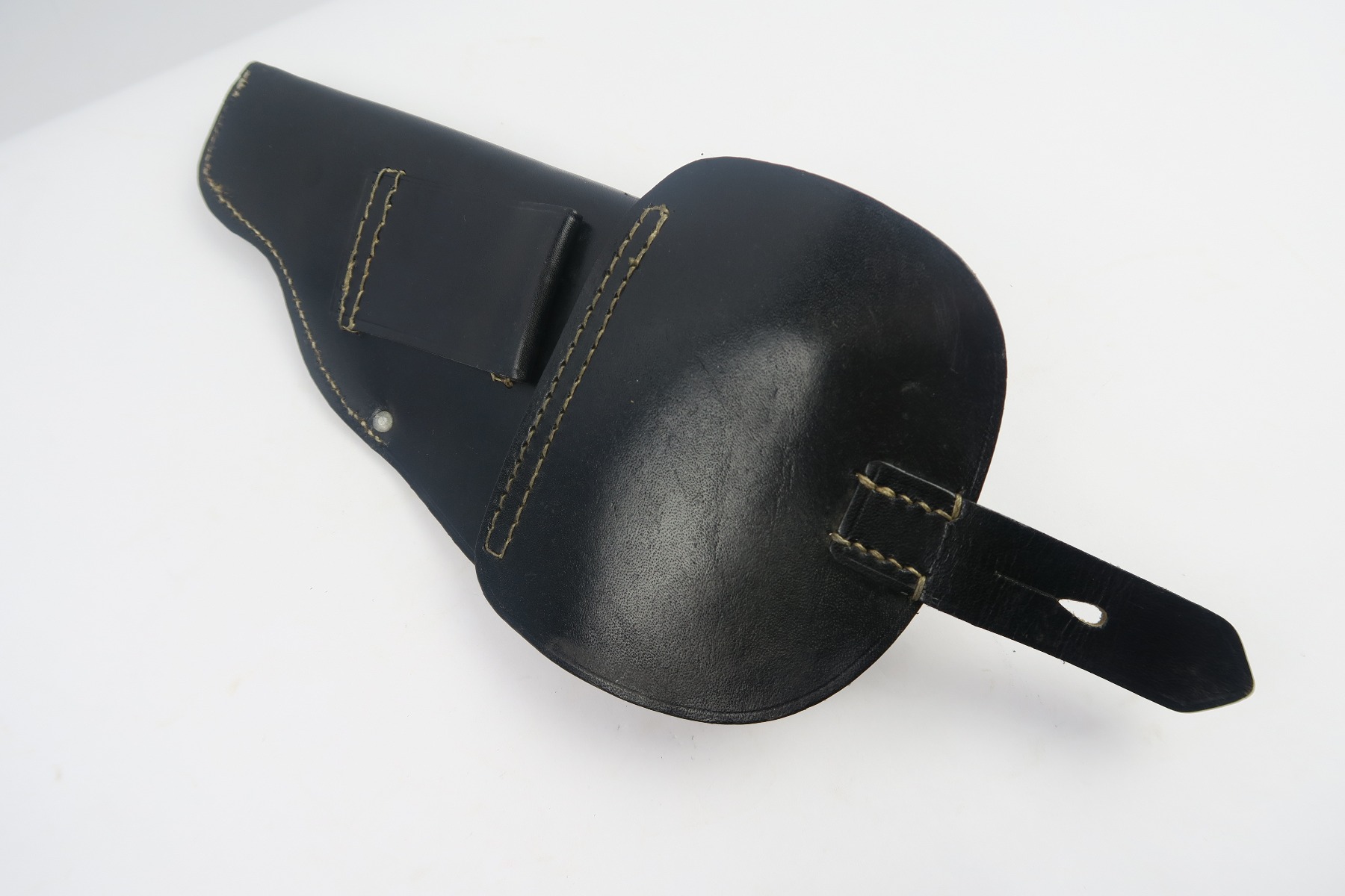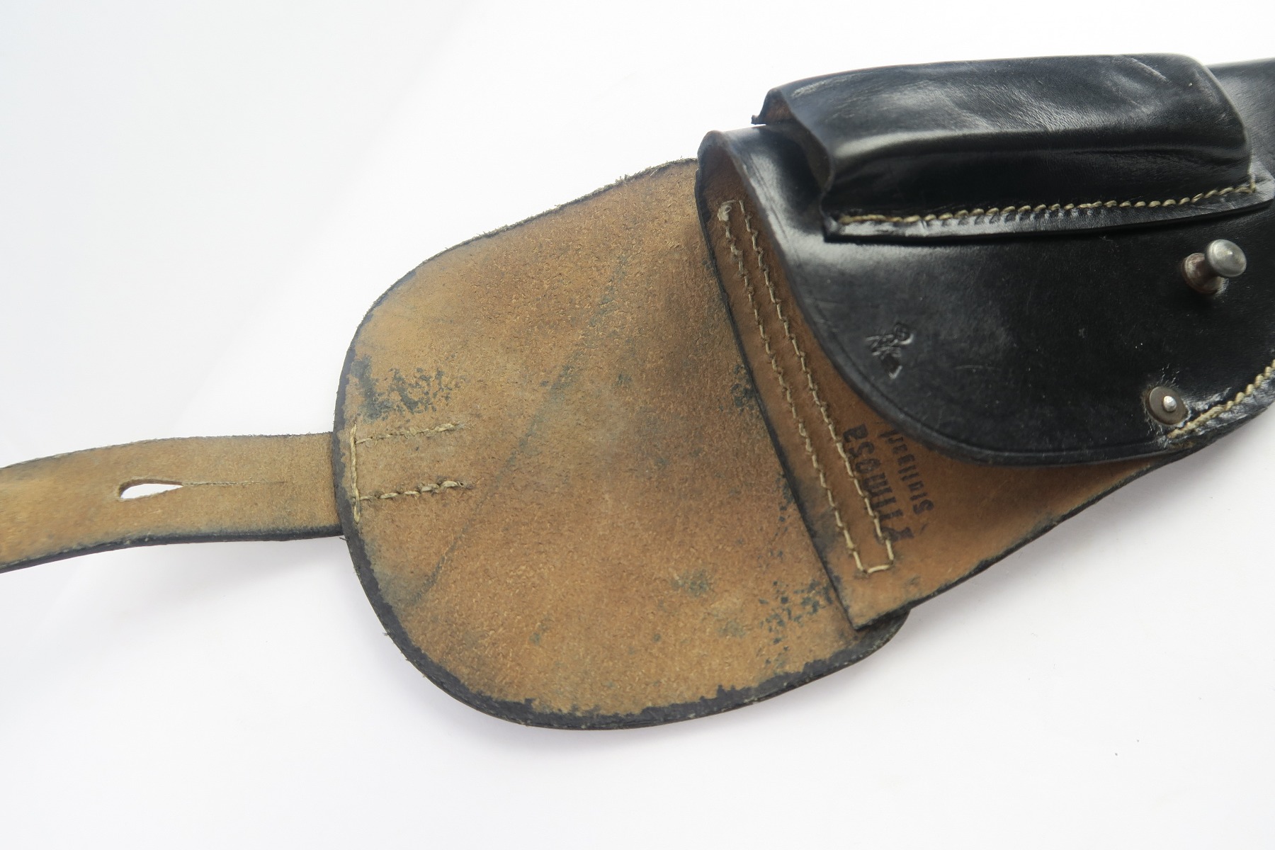 12/28/17 – This is an original black leather holster for a .25 caliber police Axis pistol. Most likely fits a model 1914 or model 1934. The black leather looks unissued and mint. The interior has a black ink stamp “Primosa Stuttgart”. The front leather also has a police eagle stamp. The stitching is all original and excellent. The leather is strong and minty. Guaranteed original.