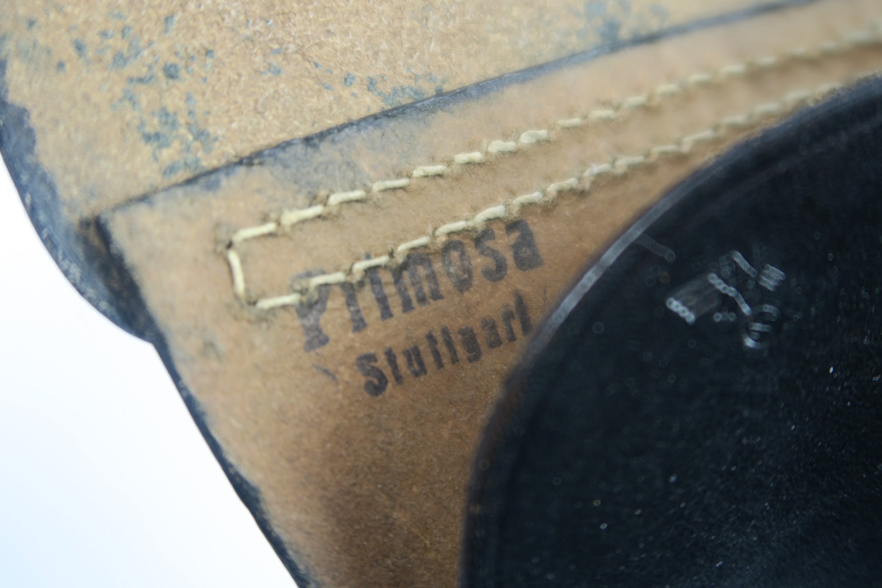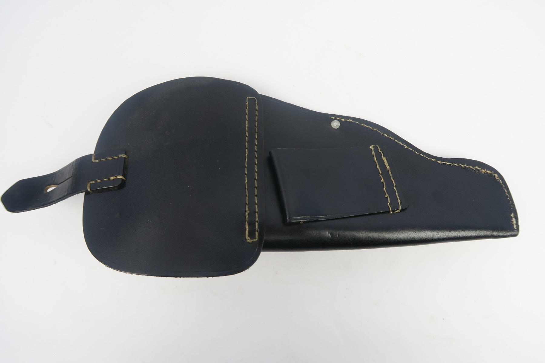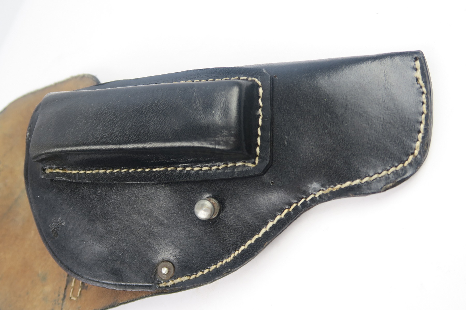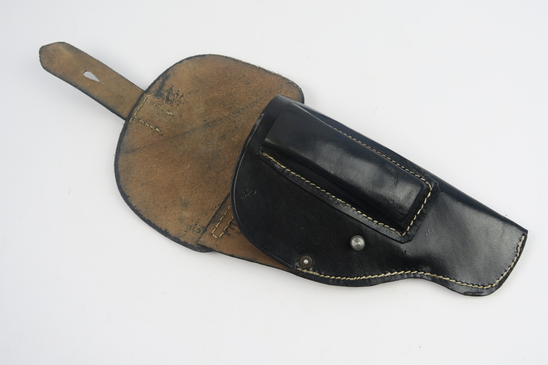 12/28/17 – This is an original black leather holster for a .25 caliber police Axis pistol. Most likely fits a model 1914 or model 1934. The black leather looks unissued and mint. The interior has a black ink stamp “Primosa Stuttgart”. The front leather also has a police eagle stamp. The stitching is all original and excellent. The leather is strong and minty. Guaranteed original.