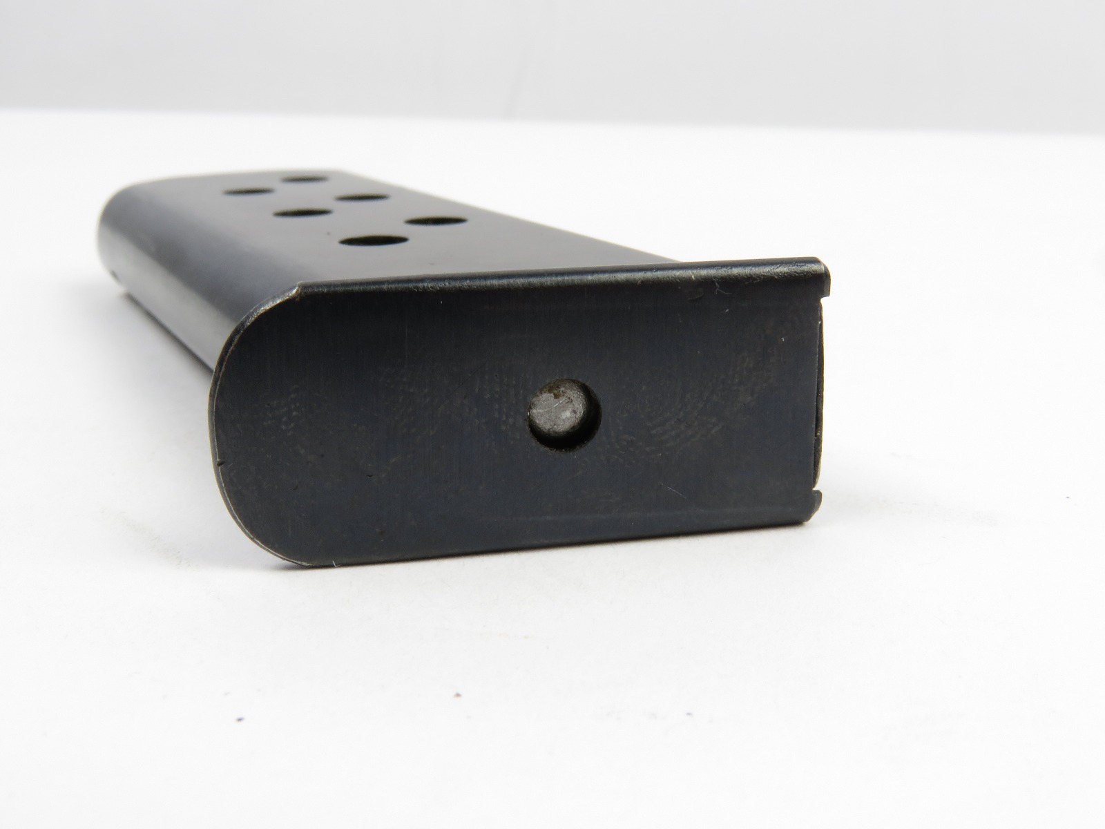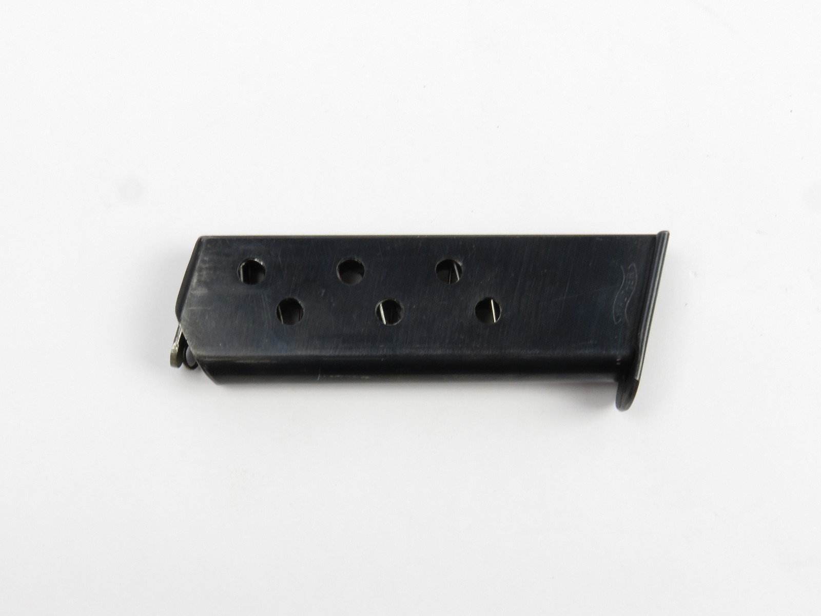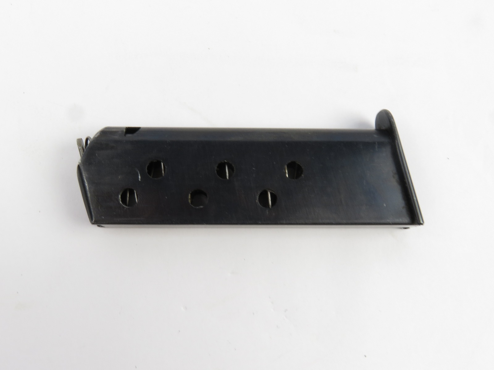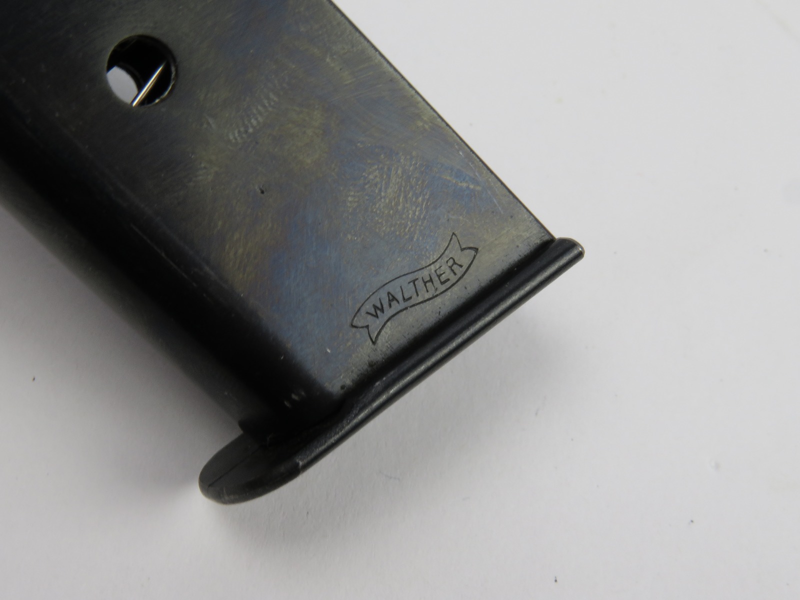 12/20/17 – We had these 25 caliber mags made up for a couple of our customers who wanted a spare, correct looking magazine for their 25 caliber PPK. The factory original magazines were made up of a Model 8 magazine inside a 7.65 magazine. This magazine consists of a REAL pre war Model 8 magazine inserted into a REAL pre war PPK magazine. The holes were made to line up property and all springs, followers, and magazine parts are original factory original Walther pre-war parts. They work properly just like the factory made magazines. This one has a flat base and high polish blued finish.