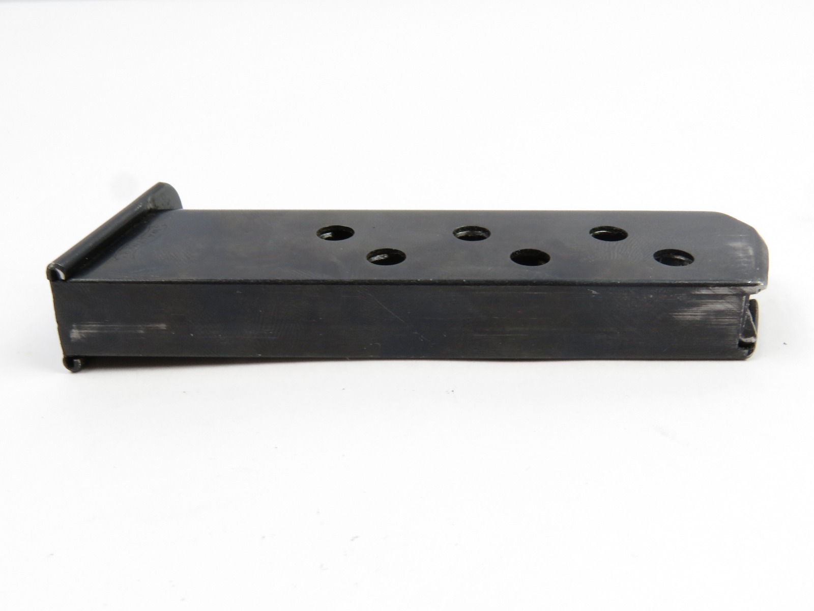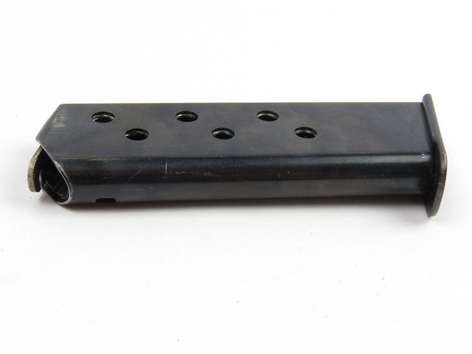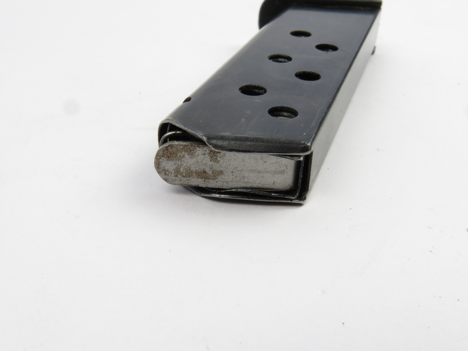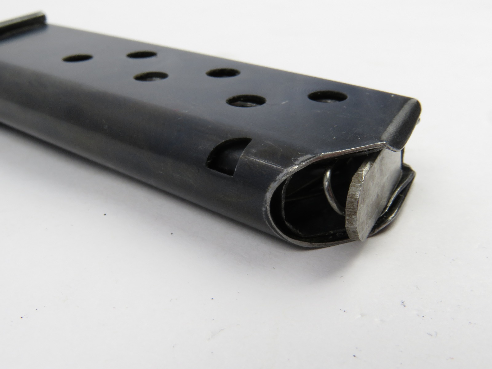 12/20/17 – We had these 25 caliber mags made up for a couple of our customers who wanted a spare, correct looking magazine for their 25 caliber PPK. The factory original magazines were made up of a Model 8 magazine inside a 7.65 magazine. This magazine consists of a REAL pre war Model 8 magazine inserted into a REAL pre war PPK magazine. The holes were made to line up property and all springs, followers, and magazine parts are original factory original Walther pre-war parts. They work properly just like the factory made magazines. This one has a flat base and high polish blued finish.