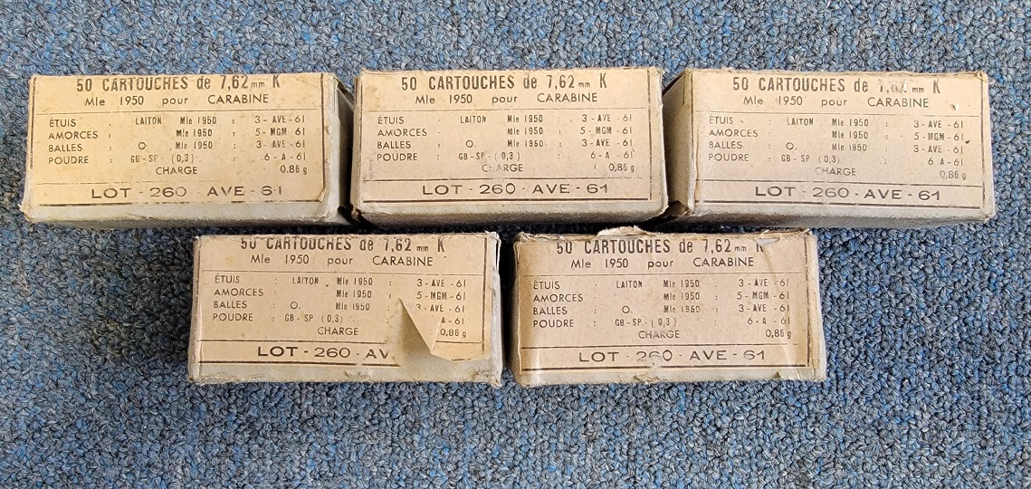 8/7/23 – This is 250 rounds of boxed 7.62mm Carbine rifle ammunition. French production from the 1960’s in the original boxes, as shown. One of the boxes is slightly torn and broken open so we could photo the rounds. All rounds are in excellent condition. Our understanding is this is corrosive .30 carbine ammo, so remember to clean your rifle after use!