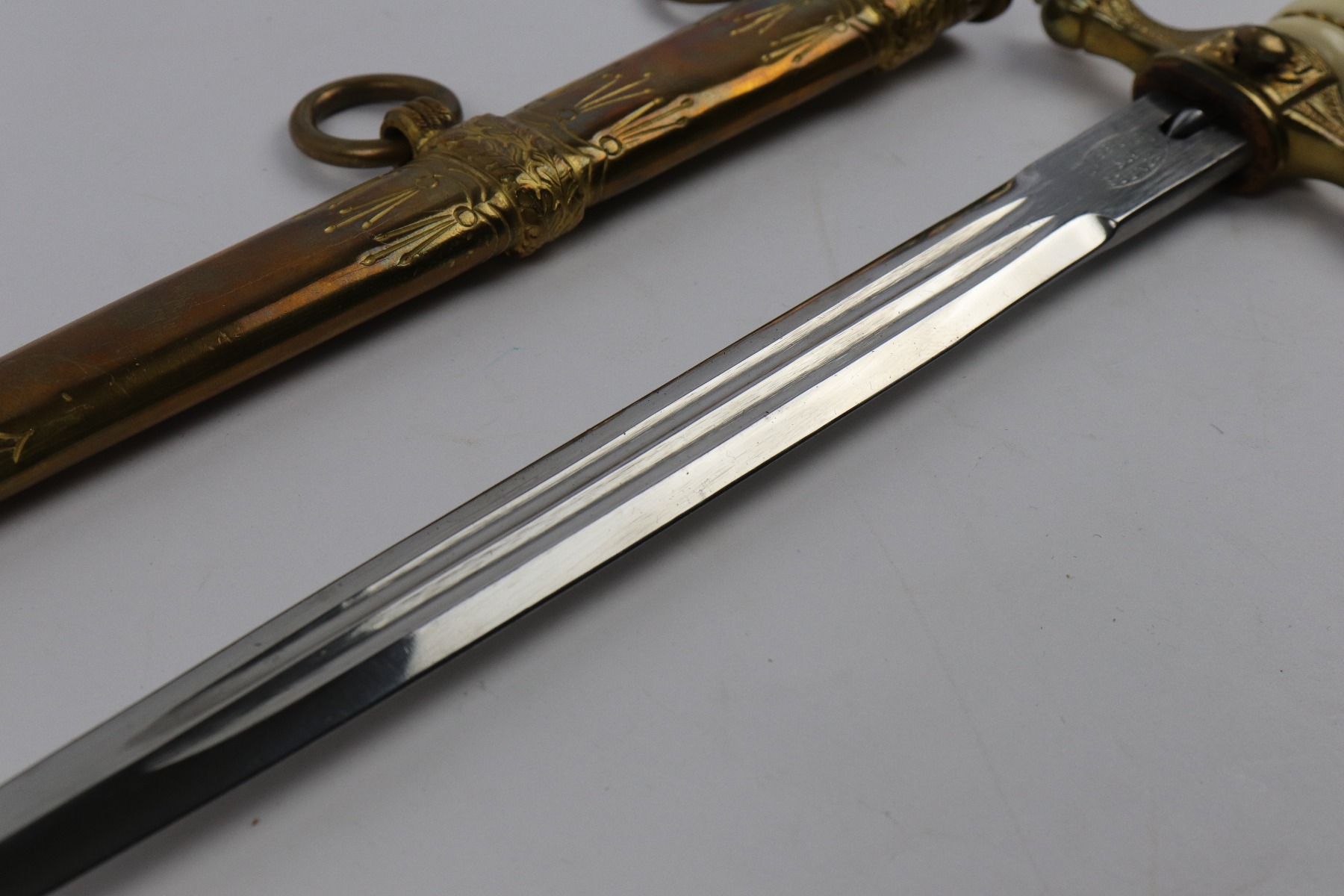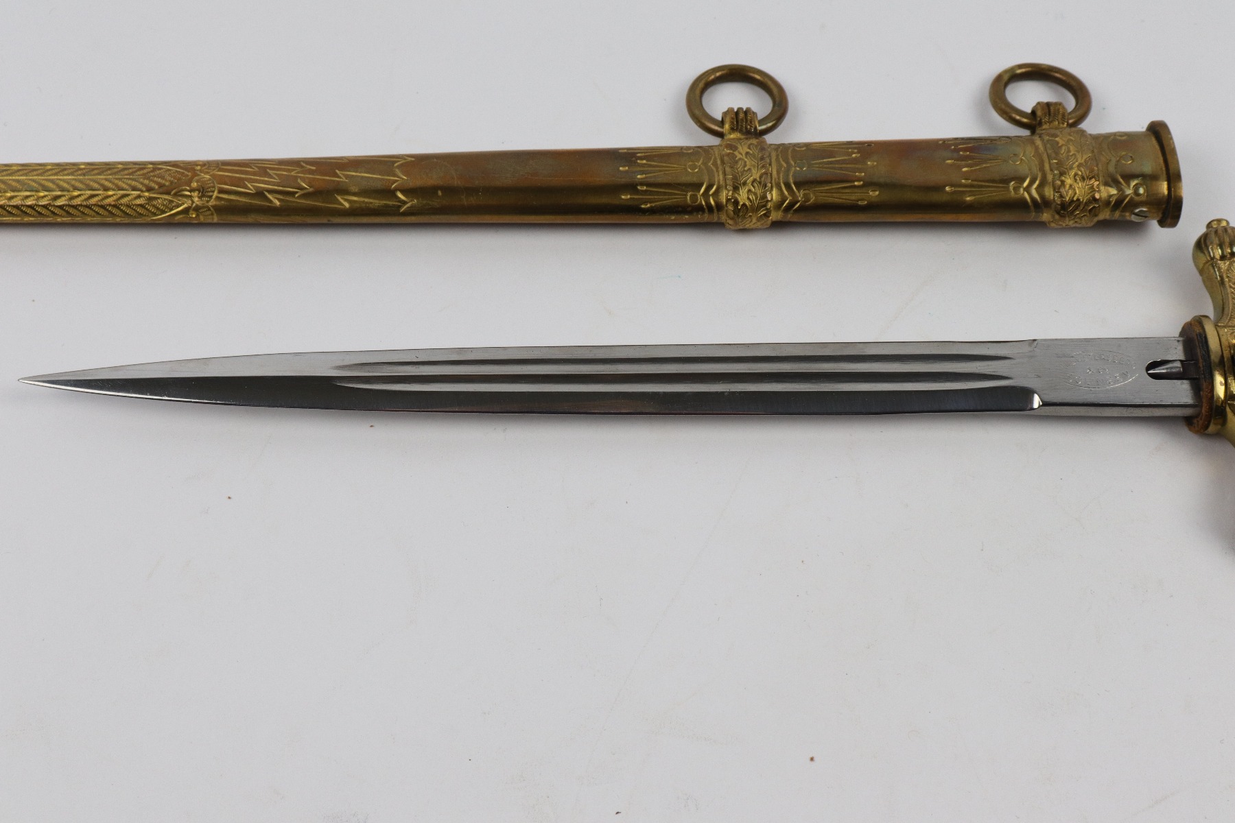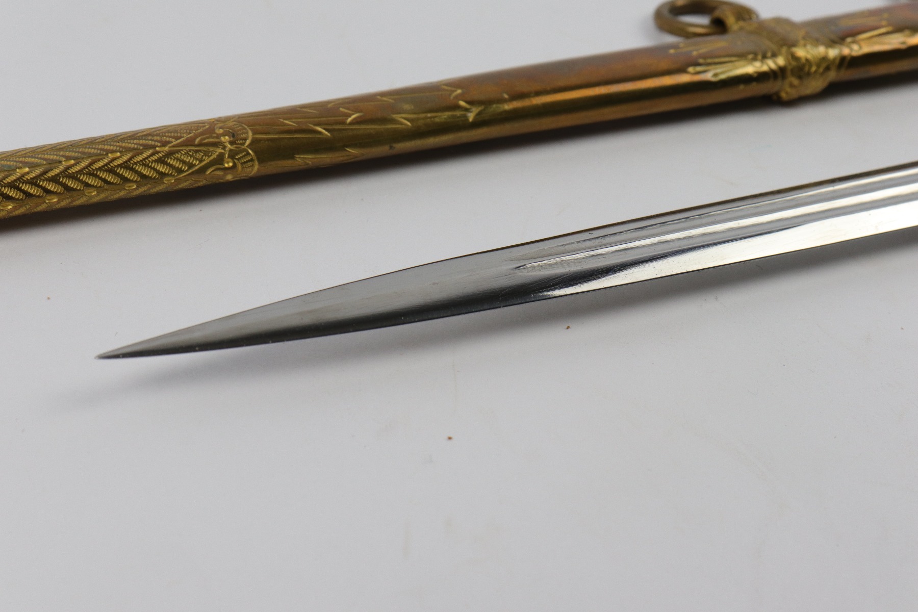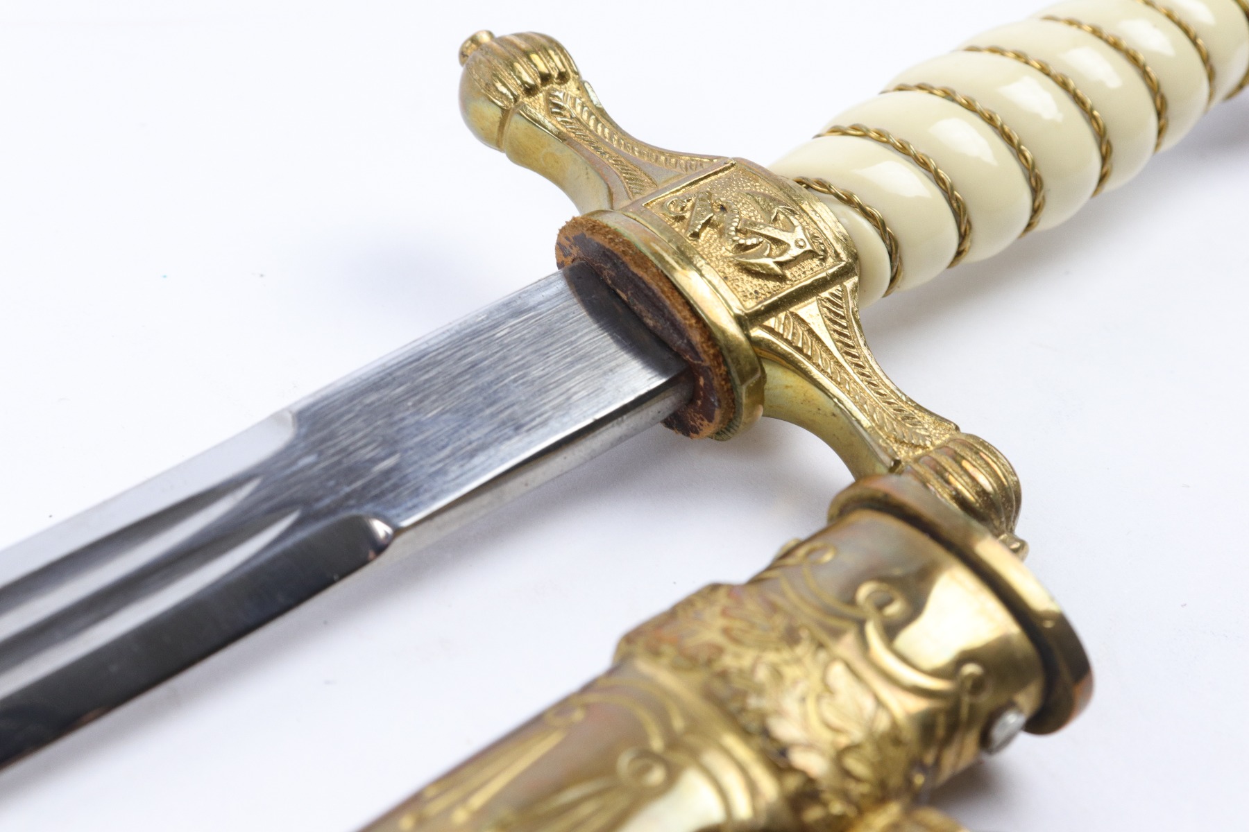4/5/18 – This is an original WW2 production 2nd variation German Navy dagger. The dagger has a minty handle and blade with no notable flaws or signs of sharpening. There are barely even any sheath scratches on the blade. The blade is maker stamped with no other markings. The scabbard is equally as minty with only one very minor dent. Guaranteed original.