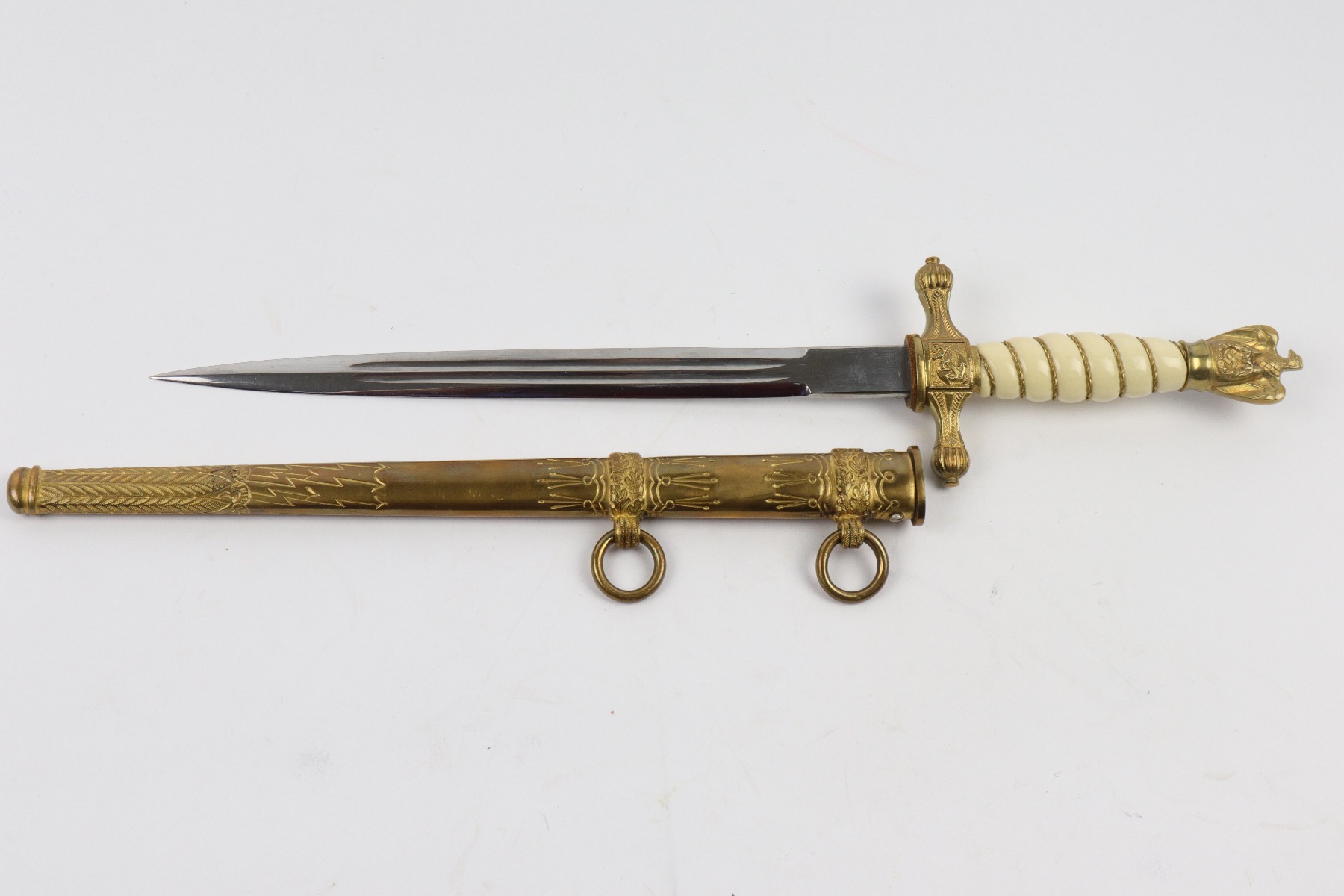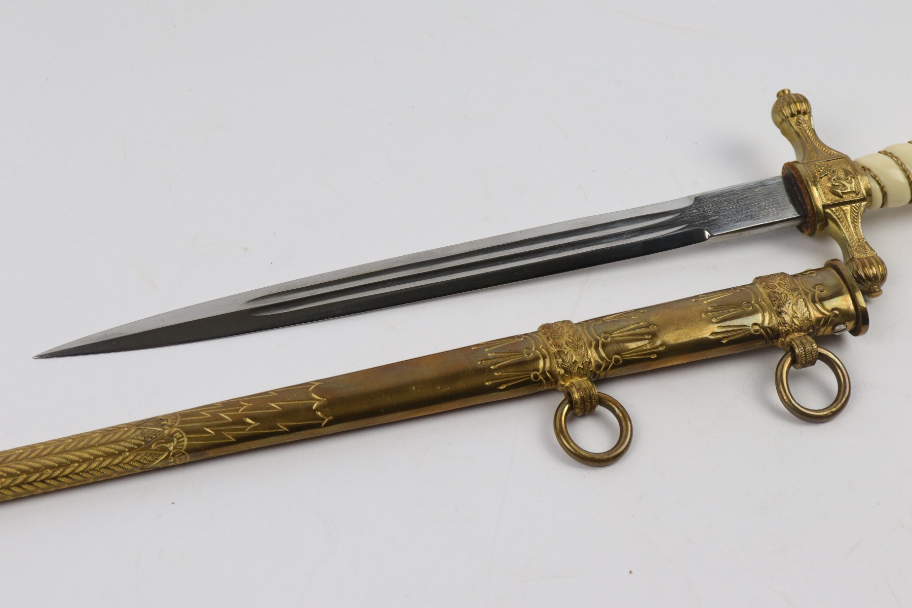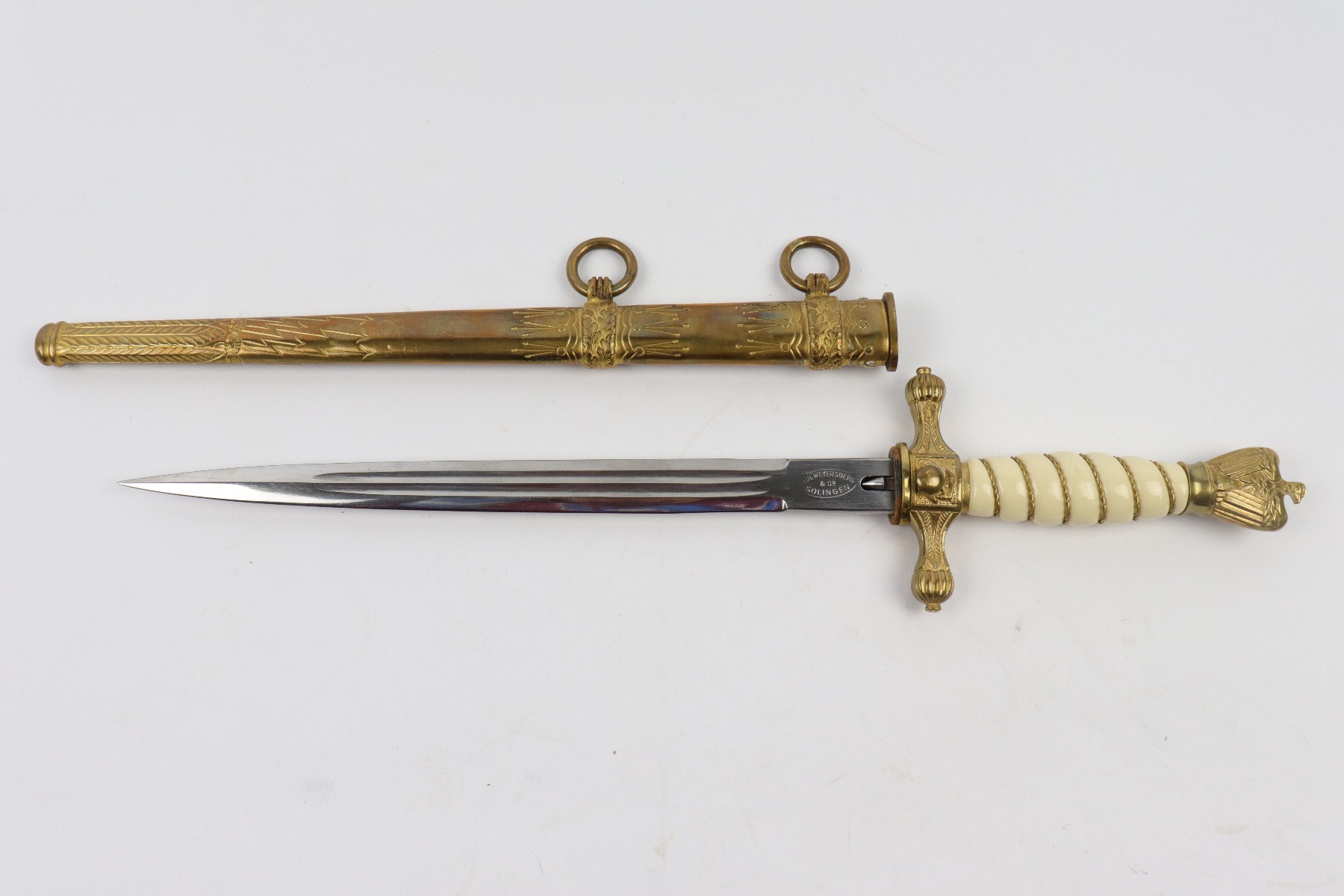 4/5/18 – This is an original WW2 production 2nd variation German Navy dagger. The dagger has a minty handle and blade with no notable flaws or signs of sharpening. There are barely even any sheath scratches on the blade. The blade is maker stamped with no other markings. The scabbard is equally as minty with only one very minor dent. Guaranteed original.