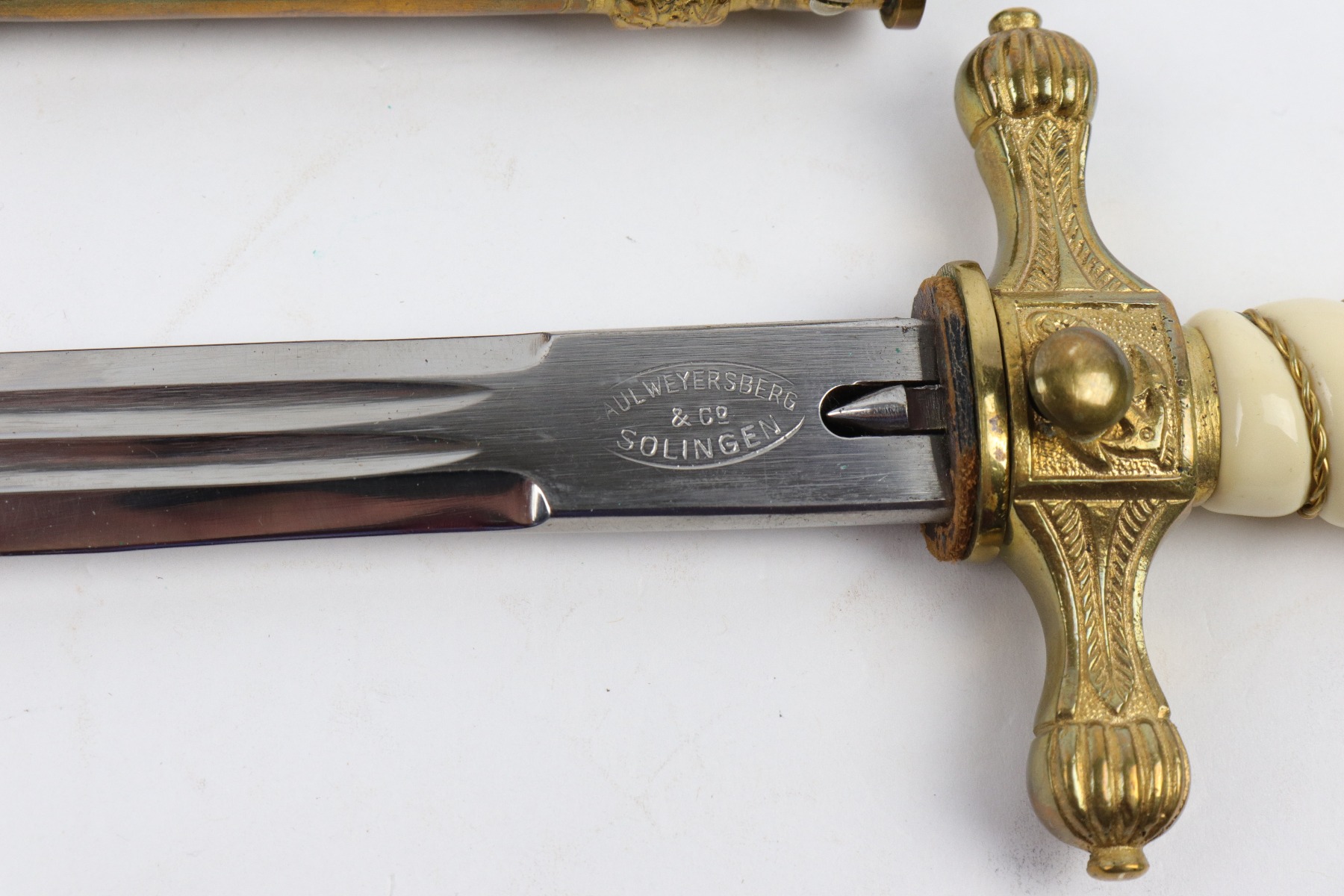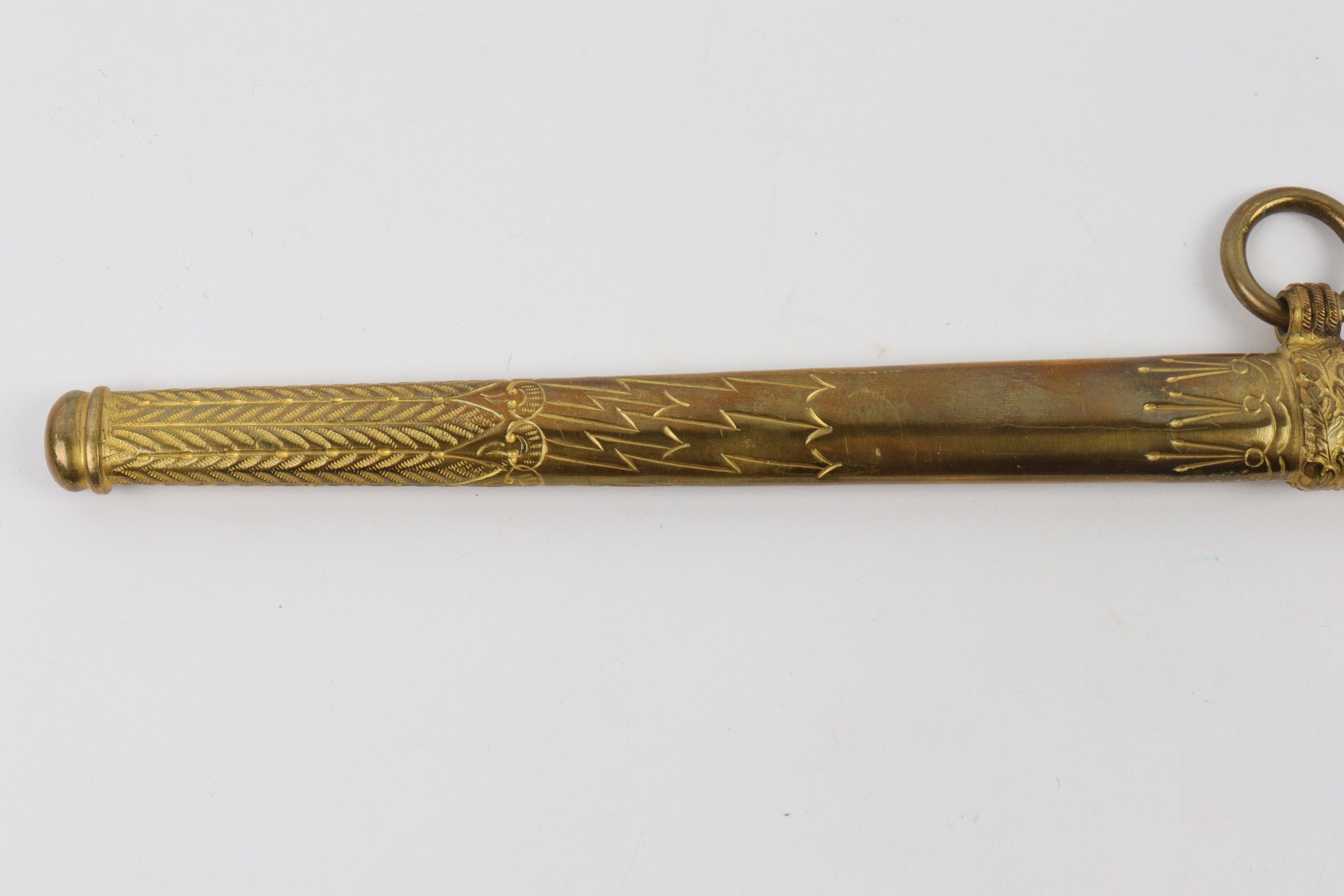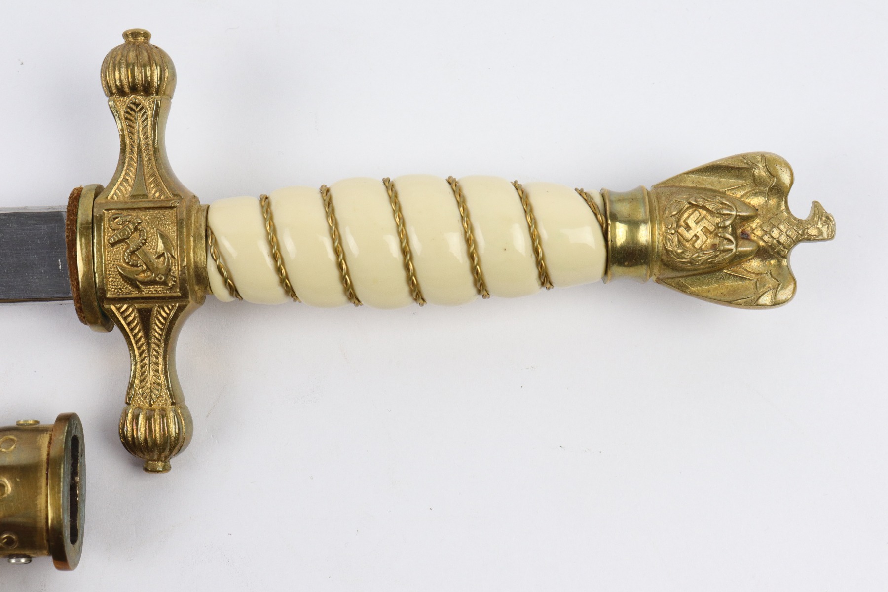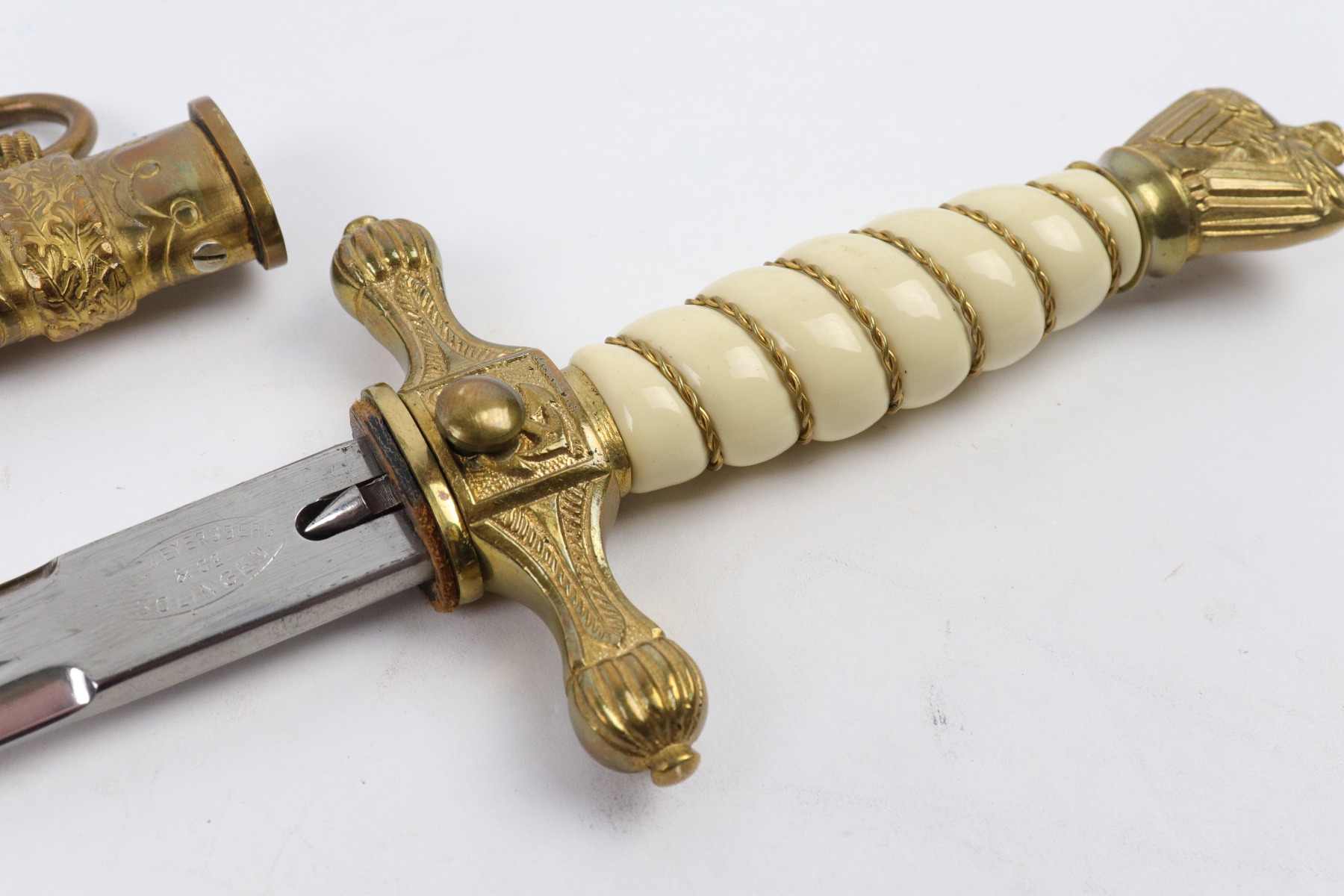 4/5/18 – This is an original WW2 production 2nd variation German Navy dagger. The dagger has a minty handle and blade with no notable flaws or signs of sharpening. There are barely even any sheath scratches on the blade. The blade is maker stamped with no other markings. The scabbard is equally as minty with only one very minor dent. Guaranteed original.