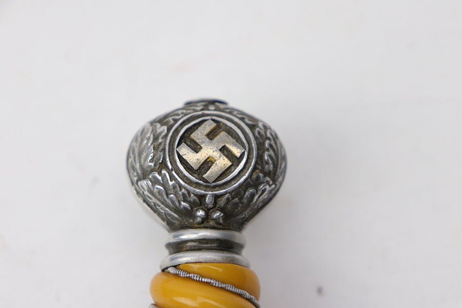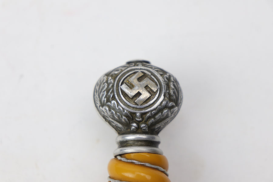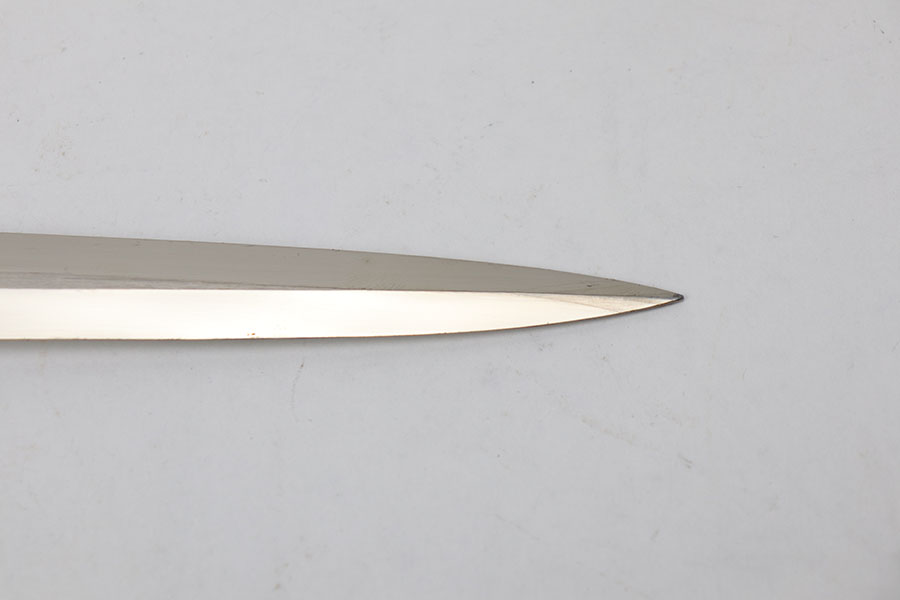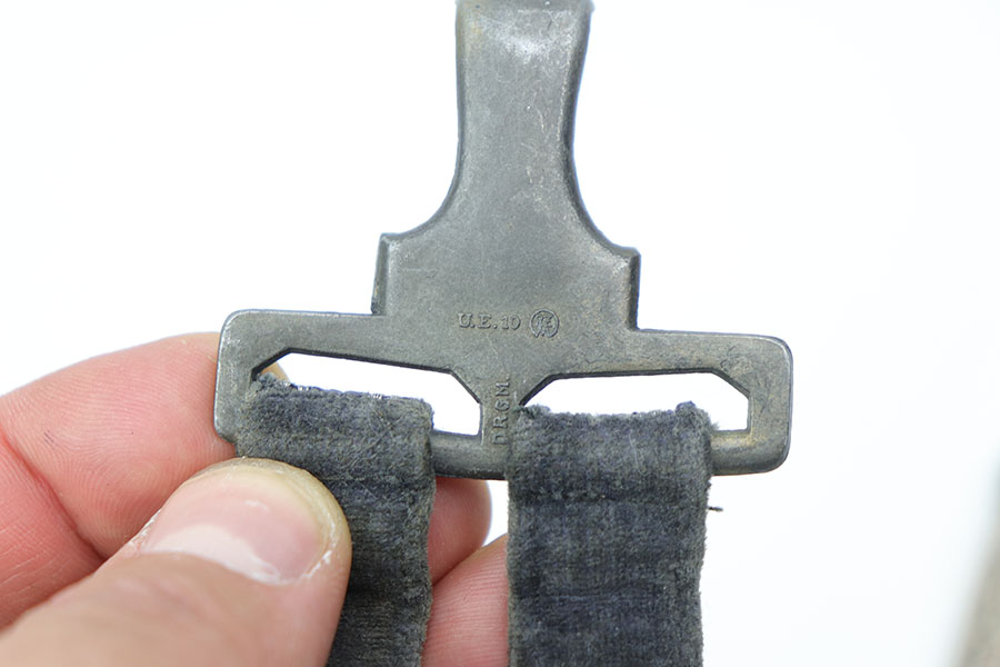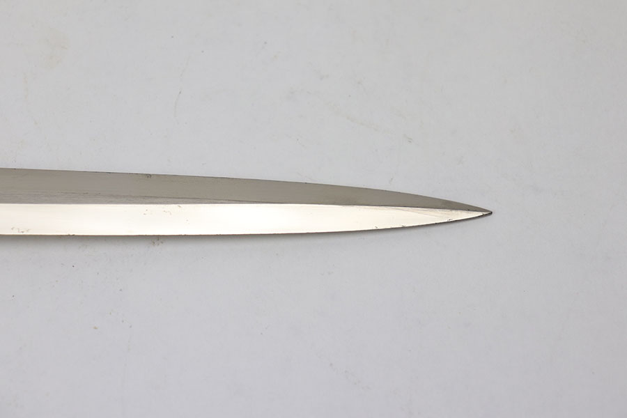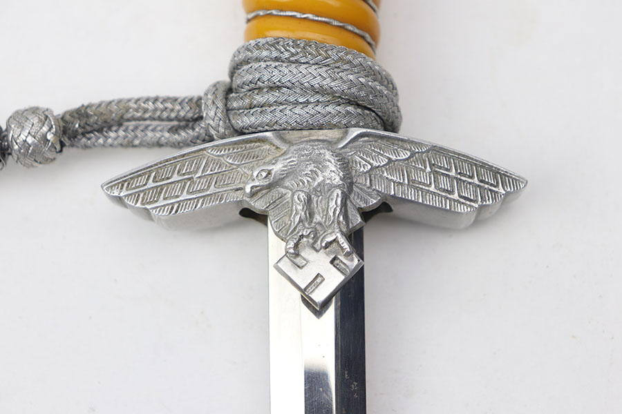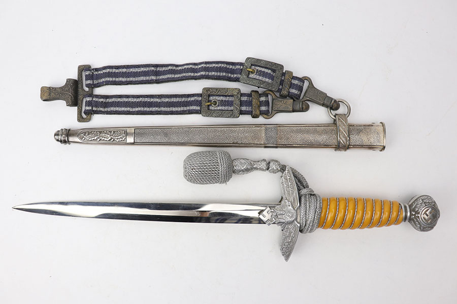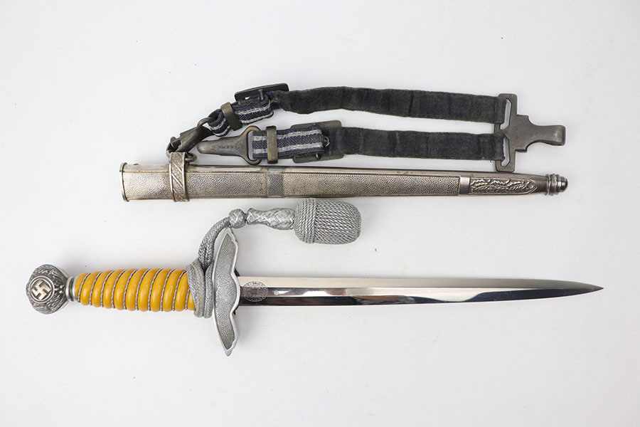 8/13/20 – This is a 2nd Model Luftwaffe Dagger with scabbard. The dagger is stamped Paul Weyersberg & Co Solingen with maker mark on the blade. There is very minor wear on the blade. The clasp is stamped D.R.G.M. and has a nice patina. The scabbard is missing a clasp and ring but is otherwise in great condition. The cord is still intact with the exception of the missing attachment to the scabbard. The hilt and handle are excellent. Overall excellent condition.