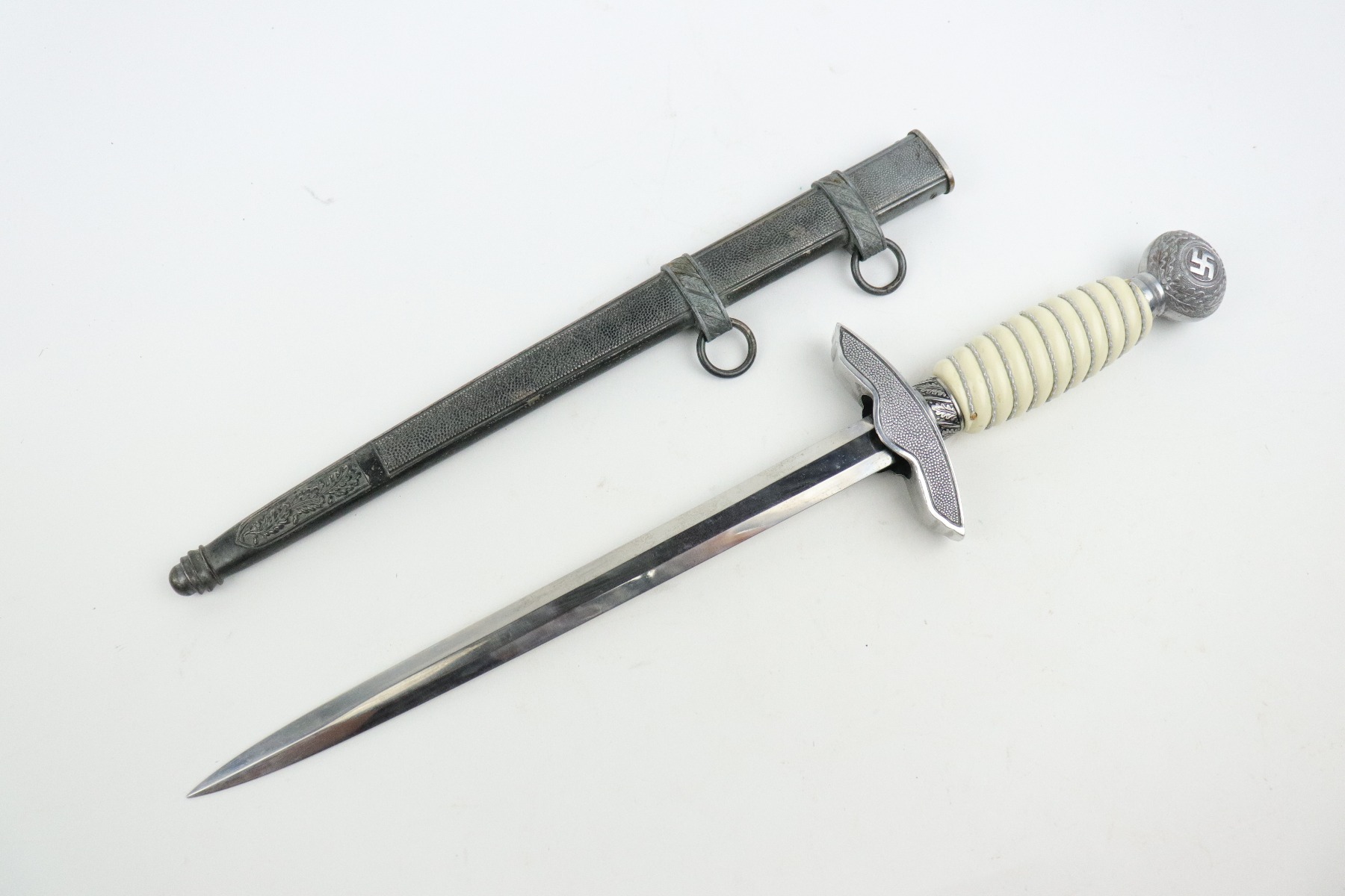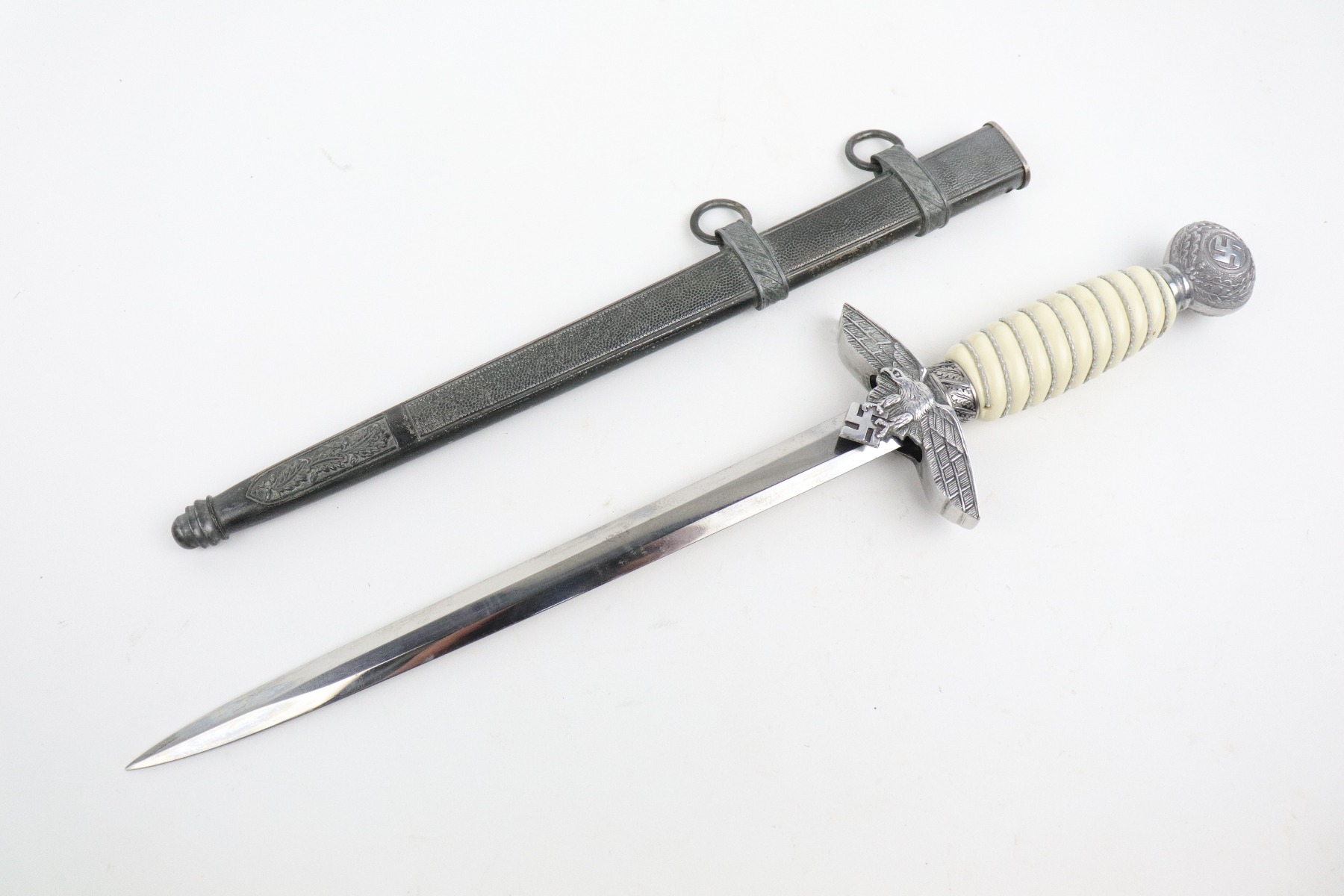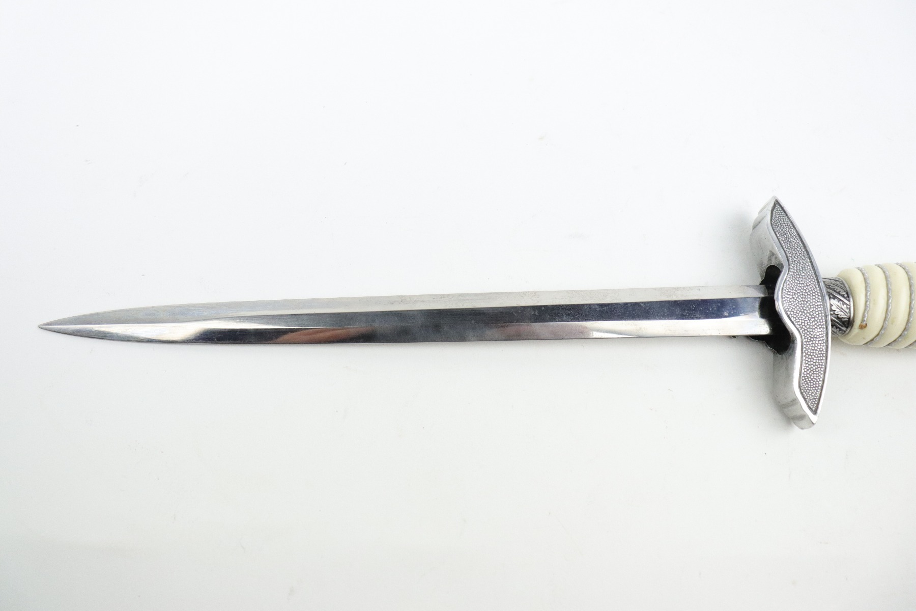 8/18/20 – This is an original 2nd Model Nazi Luftwaffe Dagger with the original scabbard. Overall, it is in excellent condition. The blade is shiny and in tact, but there are small dots of minor discoloration throughout. The scabbard is also in tact, but there are also areas of spotty light discoloration throughout, especially along the sides. The leather stopper at the base of the blade is in tact. There is no makers mark.
