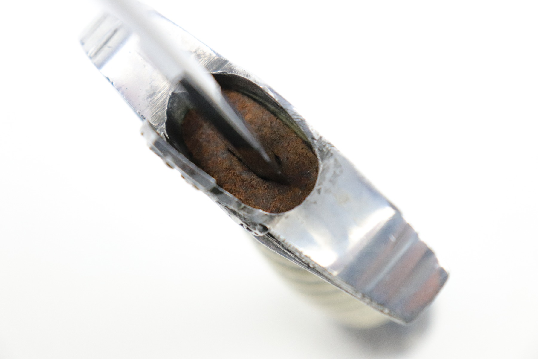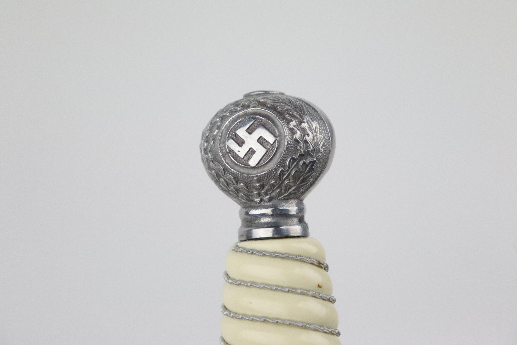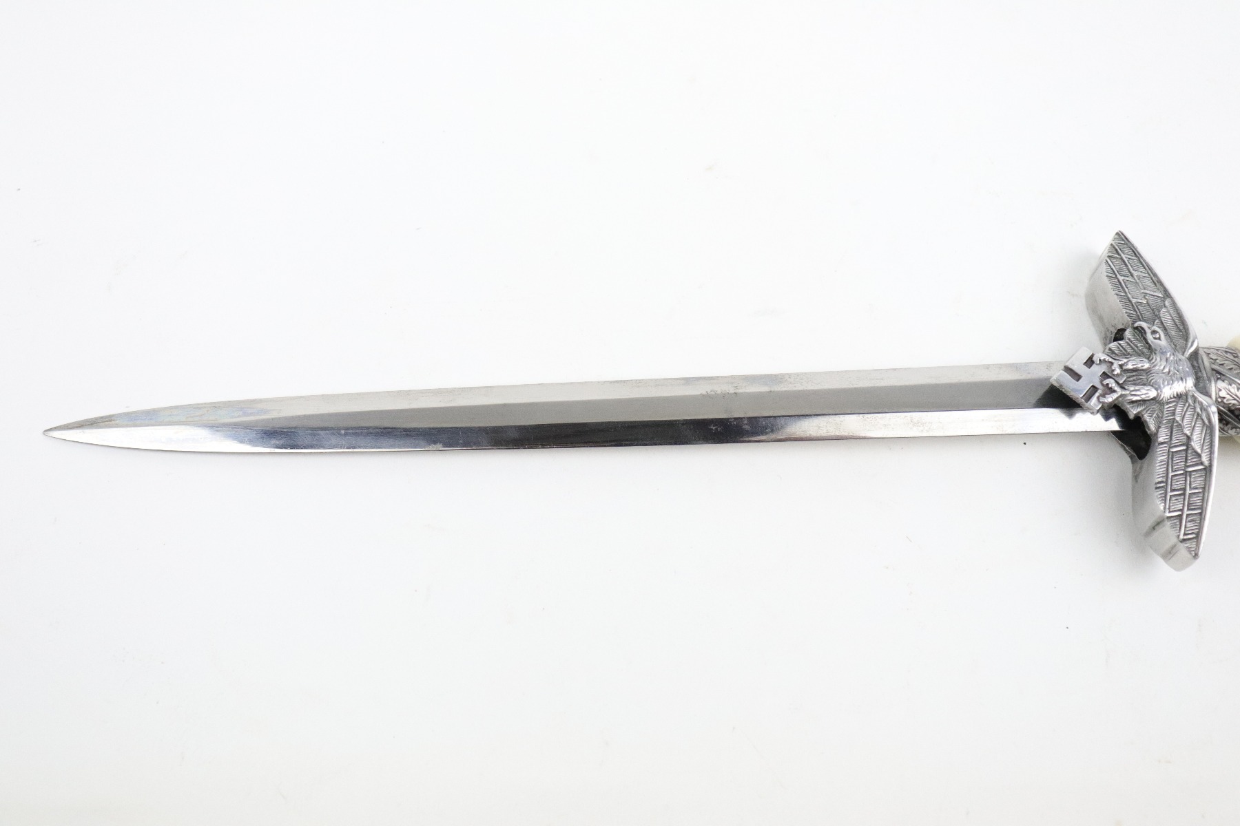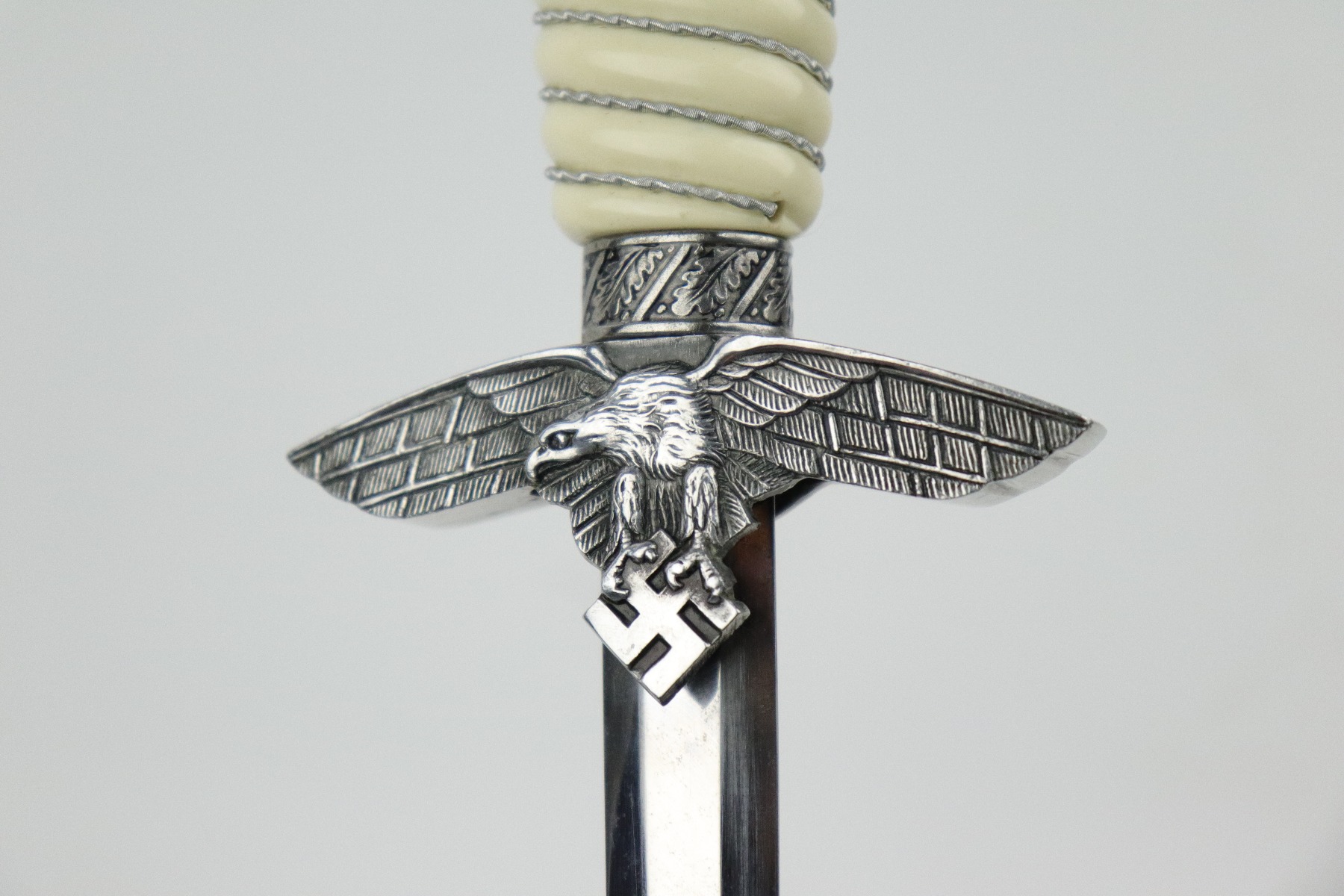 8/18/20 – This is an original 2nd Model Nazi Luftwaffe Dagger with the original scabbard. Overall, it is in excellent condition. The blade is shiny and in tact, but there are small dots of minor discoloration throughout. The scabbard is also in tact, but there are also areas of spotty light discoloration throughout, especially along the sides. The leather stopper at the base of the blade is in tact. There is no makers mark.
