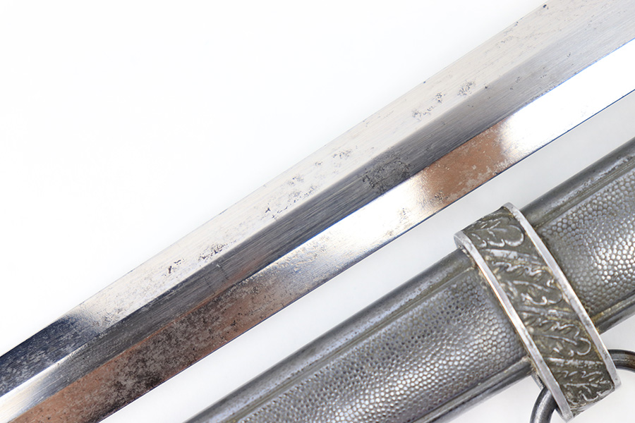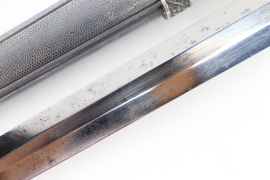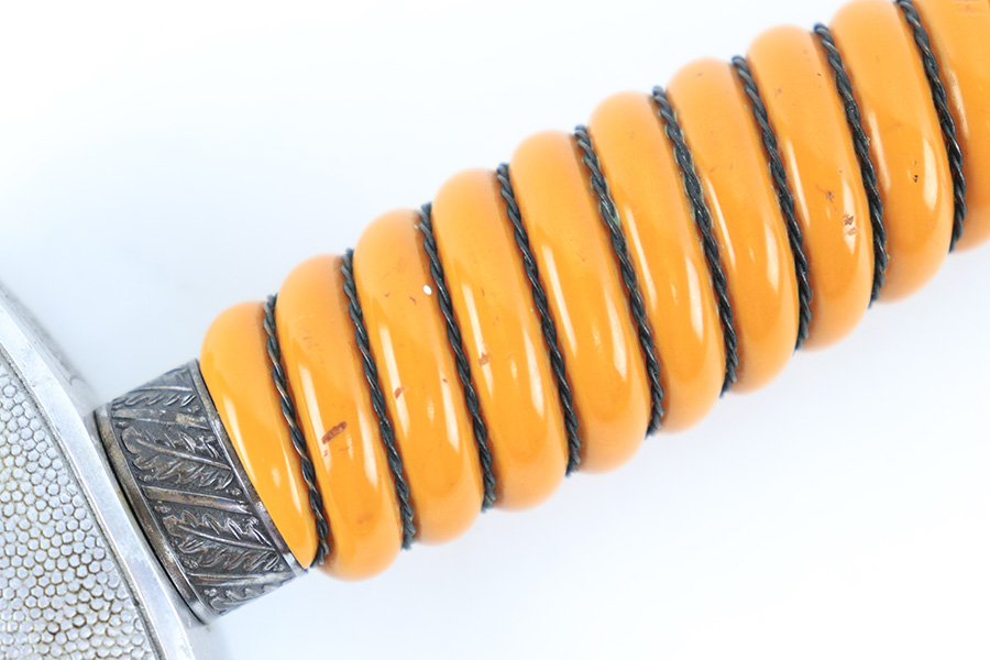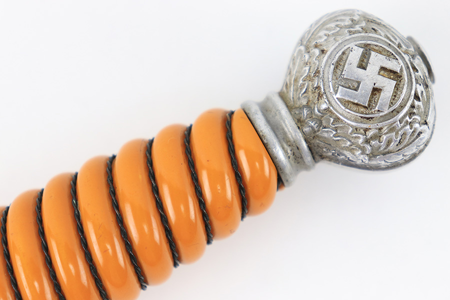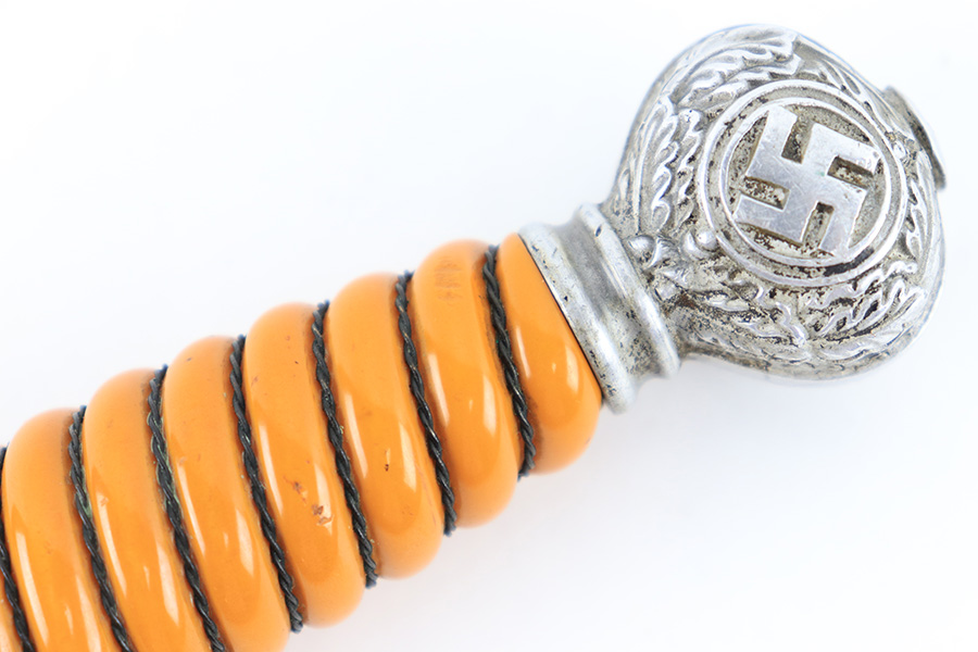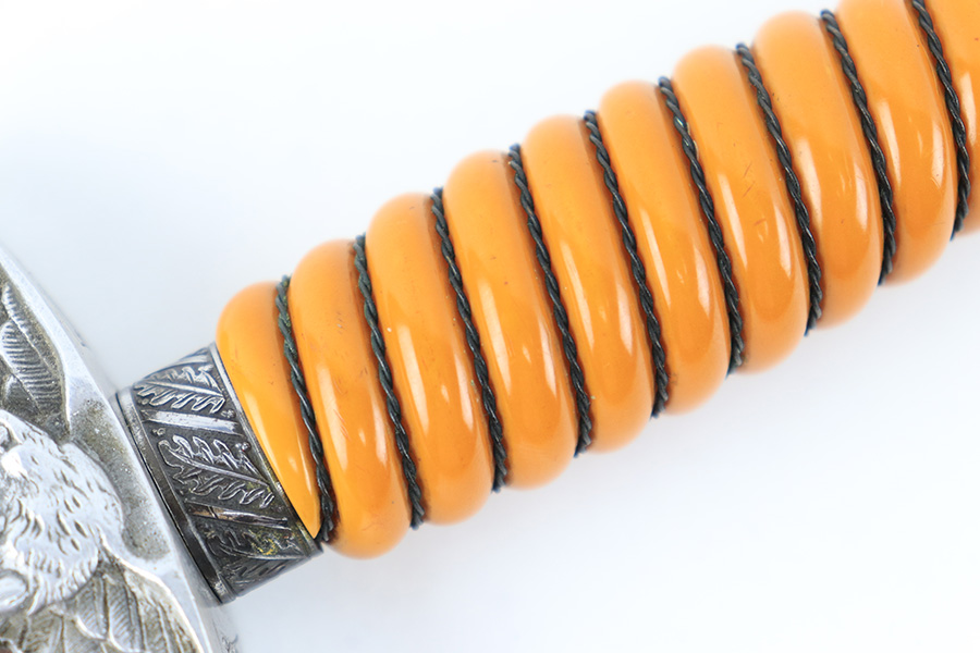 8/15/23 – This is an original WW2 production Luftwaffe dagger by SMF. The dagger is a 2nd model, wartime production with a maker marked blade that’s also Luftwaffe proof stamped. The Luftwaffe proof is located just above the maker marking, and looks like it’s a faint double-struck stamp. The markings are still clearly visible, as shown. The blade has some mild spotty discoloration throughout, and a few small spots of pin-pricking or beginning signs of pitting. These aren’t rough to the touch, however. The edges are unsharpened and in great shape. An original leather stopper is still intact. The cross guard and pommel are aluminum was surface patina and typical edge wear throughout. The orange bakelite handle has a few mild imperfections but no cracks or chips, and a tightly wound chord. Comes with an original scabbard that’s in great overall condition.