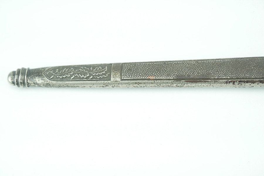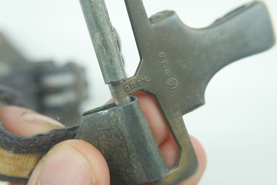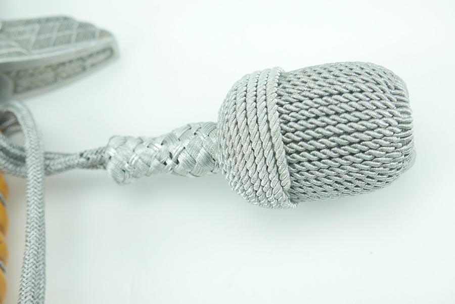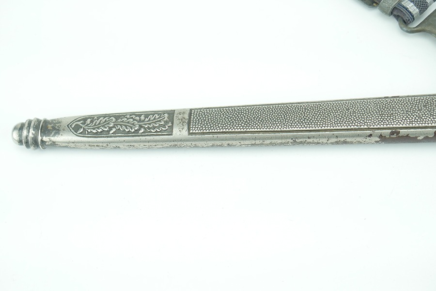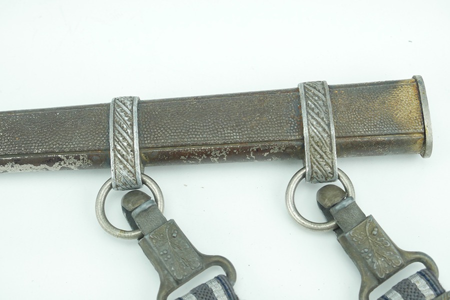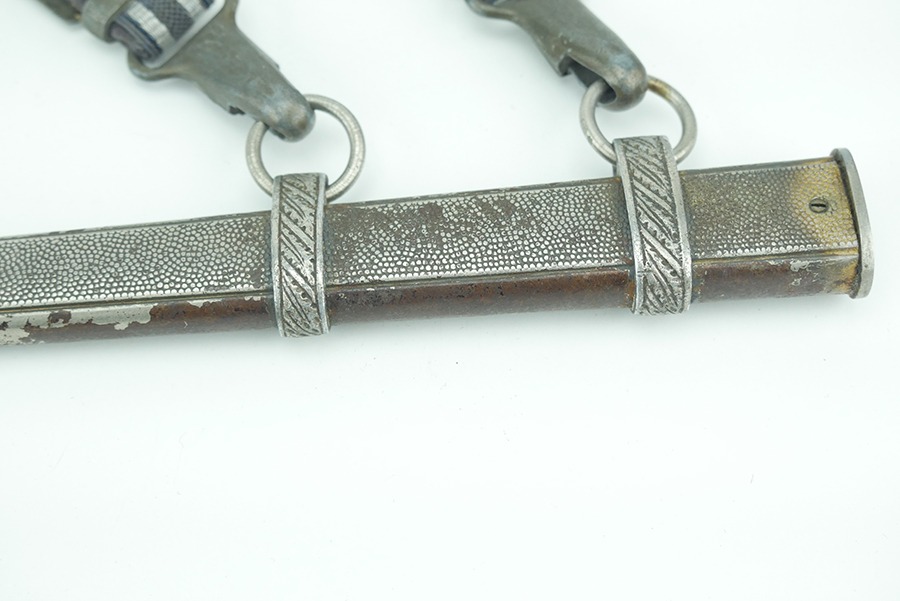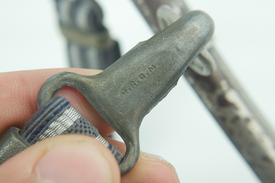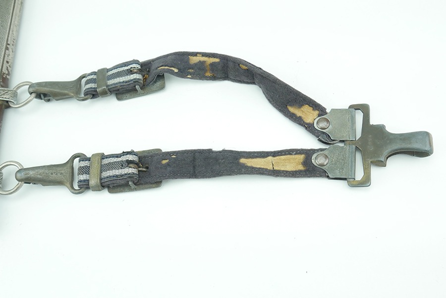 10/31/24 – This is a very nice example of a 2nd model Luftwaffe dagger made by F.W. Holler in Solingen Germany. Both the scabbard and the handle have no dents. The orange celluloid grip does have a few nicks and still maintains one complete wire wrap, the other wire wrap is missing. The blade shows standard wear from the scabbard and does exhibit gray shadowing throughout. The edge of the blade has no chips and does not show any signs of being sharpened. This dagger comes with it’s original Luftwaffe hanger, this hanger being the more sought after “deluxe” model that would have cost the soldier more than the standard hanger. The buckles on the hanger are embellished with oakleaves. The fabric of the hanger has very minor fraying and still has it’s original felt backing. However, some of the felt backing is missing. This dagger also comes with it’s original portepee, the portepee does have some minor fraying near the knot.
