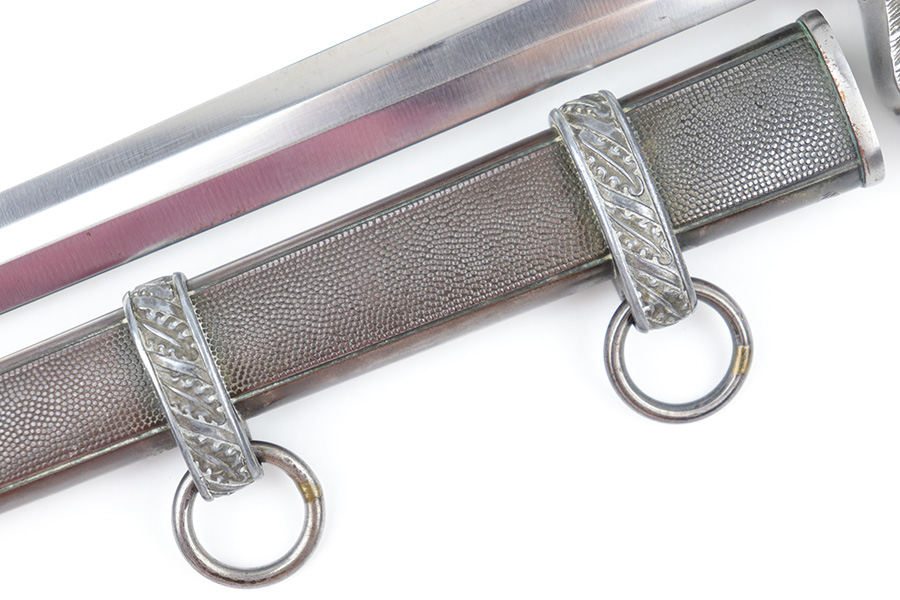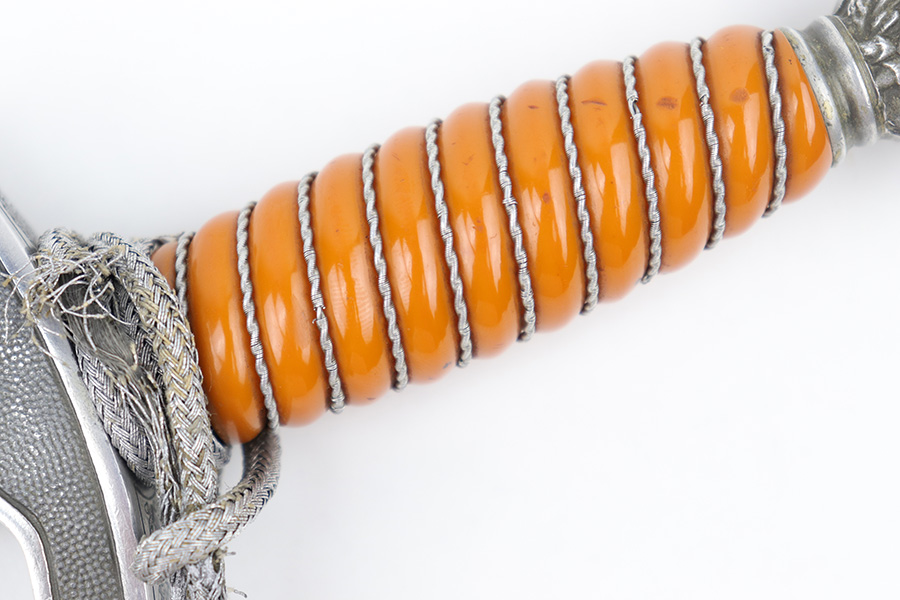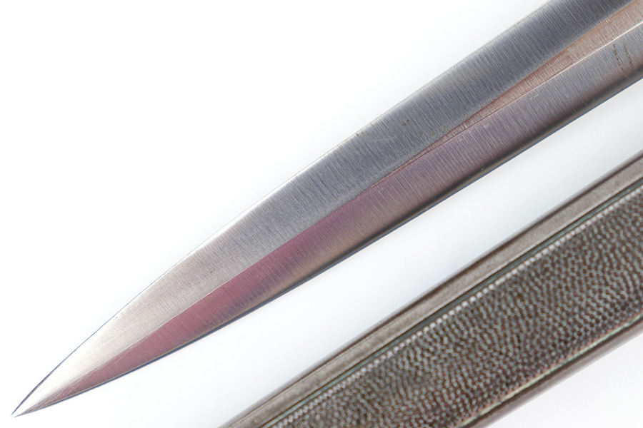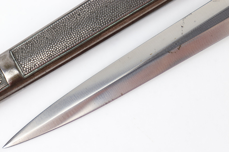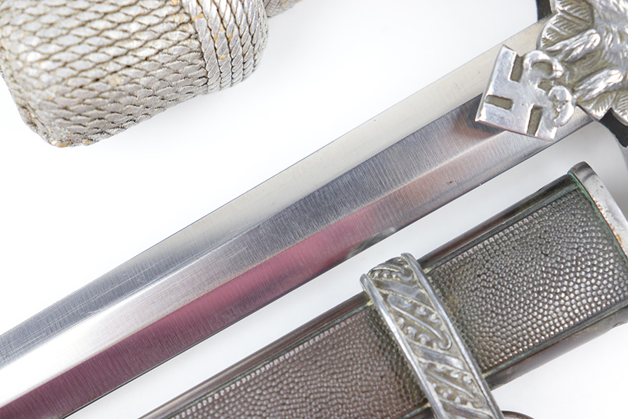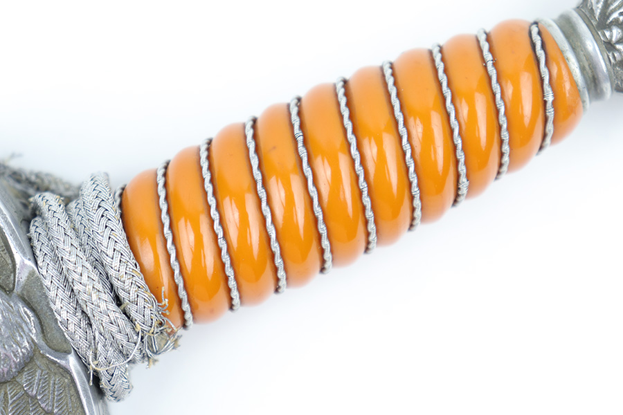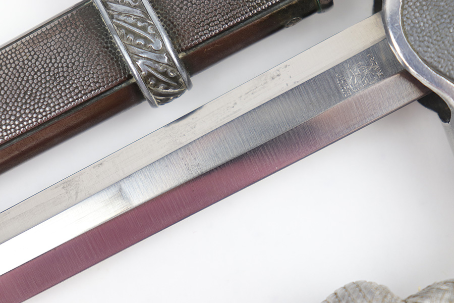 7/13/23 – This is an excellent example of a 2nd model Luftwaffe Officer’s Dagger from WW2. The dagger comes with an original silver portepee and a receipt from Thomas Wittmann (dagger expert) dated 2020. The dagger features an excellent, clean blade with cross graining visible throughout. There are some mild surface scratches from scabbard rub, and some very light freckling of surface oxidation / discoloration. Maker marked by Eickhorn on one side. The hand guard and pommel have normal surface patina throughout and high edge wear. The burnt orange bakelite handle has a tightly wrapped chord and has no cracks or chips. The portepee has some mild fraying along the chord, and some mild looseness on the knot, but overall in good condition. The scabbard is in great shape with no dents or major issues.