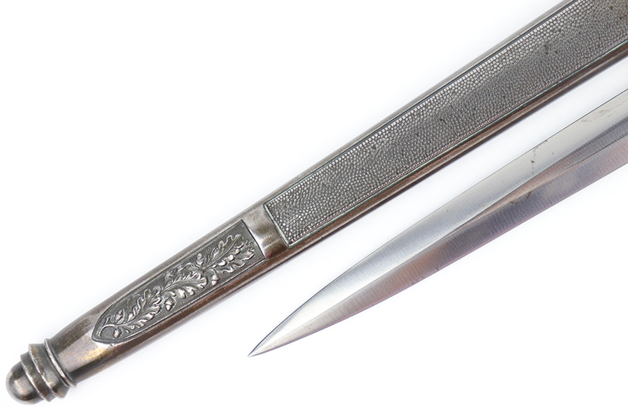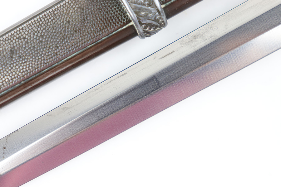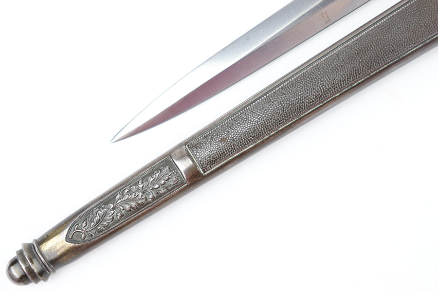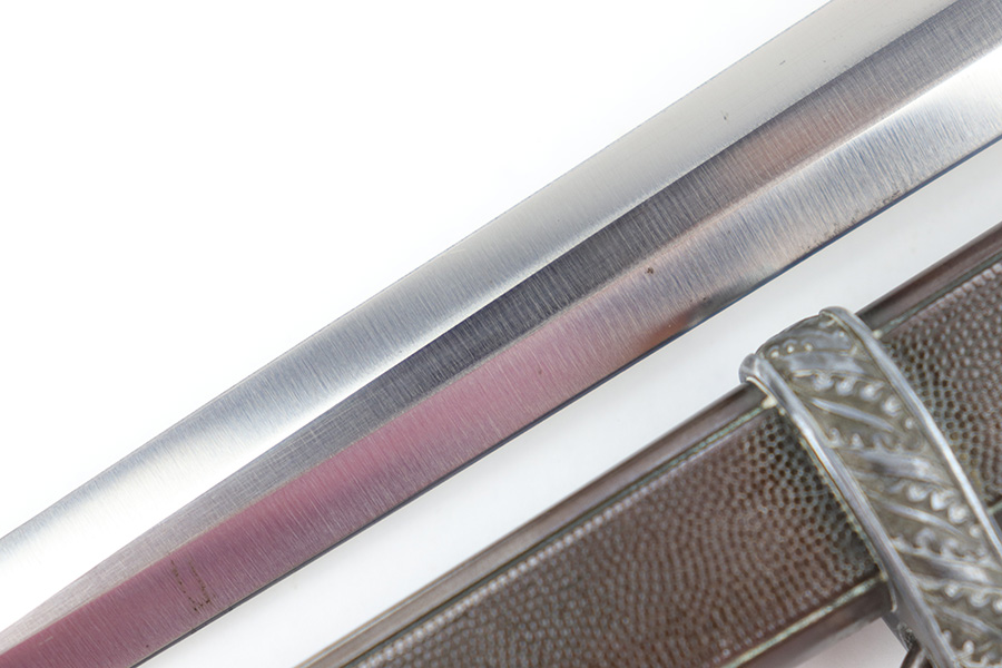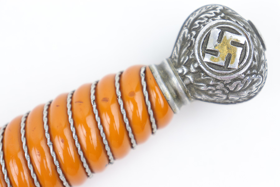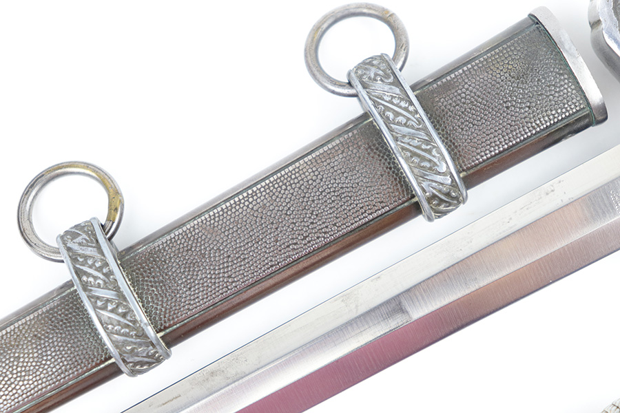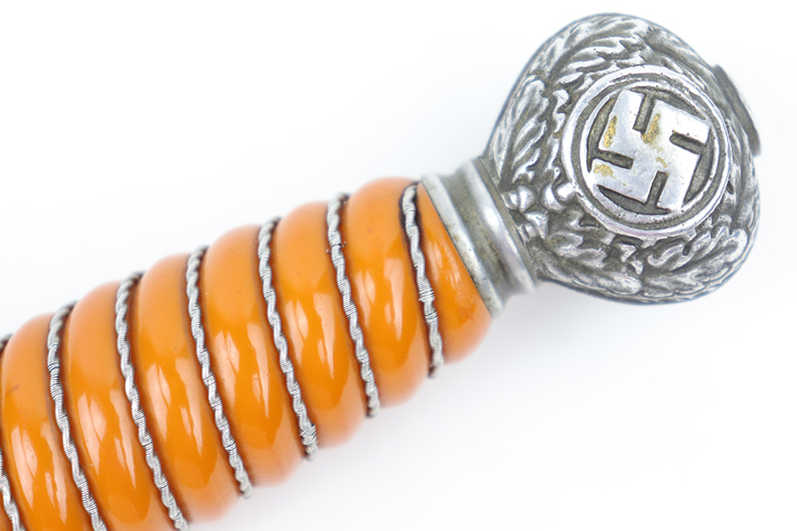 7/13/23 – This is an excellent example of a 2nd model Luftwaffe Officer’s Dagger from WW2. The dagger comes with an original silver portepee and a receipt from Thomas Wittmann (dagger expert) dated 2020. The dagger features an excellent, clean blade with cross graining visible throughout. There are some mild surface scratches from scabbard rub, and some very light freckling of surface oxidation / discoloration. Maker marked by Eickhorn on one side. The hand guard and pommel have normal surface patina throughout and high edge wear. The burnt orange bakelite handle has a tightly wrapped chord and has no cracks or chips. The portepee has some mild fraying along the chord, and some mild looseness on the knot, but overall in good condition. The scabbard is in great shape with no dents or major issues.
