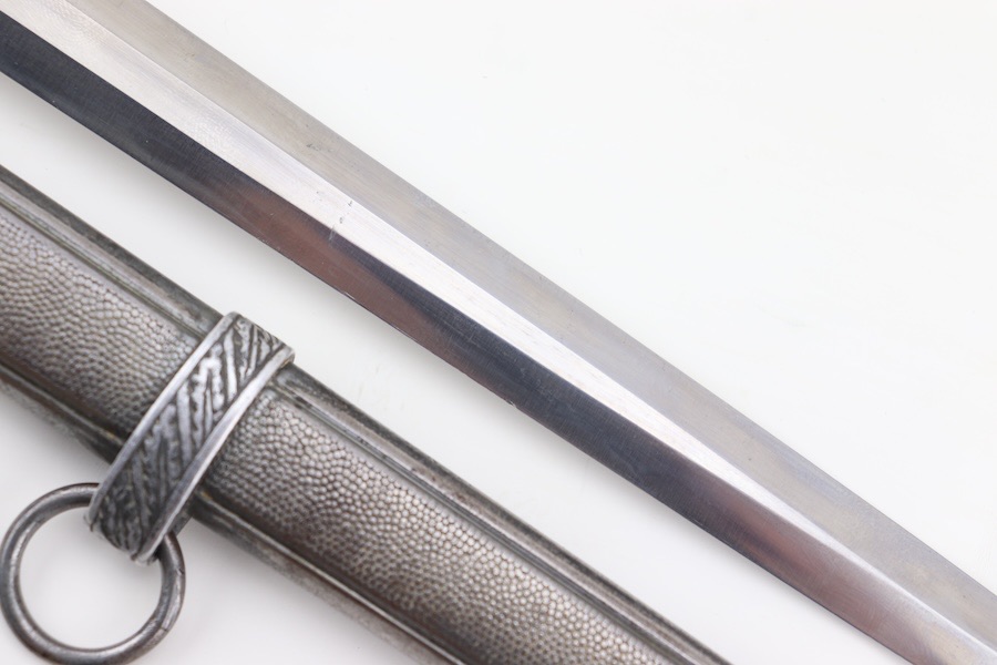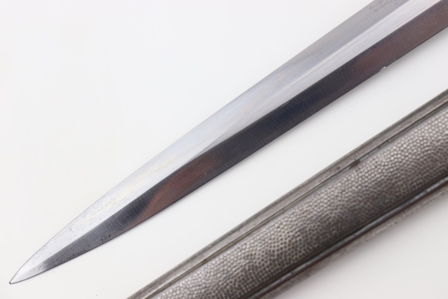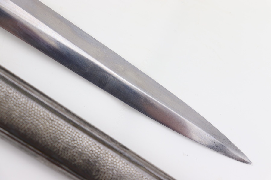 3/4/24 – This is an excellent example of a 2nd model Luftwaffe Officer’s Dagger from WW2. The dagger comes with an original silver portepee. The dagger features an excellent, clean blade with cross graining visible throughout. There are some mild surface scratches from scabbard rub, and some very light freckling of surface oxidation / discoloration. There is no maker stamp. The hand guard and pommel have normal surface patina throughout and high edge wear. The burnt orange bakelite handle has a well-wrapped cord but is not attached to the pommel end, and there are no cracks or chips. The portepee has some mild fraying along the chord, and some mild looseness on the knot, but overall in good condition. The scabbard is in great shape with no dents or major issues.