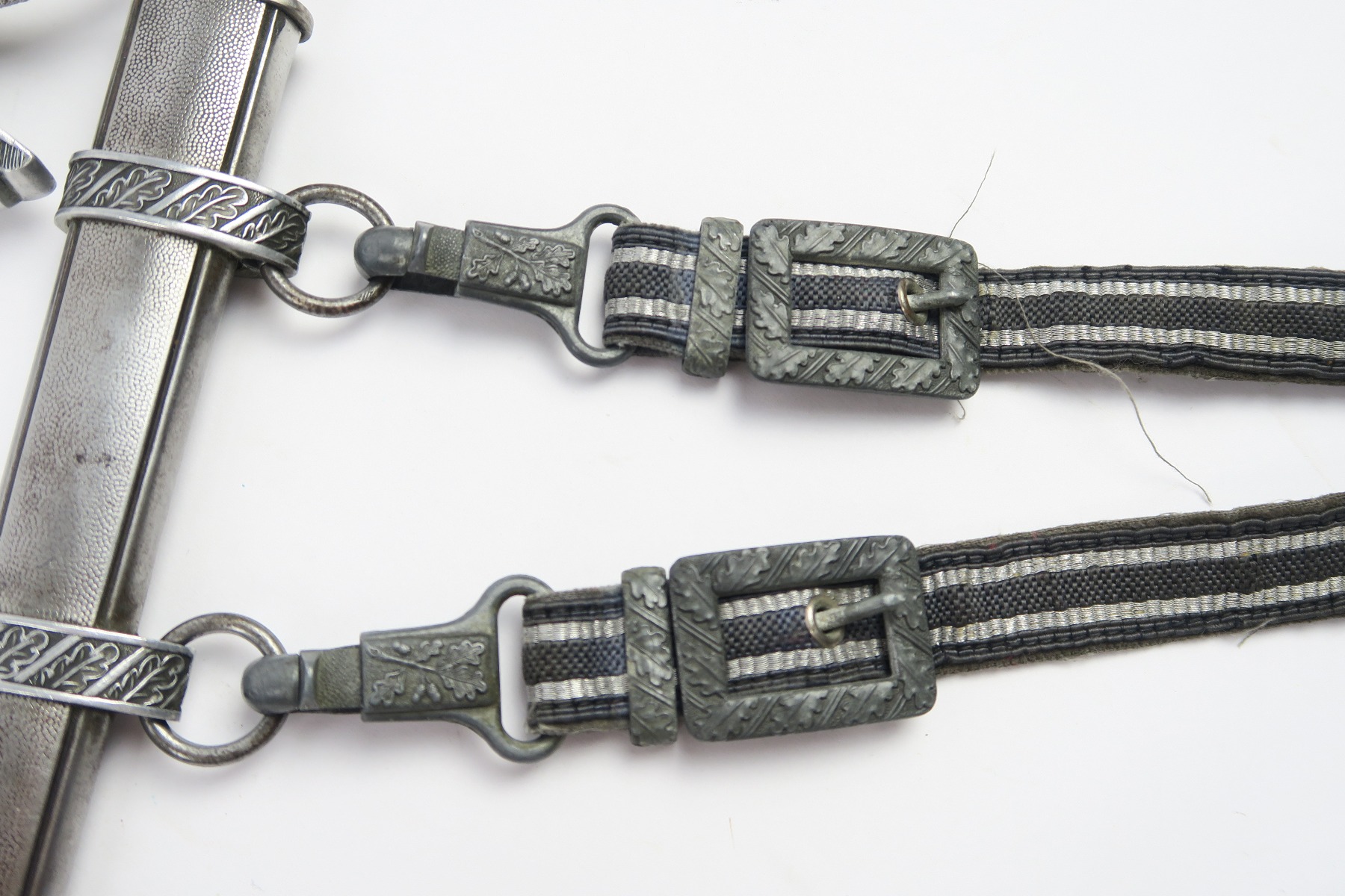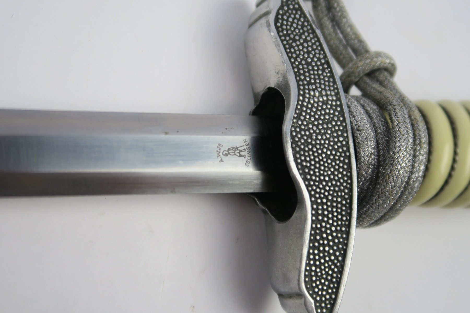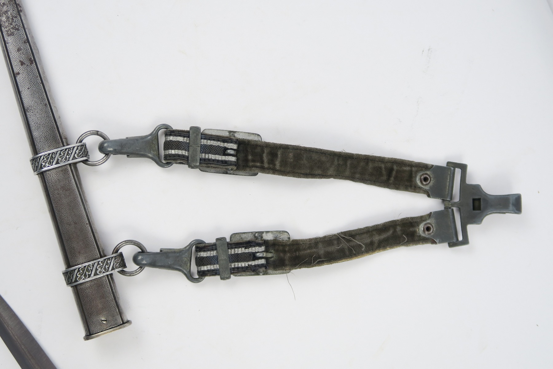 2/13/18 – This is an original WW2 Luftwaffe dagger, 2nd model. The dagger comes complete with the original scabbard, portepee, and hanger. The hanger has a grey velvet interior and very nice, detailed oak leaf engraving on the metal parts. The clips and buckles are all engraved. The hanger has light wear and normal aging but overall is excellent. The portepee is similarly excellent and all original with no notable flaws. The handle has some light surface wear which is only some dark scuffs. There is no cracking or chips on the handle. The blade is similarly excellent with a small “A.W. Jr” maker stamp on one side. There is no serious wear or damage on the blade outside of some light scabbard wear. Guaranteed all original and authentic.