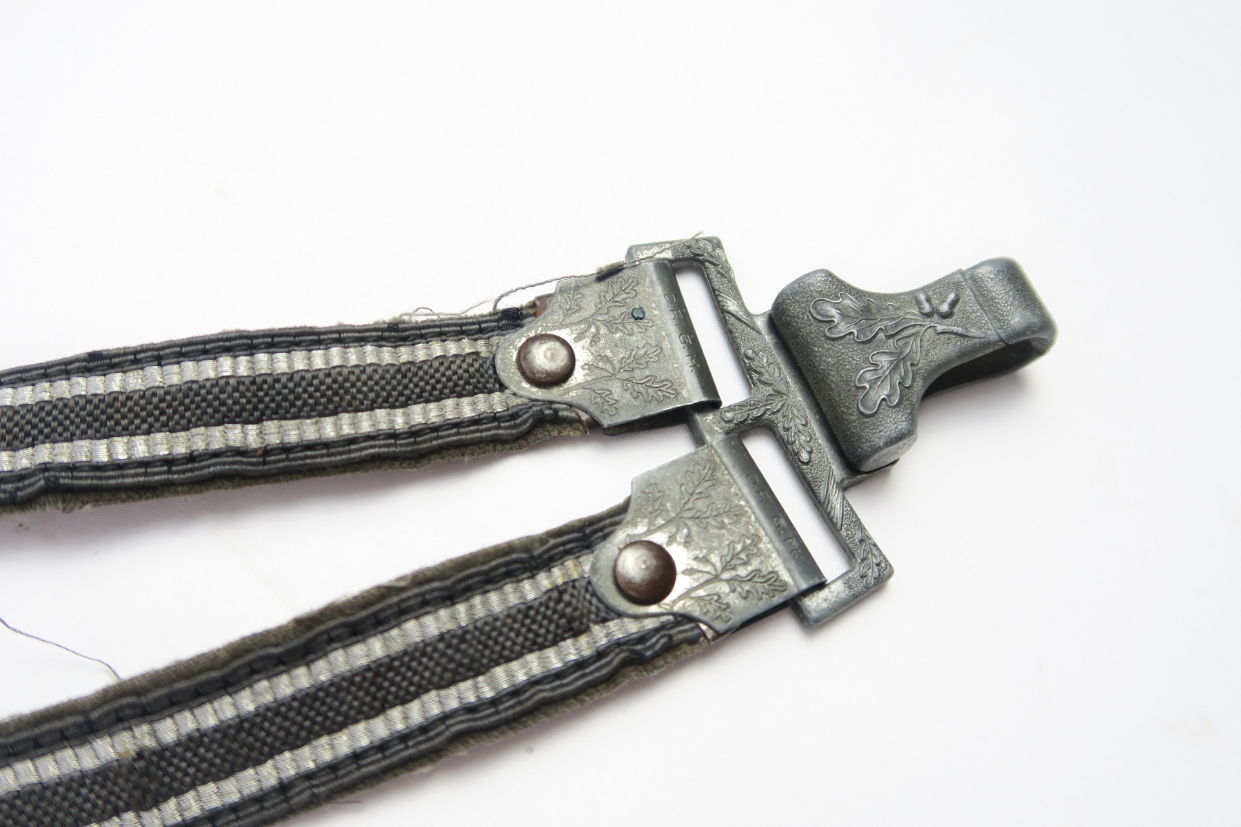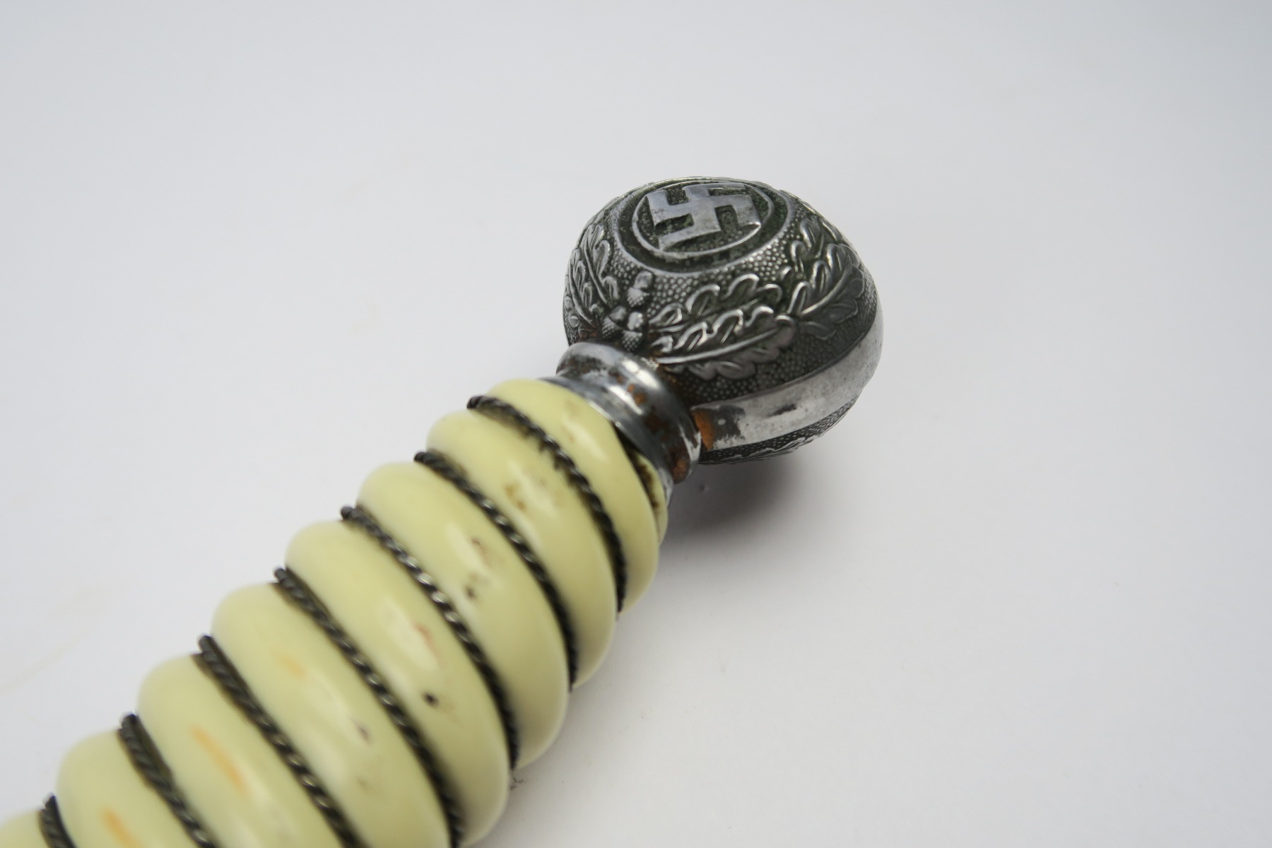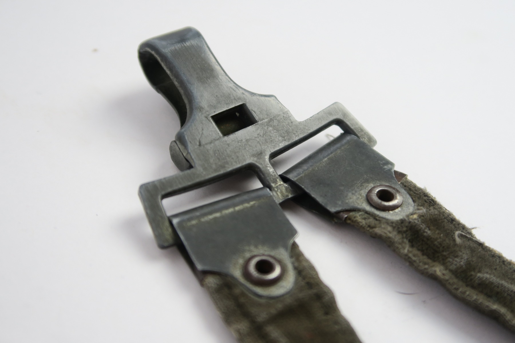 2/13/18 – This is an original WW2 Luftwaffe dagger, 2nd model. The dagger comes complete with the original scabbard, portepee, and hanger. The hanger has a grey velvet interior and very nice, detailed oak leaf engraving on the metal parts. The clips and buckles are all engraved. The hanger has light wear and normal aging but overall is excellent. The portepee is similarly excellent and all original with no notable flaws. The handle has some light surface wear which is only some dark scuffs. There is no cracking or chips on the handle. The blade is similarly excellent with a small “A.W. Jr” maker stamp on one side. There is no serious wear or damage on the blade outside of some light scabbard wear. Guaranteed all original and authentic.