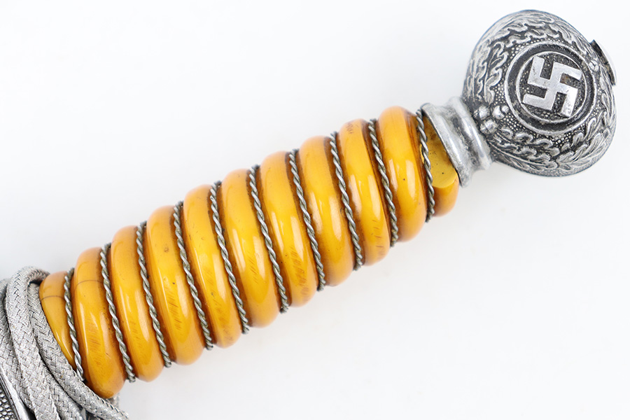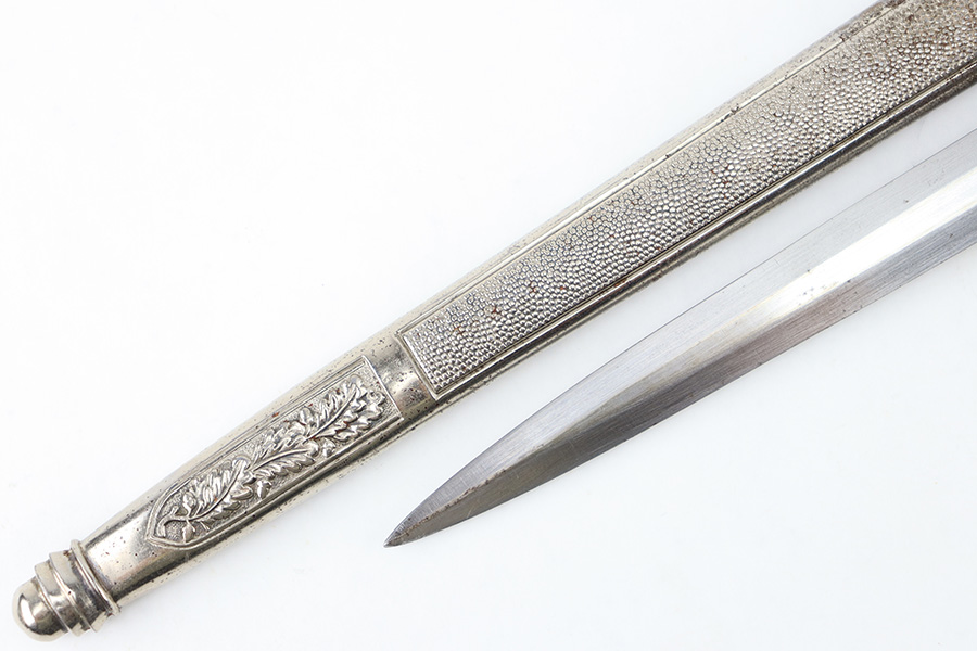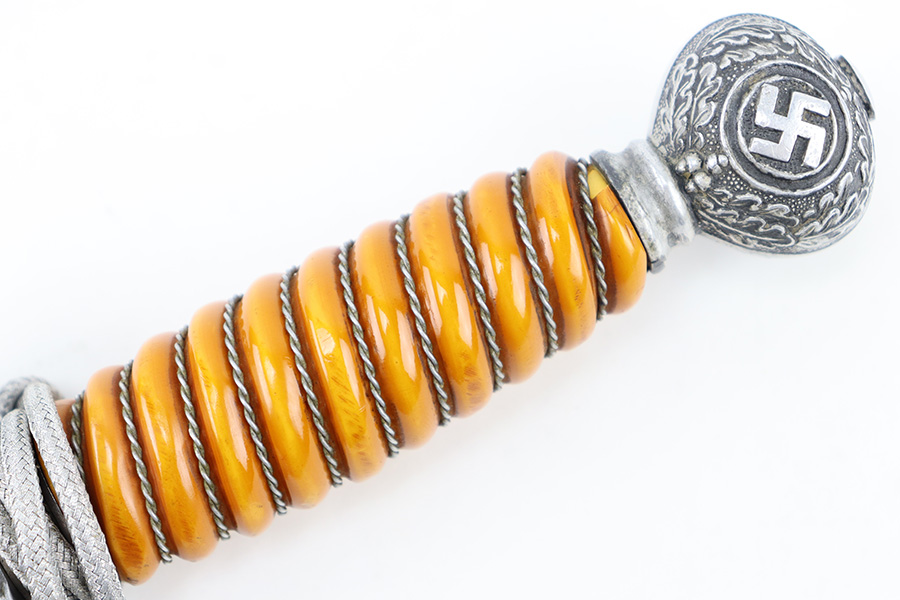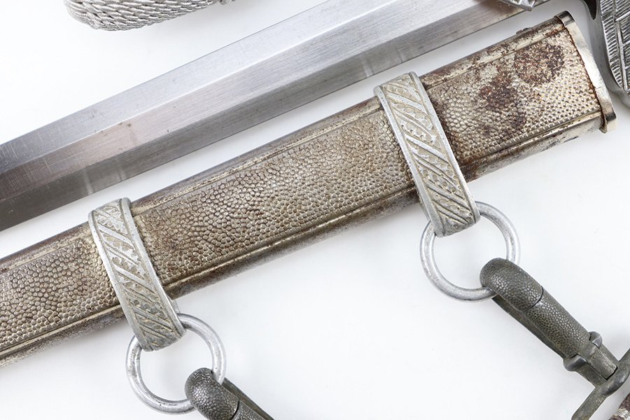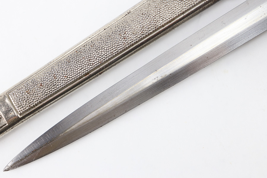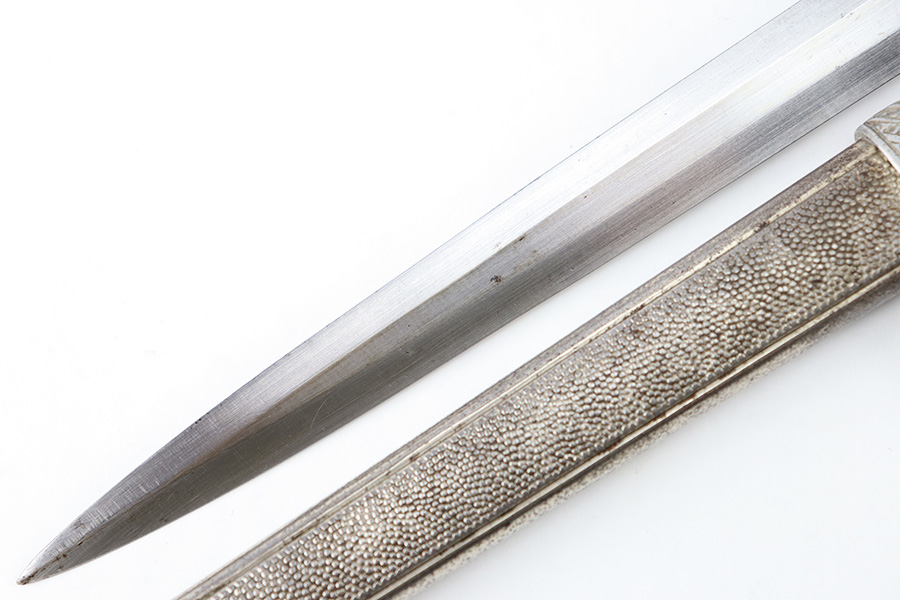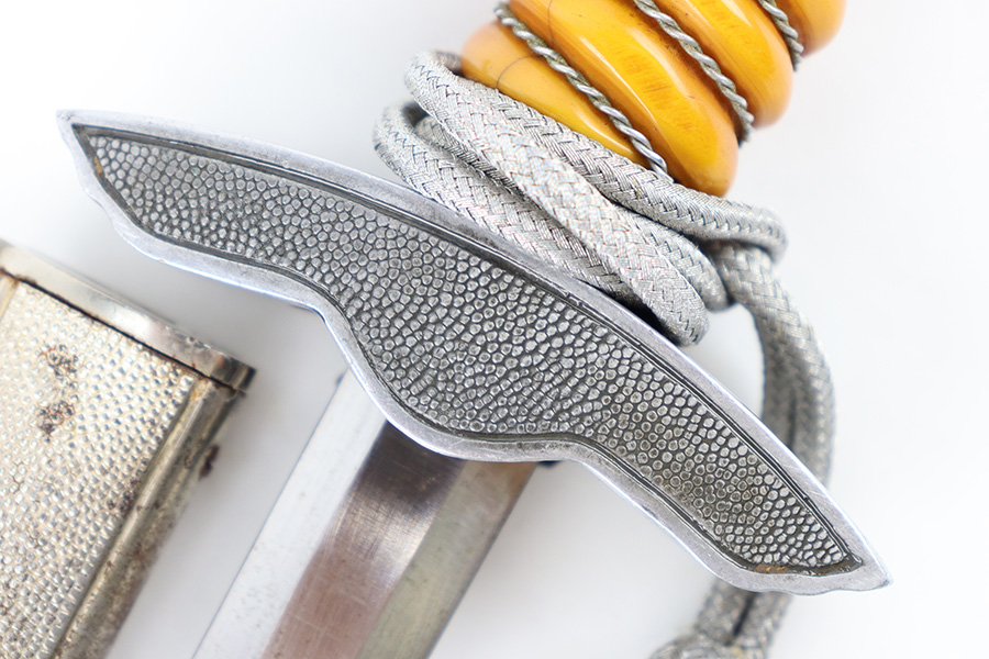 9/1/23 – This is an original WW2 2nd Model Luftwaffe Dagger with an attached silver portepee and hanger. The dagger blade is unmarked with some scabbard rub wear and mild signs of buffing / cleaning throughout the blade. Despite this, there is some mild evidence of cross-graining and natural patina which confirms authenticity. No maker marking or stamps on the blade, and the edge is unsharpened. The eagle cross guard has excellent detail and high edge wear / normal surface patina throughout. The burnt orange bakelite handle has a few scuff marks and a hairline crack in the base of the grip. Tight silver wrapped chord throughout the handle. Normal patina on the pommel and typical high edge wear with traces of the original finish within the grooves. The portepee is excellent and tight. Very clean and a top-notch example. The scabbard has some dark surface patina and interior rust. The hanger is in great condition with a DRGM stamped belt clip.