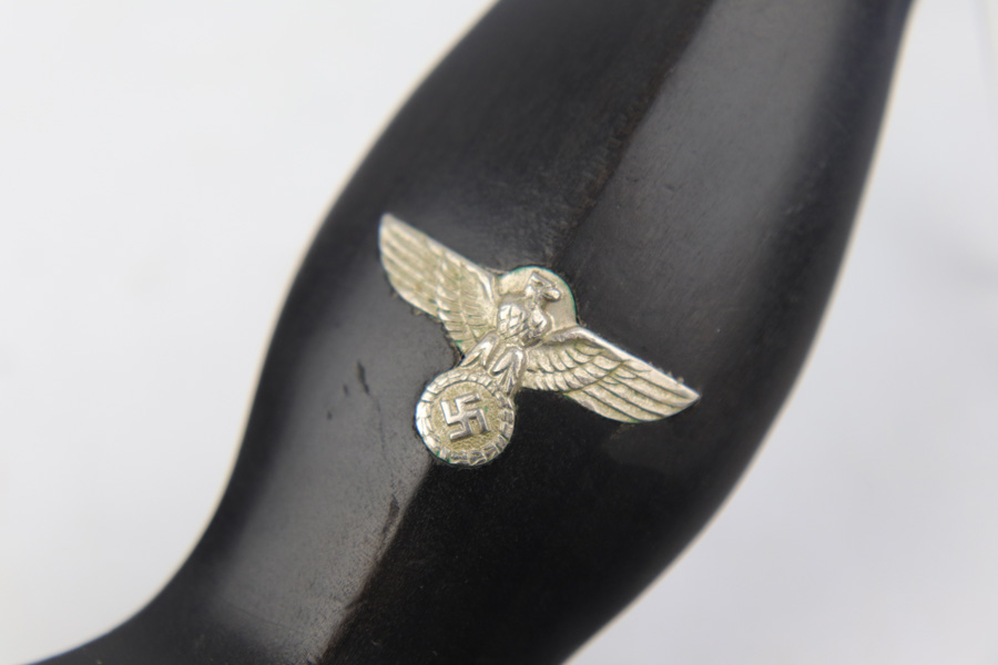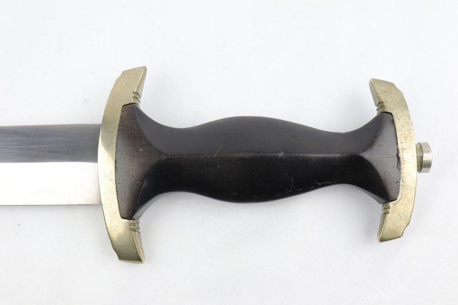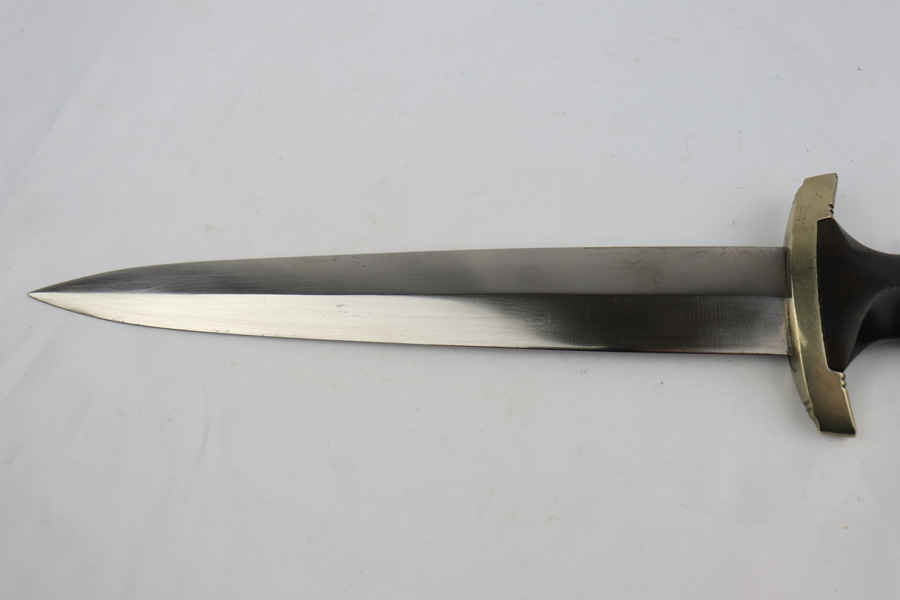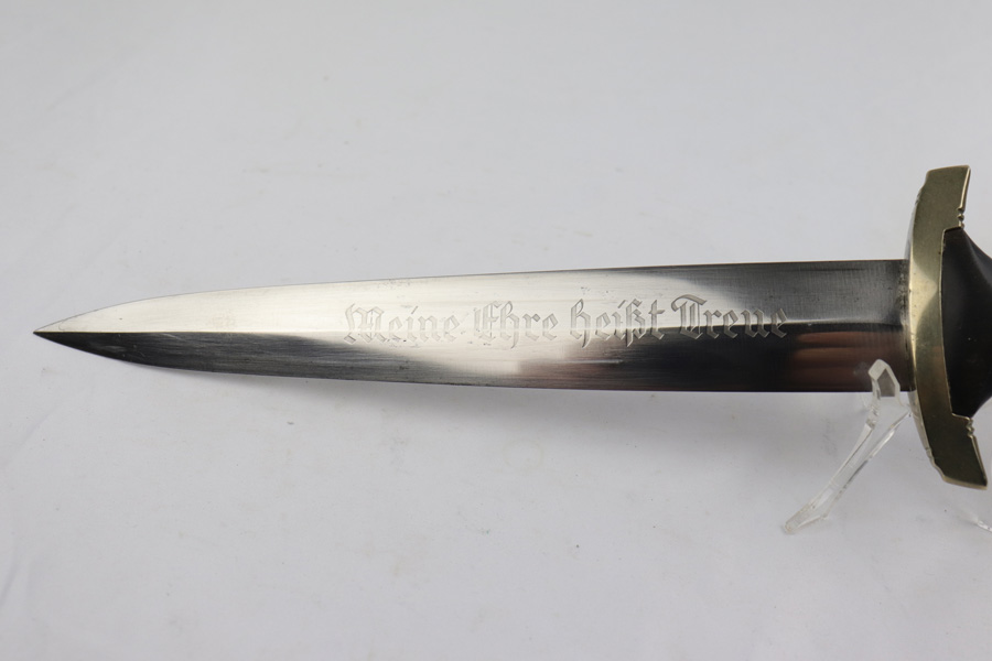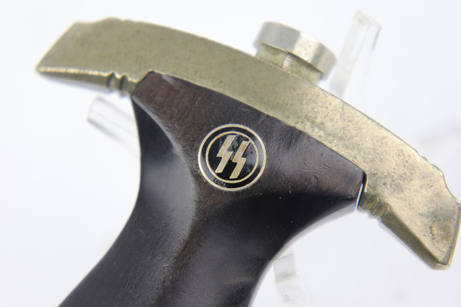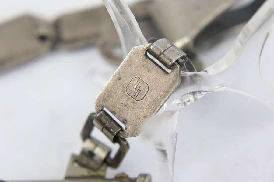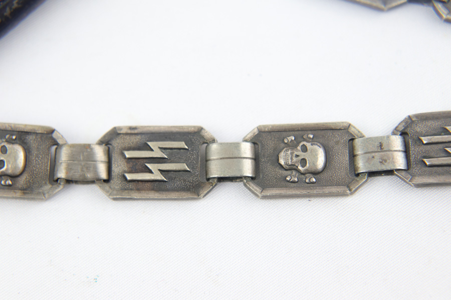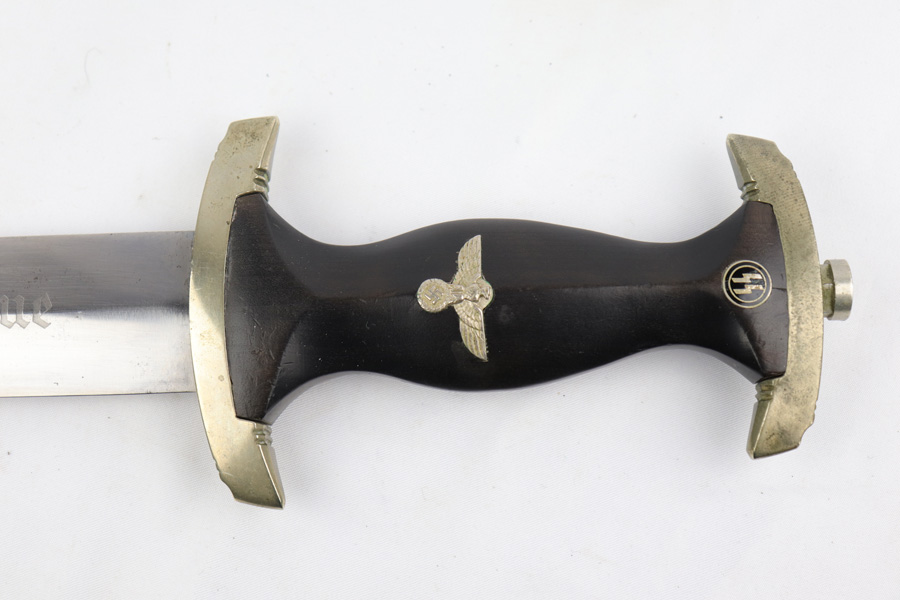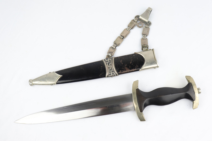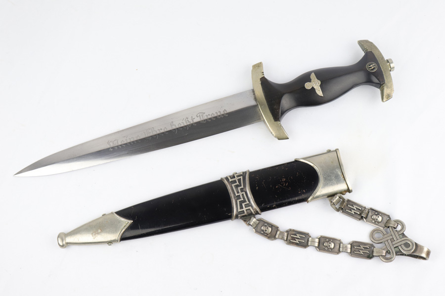 3/3/19 – This is an original WW2 production, rare SS dagger with an original SS chain. The dagger has no maker marking, but this is common on the 2nd pattern model SS daggers. The blade shows proper cross-graining and placement / location of the blade inscription. The wood handle has no cracks or chips and the metal fixtures show light patina and aging. The scabbard is correct and original as well with only some minor paint loss. The burnish background on the chain is in excellent condition and helps to prove the authenticity of this blade & chain. Some minor aging on the chain and normal wear, and the reverse side has a “SS” inscription stamp. This grouping was consigned to us by a respected and knowledgeable dagger collector. We stand behind this product as both original and authentic.