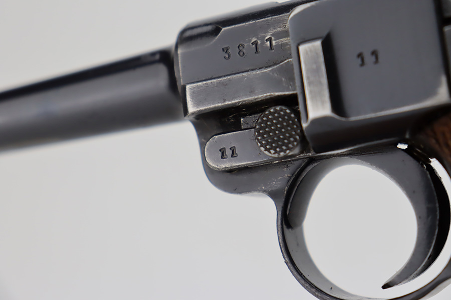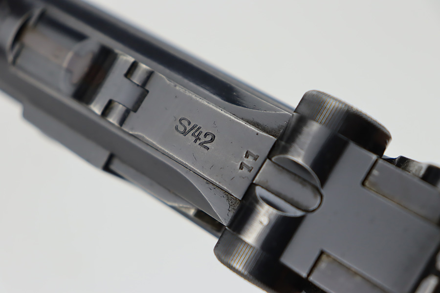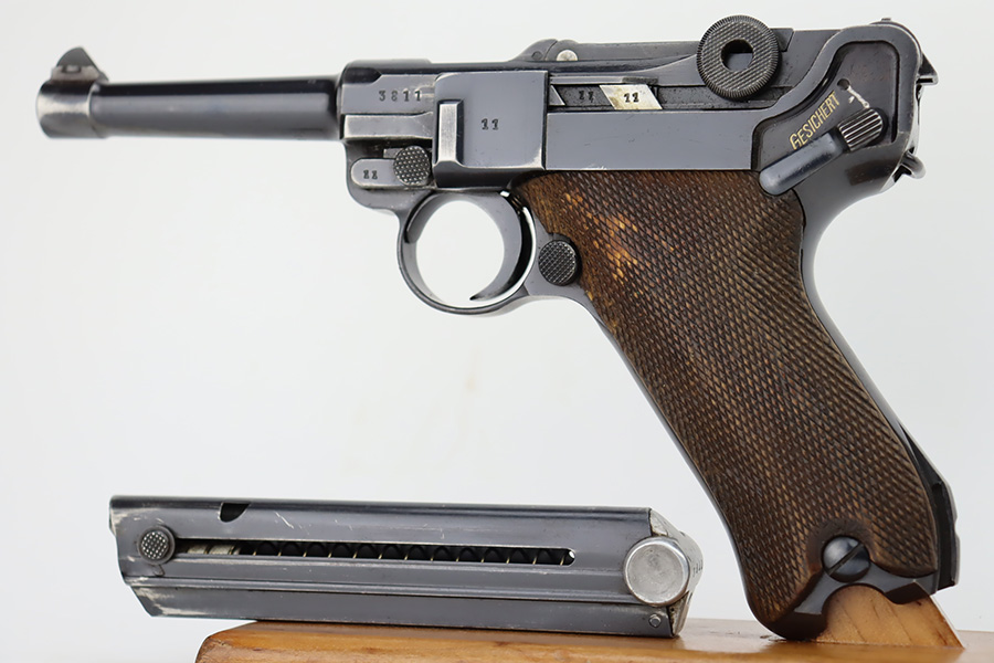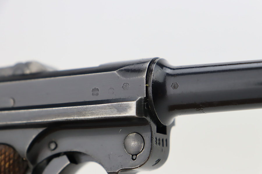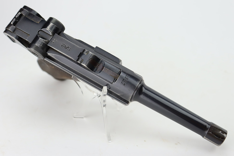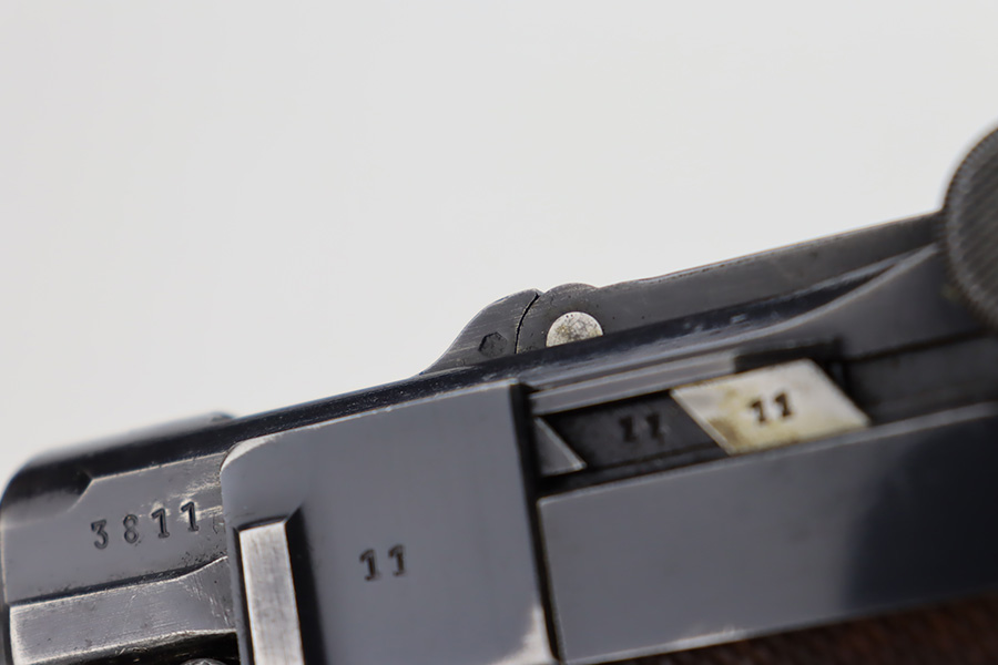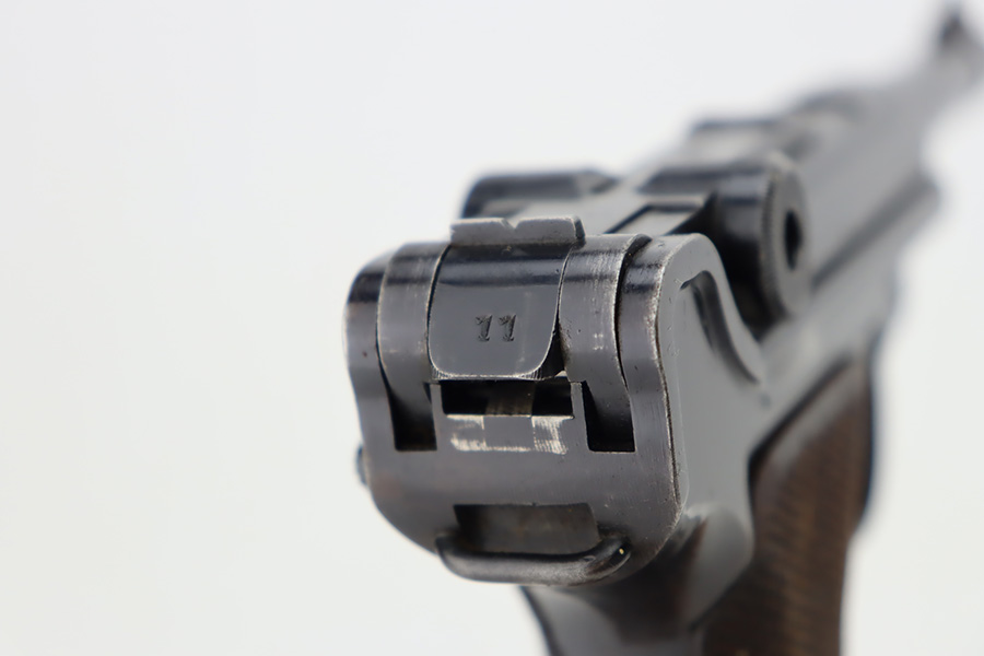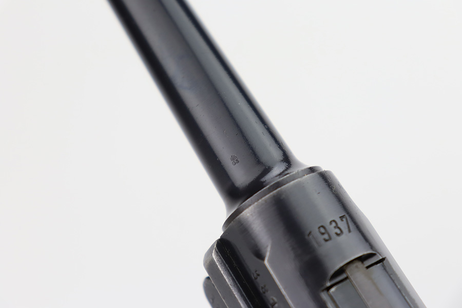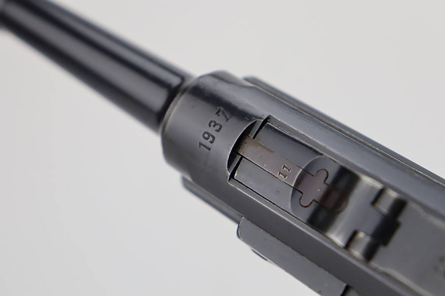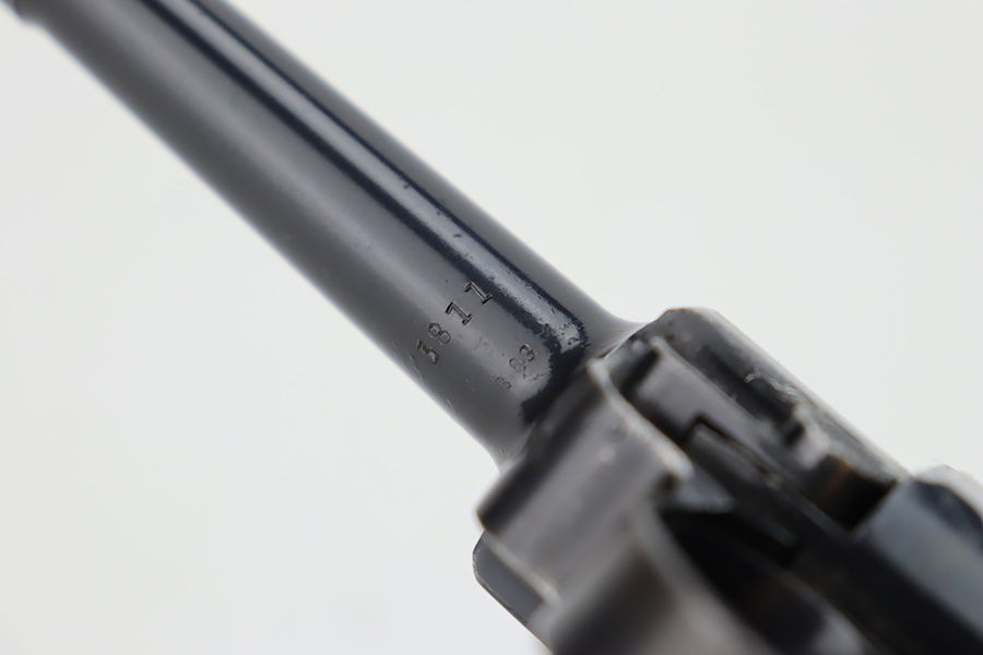 10/19/23 – This is a nice example of a Mauser Luger issued to the Nazi military in 1937. This is a second variant with blued small parts. All matching with the proper “Eagle 63” military acceptance proofs. It comes as a rig with a a 1938-dated holster, an “Eagle 63” Luger tool, and one original matching-numbered magazine. The bluing rates about 90% with general high edge wear, wear around the muzzle, and minor thinning on the grip straps. Matching-numbered wood grips. The bore has good rifling, but there is tiny pitting throughout.