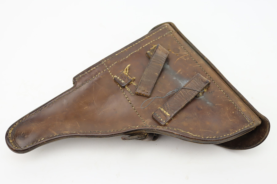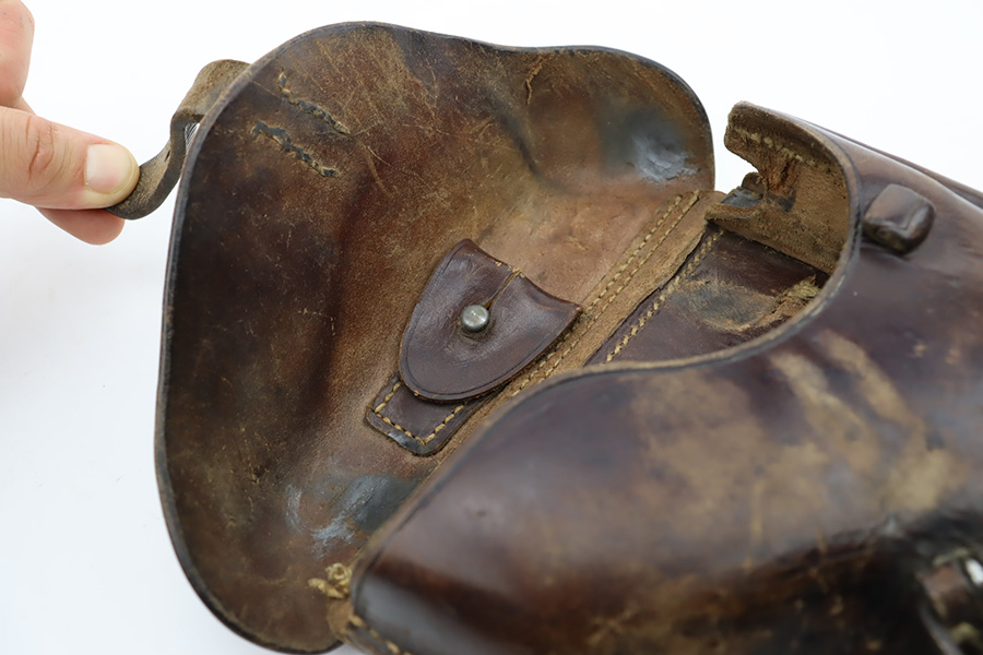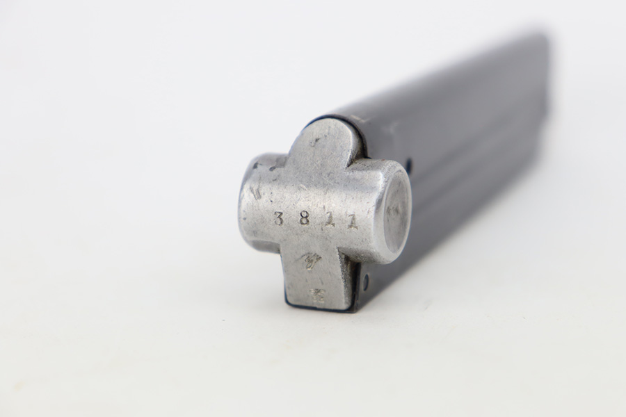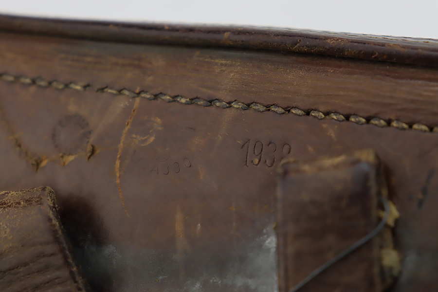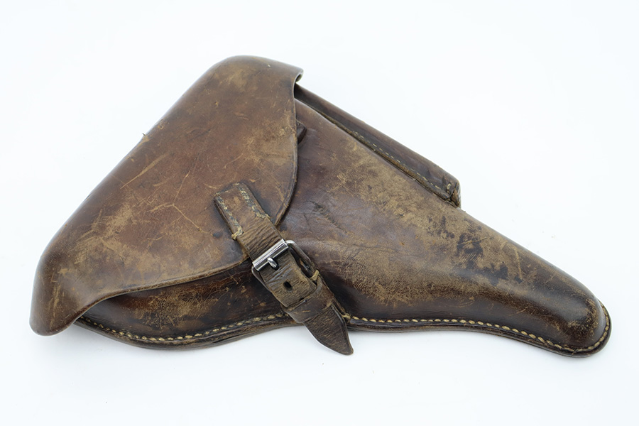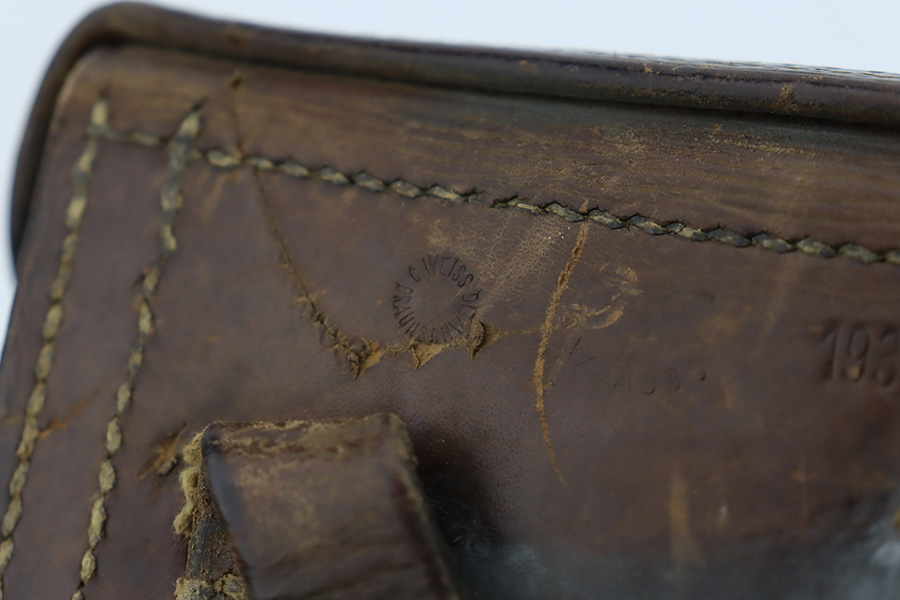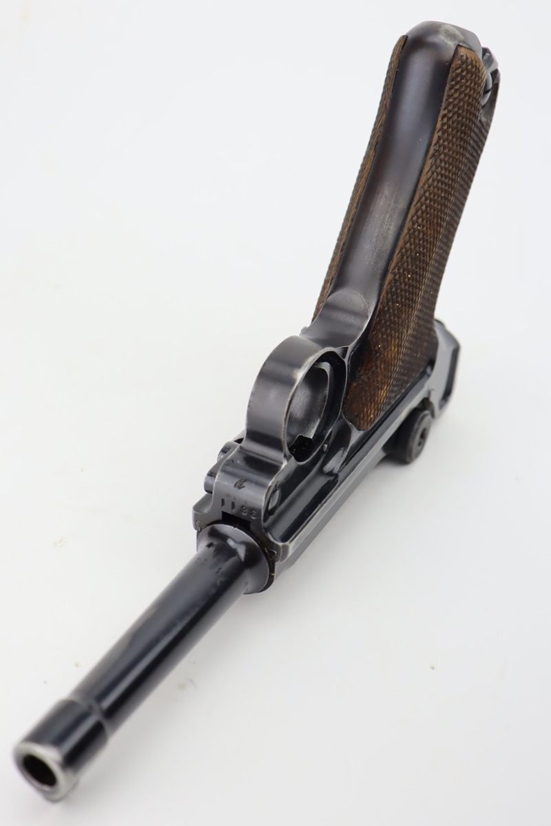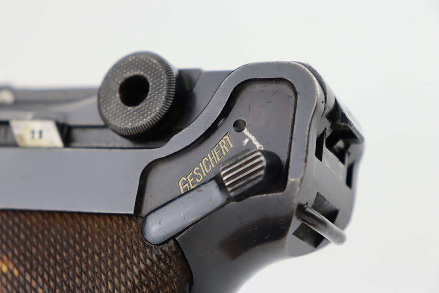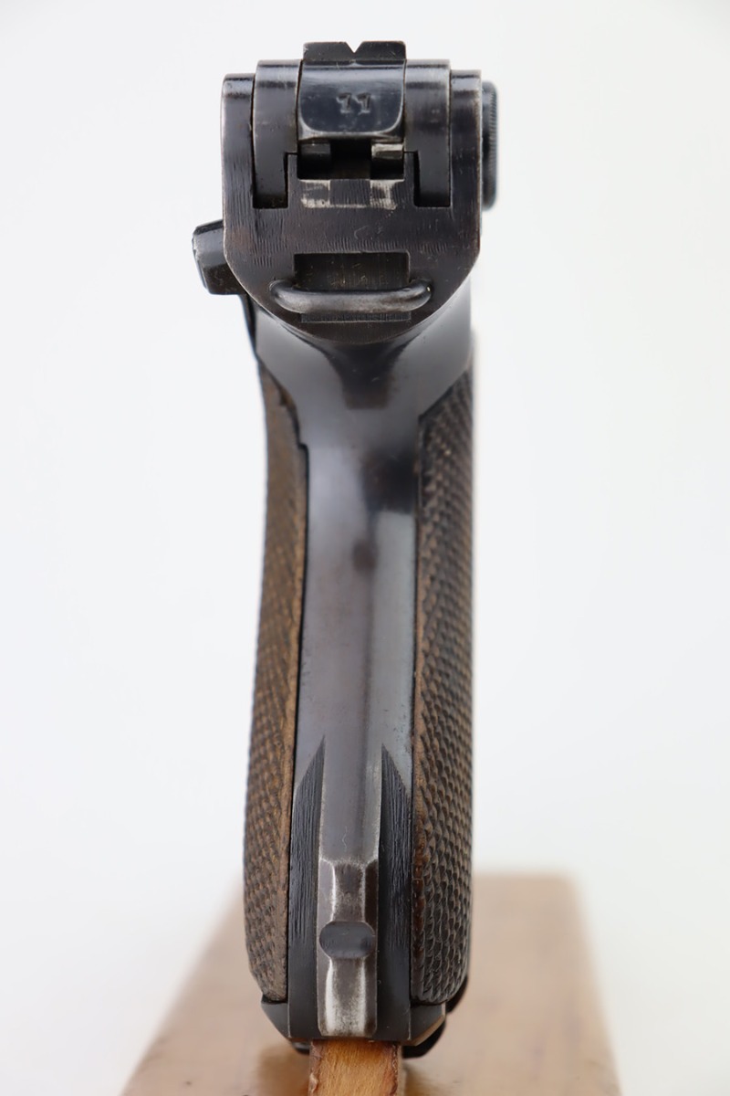 10/19/23 – This is a nice example of a Mauser Luger issued to the Nazi military in 1937. This is a second variant with blued small parts. All matching with the proper “Eagle 63” military acceptance proofs. It comes as a rig with a a 1938-dated holster, an “Eagle 63” Luger tool, and one original matching-numbered magazine. The bluing rates about 90% with general high edge wear, wear around the muzzle, and minor thinning on the grip straps. Matching-numbered wood grips. The bore has good rifling, but there is tiny pitting throughout.