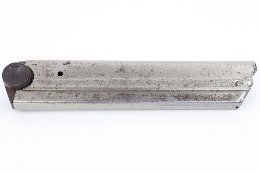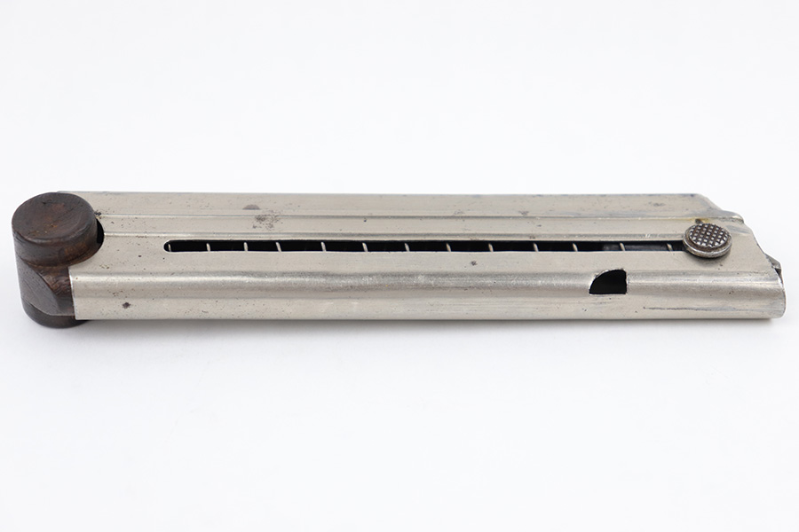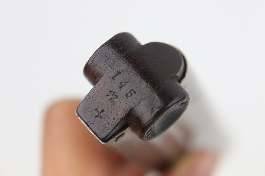 4/13/23 – This is an original WW1 Luger magazine. The magazine has a nickel tube and wood base. The base is in great condition with no major cracks or chips. The base is serial numbered “145n” with a “+” sign and no other markings. The tube has some mild surface patina and brown speckling discoloration, and some mild surface scratches along the spine. The spring is slightly weak from age and use but still functional.