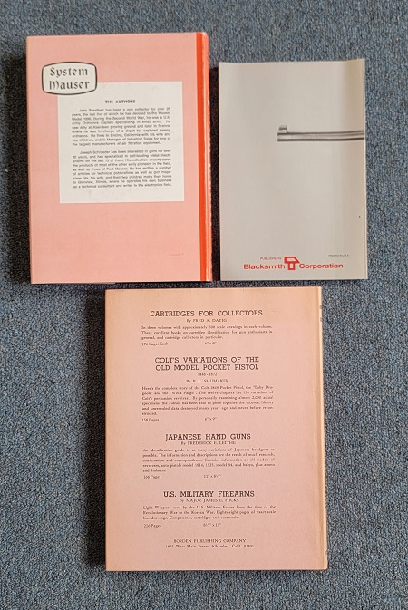 7/12/23 – These are three Mauser C96 resource books for collectors. First is “System Mauser: A Pictorial History of the Model 1896 Self-Loading Pistol” hardcover in great overall condition. Lightly used. Next is “The Mauser Self-Loading Pistol” hardcover book. Some light cosmetic wear and minor damage to the cover sleeve, but still in great overall condition. Last is a paperback copy of “Know Your Broomhandle Mausers” by R.J. Berger. This is a smaller reference book with some mild wear but very good overall condition. Get all three for one low price!