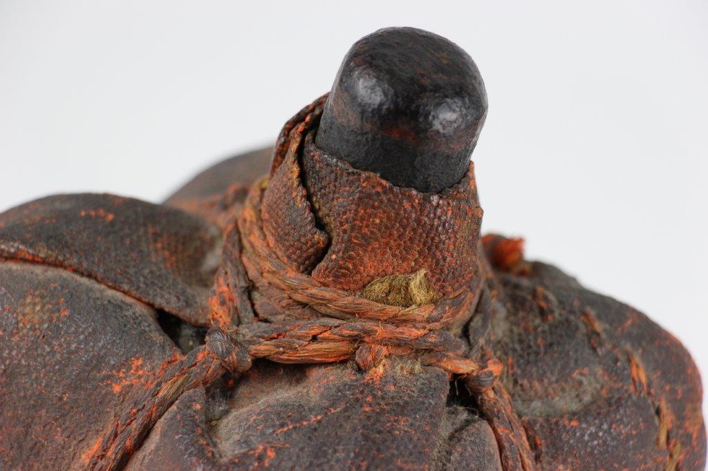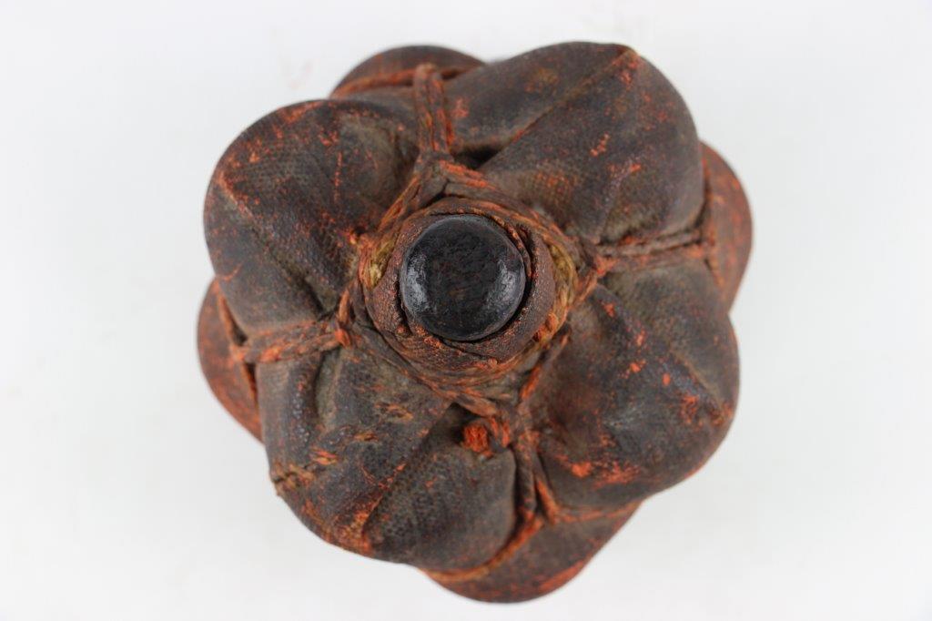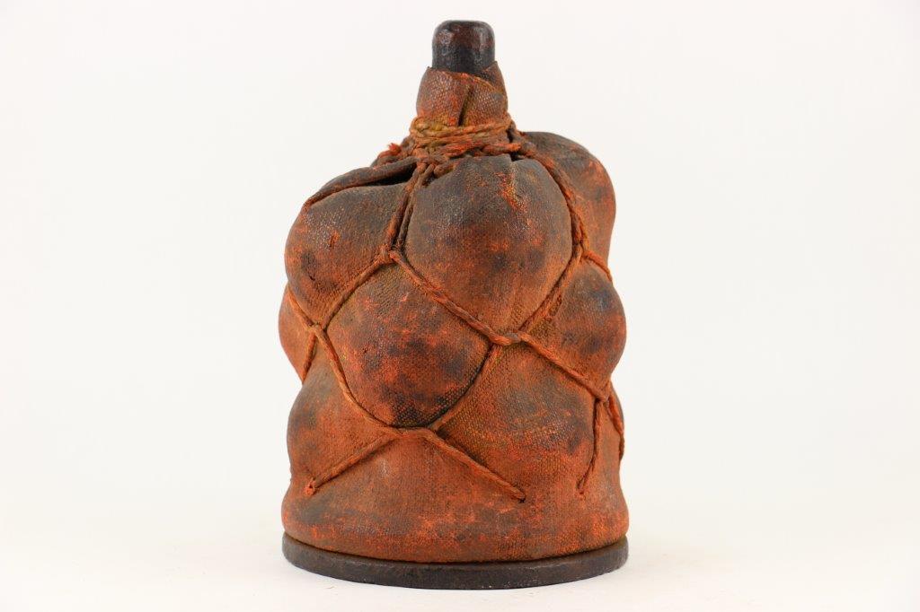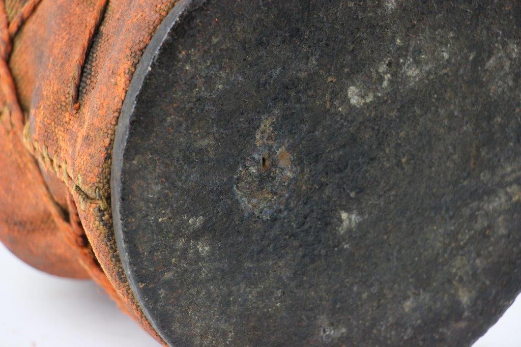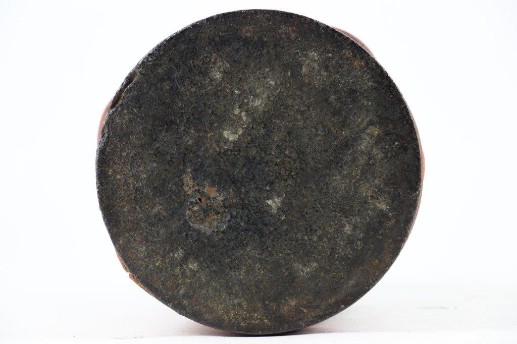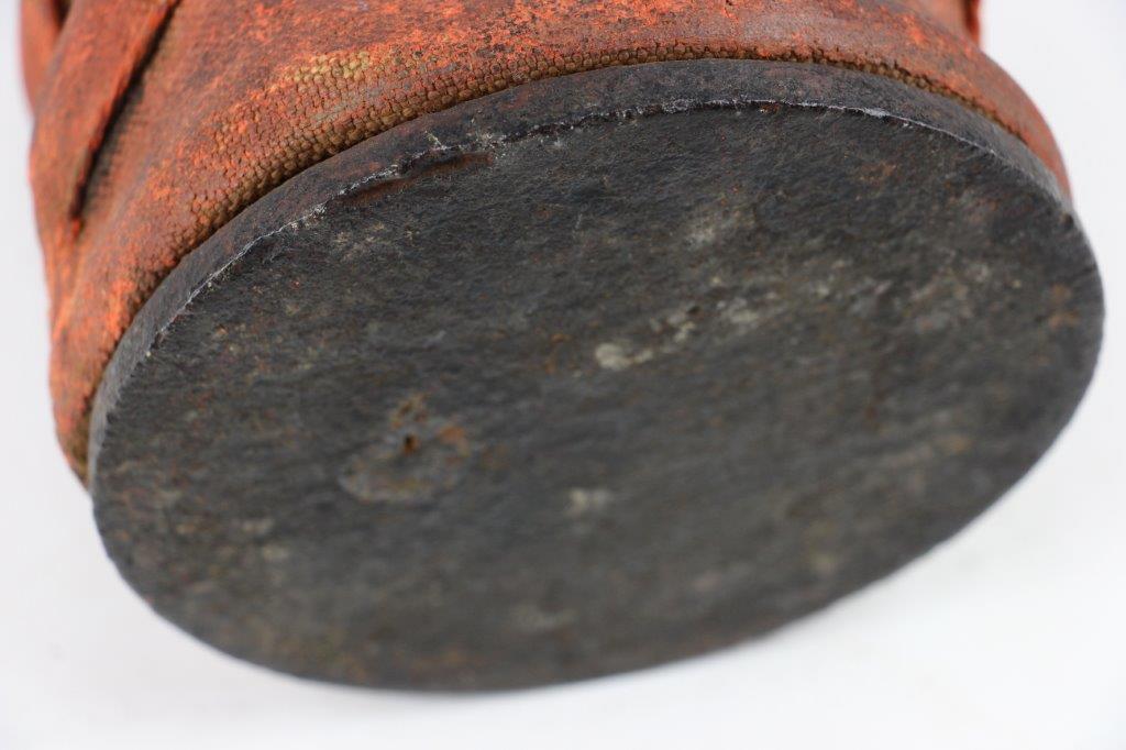7/10/24 – This is an original 32lb Stand of Grape; and artillery round used for close quarters and naval bombardment. These were used during The War of 1812 through the Civil War. This example is in great condition; still covered in the original tar-treated canvas material. The original string holding the assembly together is tight and intact throughout as well. The shot consists of 12 small 3in diameter cast iron balls clustered together, sitting on a cast iron stand. The stand shows natural age and patina with no markings or stamps. Measures about 9.5 inches tall, and the stand has a diameter of 6 inches. An incredibly preserved piece of US history. (Note this is an inert round with no fuse or gunpowder.)