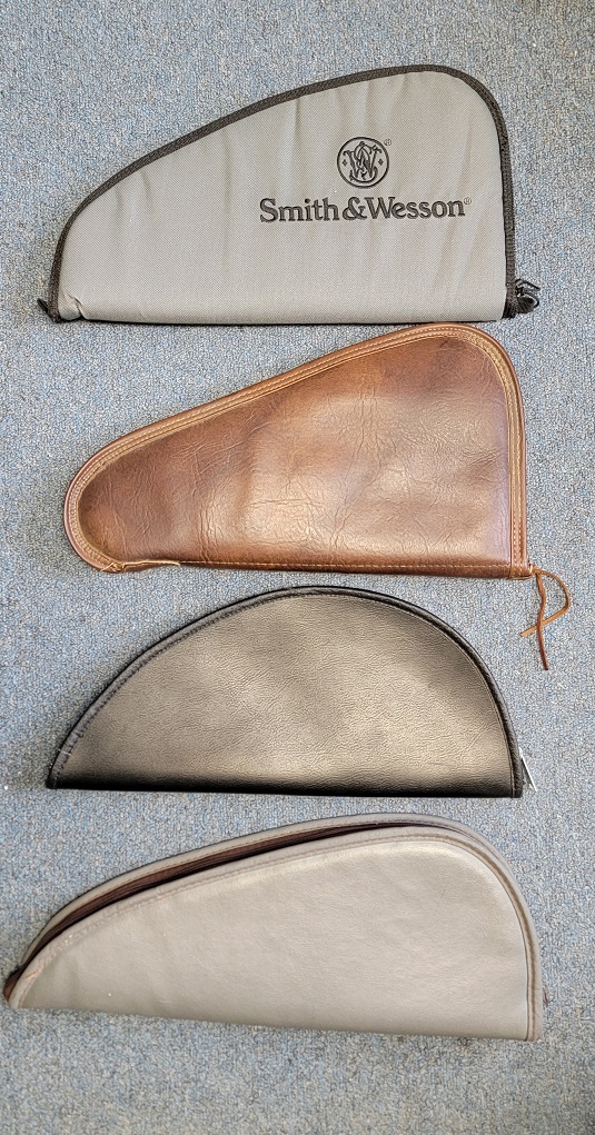 8/28/23 – These are 4 lightly used pistol soft cases for storage and transportation of your collectible firearms. Each case has a functional zipper and soft padded interior. Great overall condition.