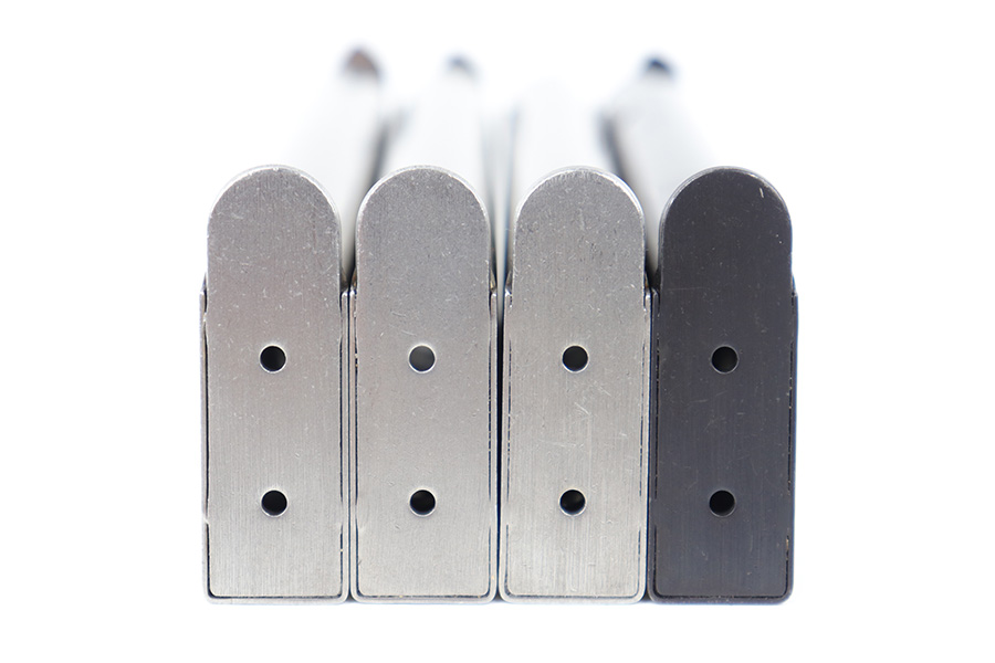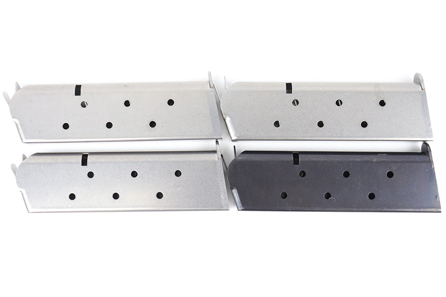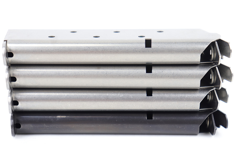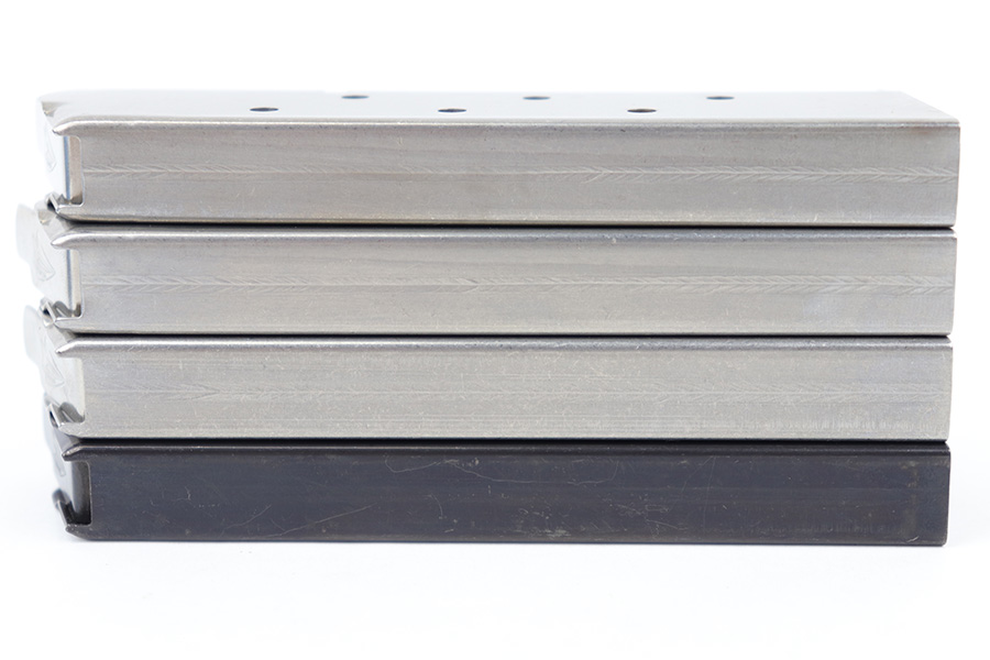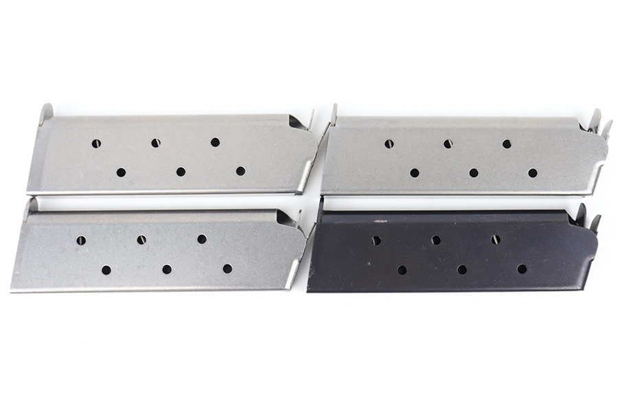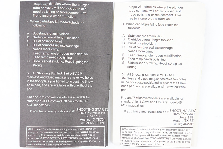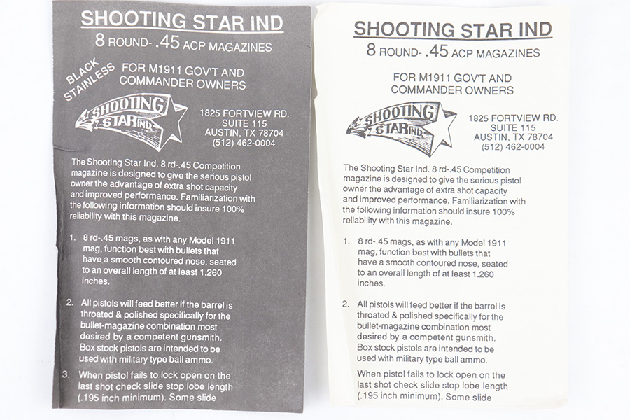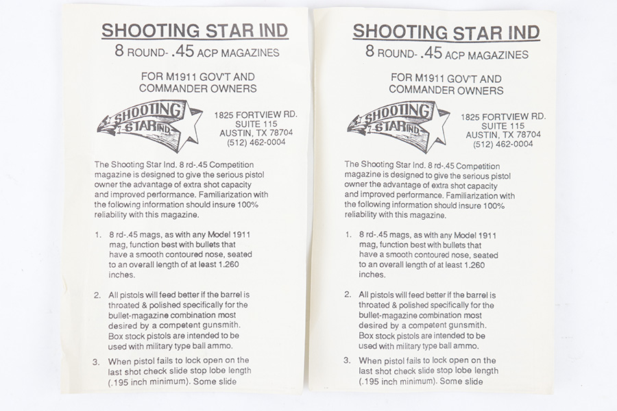 6/5/23 – These are 4 Shooting Star 8 round .45 ACP magazines. Unused in the original packaging as shown. These magazines are for M1911 Government and Commander pistols. Excellent condition. Three are nickel and one is blued, as shown.