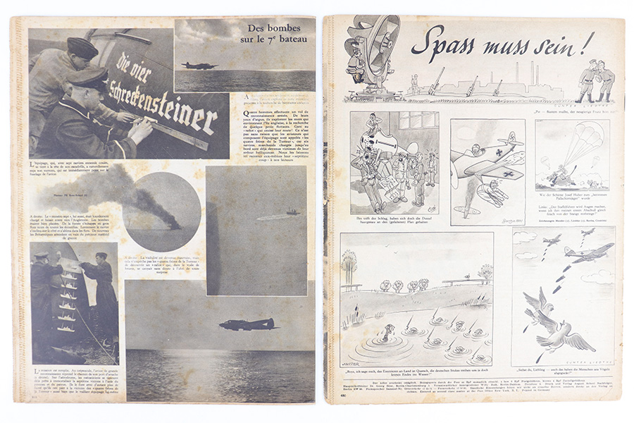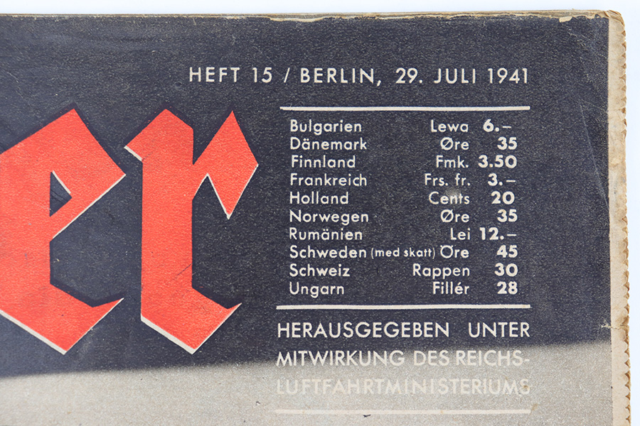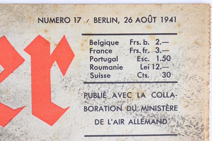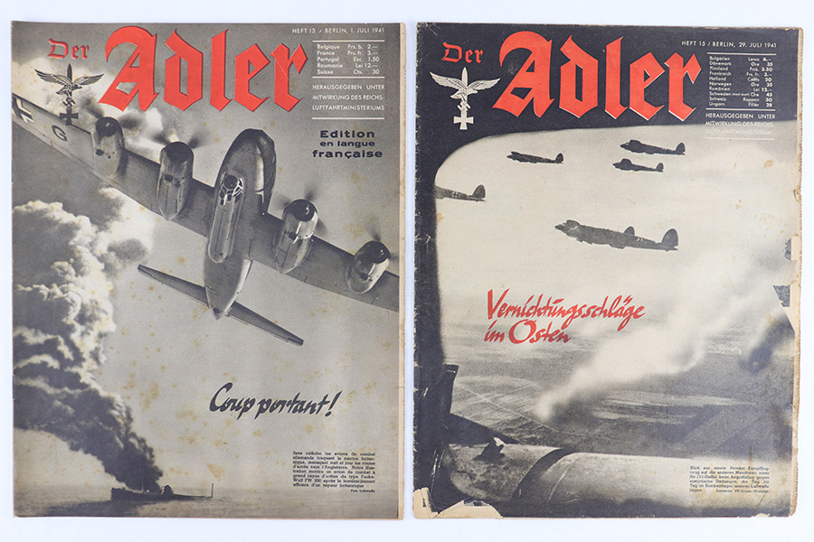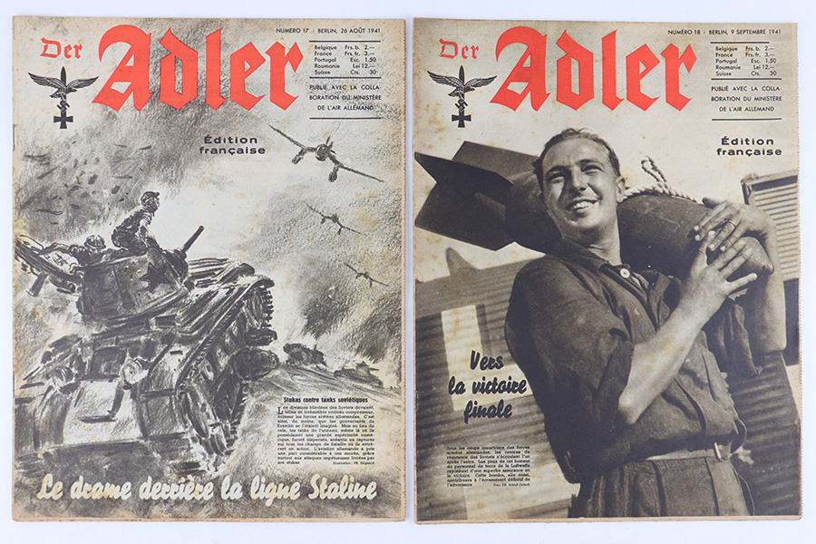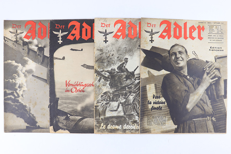 7/5/23 – These are 4 original copies (or volumes) of “Der Adler” magazine from 1941. Three of the four are written in French, for distribution in France as Nazi propaganda after their invasion in June of 1940. Each edition shows some yellowing and mild fraying / normal wear along the edges and corners of the pages. All pages are in tact however and these are in great overall condition. An interesting piece of WW2 history.