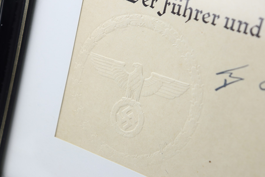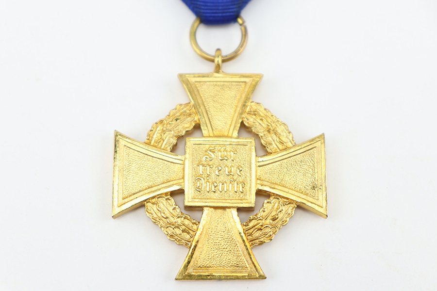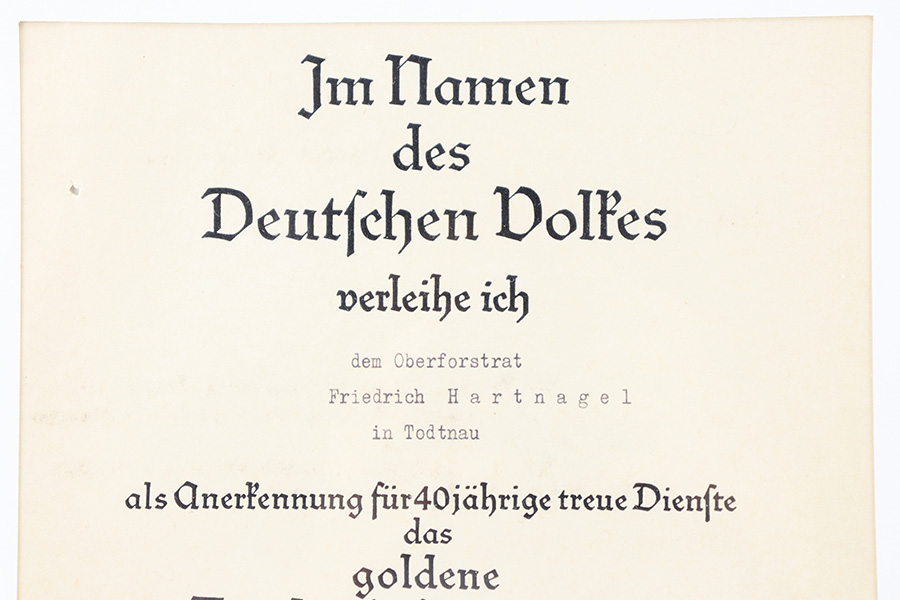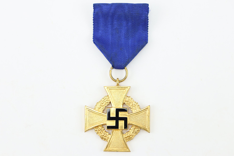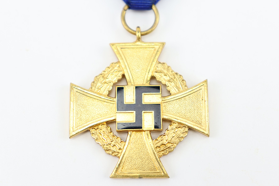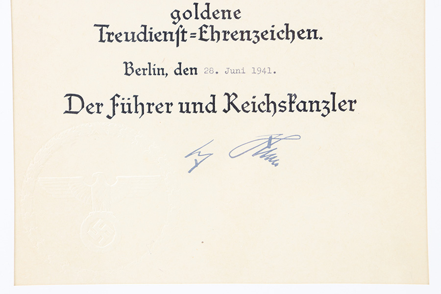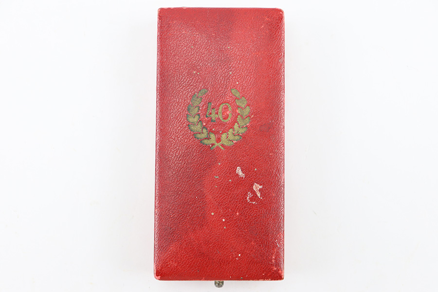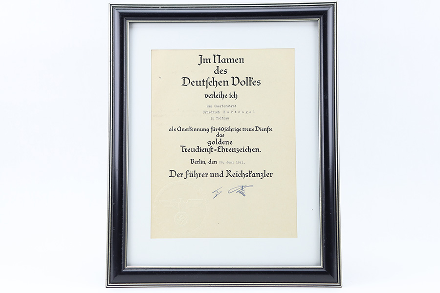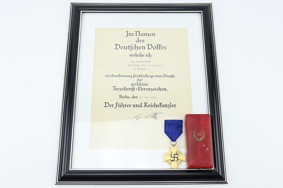 12/6/23 – This is an original German 40 Year Long Service Award, also known as a Faithful Service medal in gold. The medal comes with an original ribbon, original box, and an original award document. There’s no way to prove this was the original document issued with this award, but the document adds a cool historical element to this offering, as all awards were issued with a document like this. The document is named to a soldier in Todtnau, and is dated June 28, 1941. Comes in a basic wood frame, as shown. The award is in great condition with some light patina but no major issues.