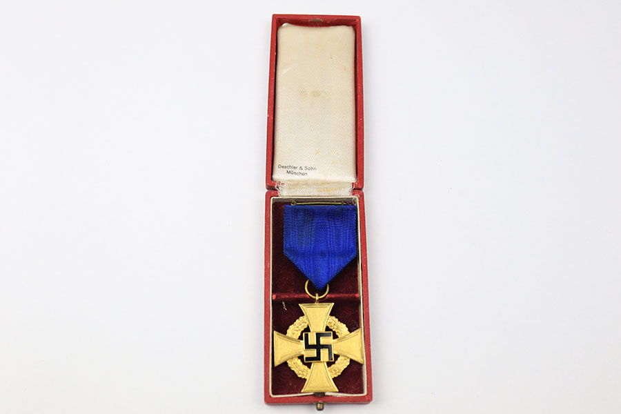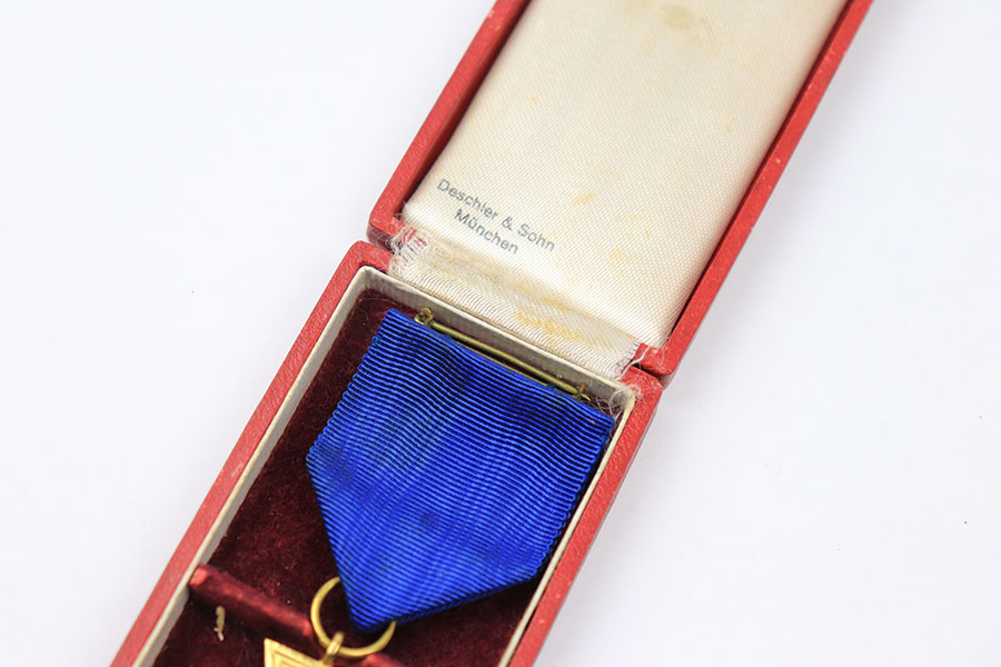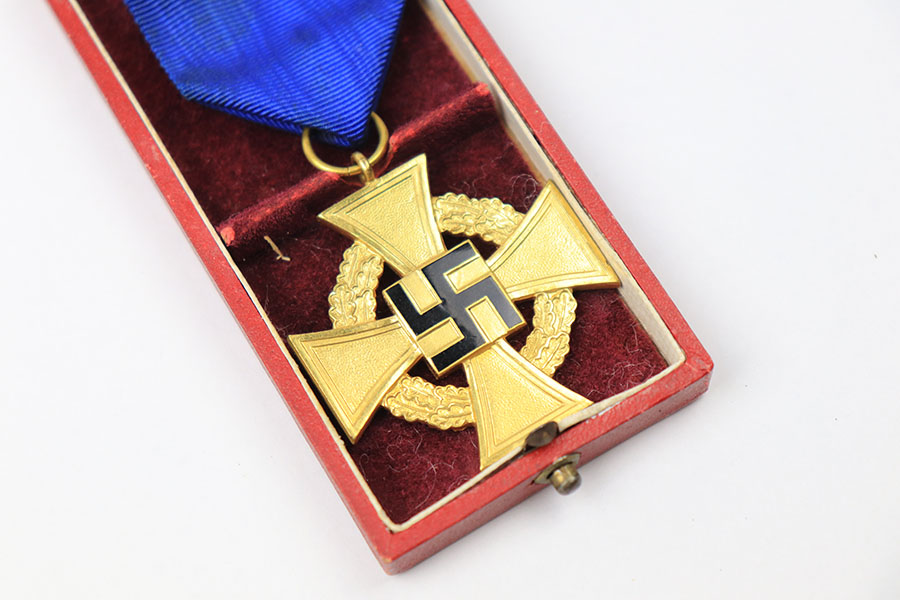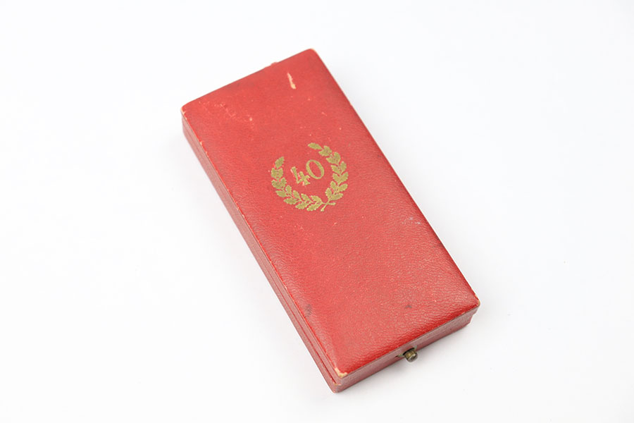 10/6/21 – This is an original 40 Year Service award from WW2. The award is in excellent condition and comes with the original ribbon and box. The box is in great condition with some minor wear. Closes and stays shut without issue.