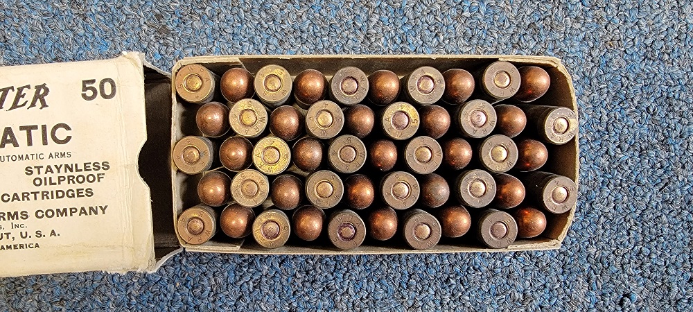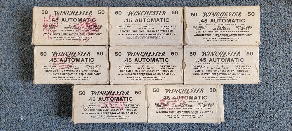 8/29/23 – This is 400 rounds of Winchester .45 Auto ammunition. The ammo is FMJ 230 Grain cartridges in the original boxes. Although the boxes are torn and tattered, the ammunition is in great condition. Head stamped “WRA 54”. There’s some dust and mild aging on each round, but this shouldn’t affect functionality.