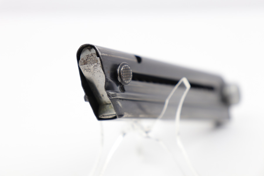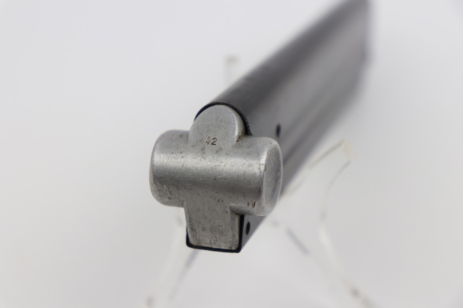 8/8/19 – This is a 42 code WW2 Luger magazine. The 42 code indicates the magazine was used as a field replacement magazine made by Mauser. These magazines are typically not serial numbered, and desirable to collectors due to their lack of a “mismatching number”. The magazine frame is in excellent condition with no rust or pitting. Feeds well with an excellent spring as well. Guaranteed original and authentic.
