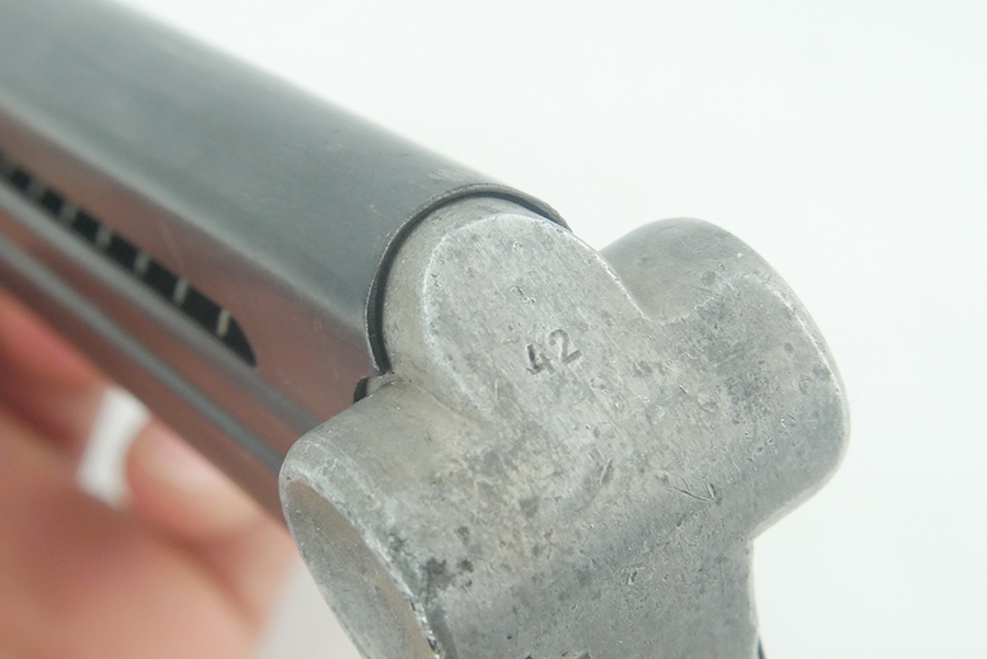 08/23/24 – This is a 42 code WW2 Luger magazine. The 42 code indicates the magazine was used as a field replacement magazine made by Mauser. These magazines are typically not serial numbered, and desirable to collectors due to their lack of a “mismatching number”. The magazine frame is in excellent condition with no rust or pitting. Feeds well with an excellent spring as well. Guaranteed original and authentic.