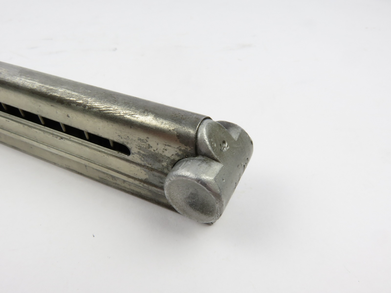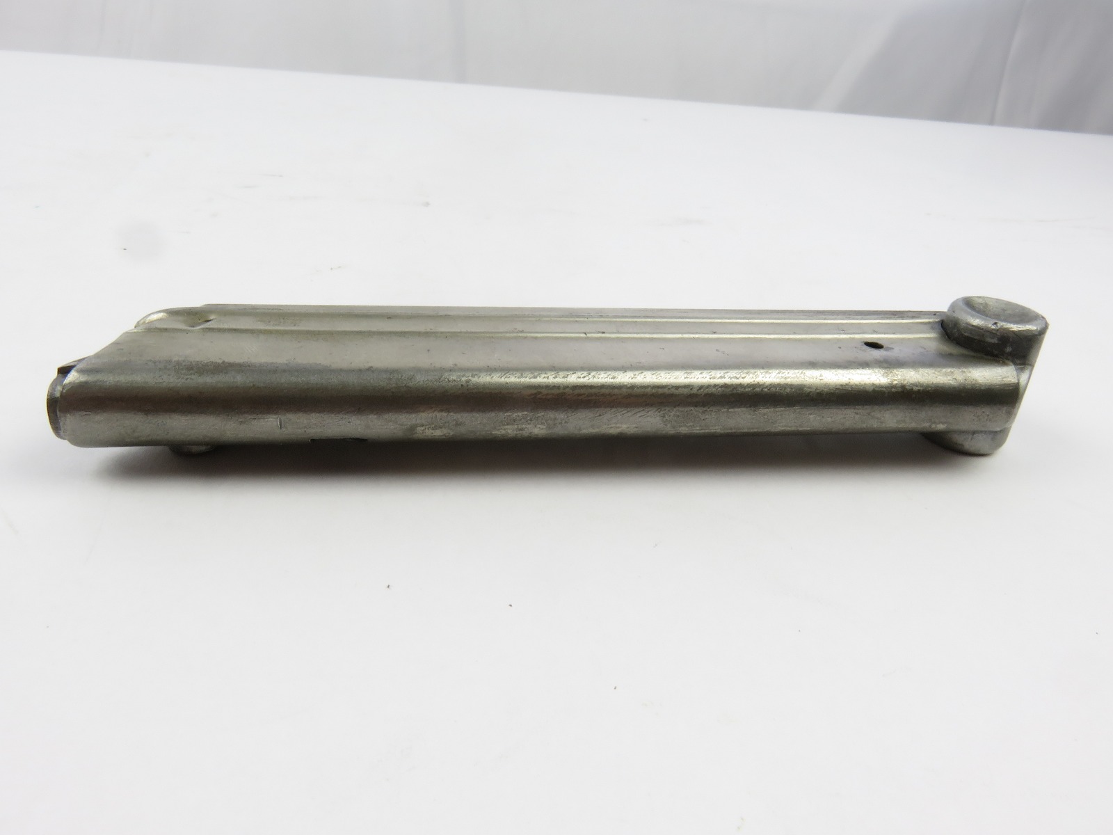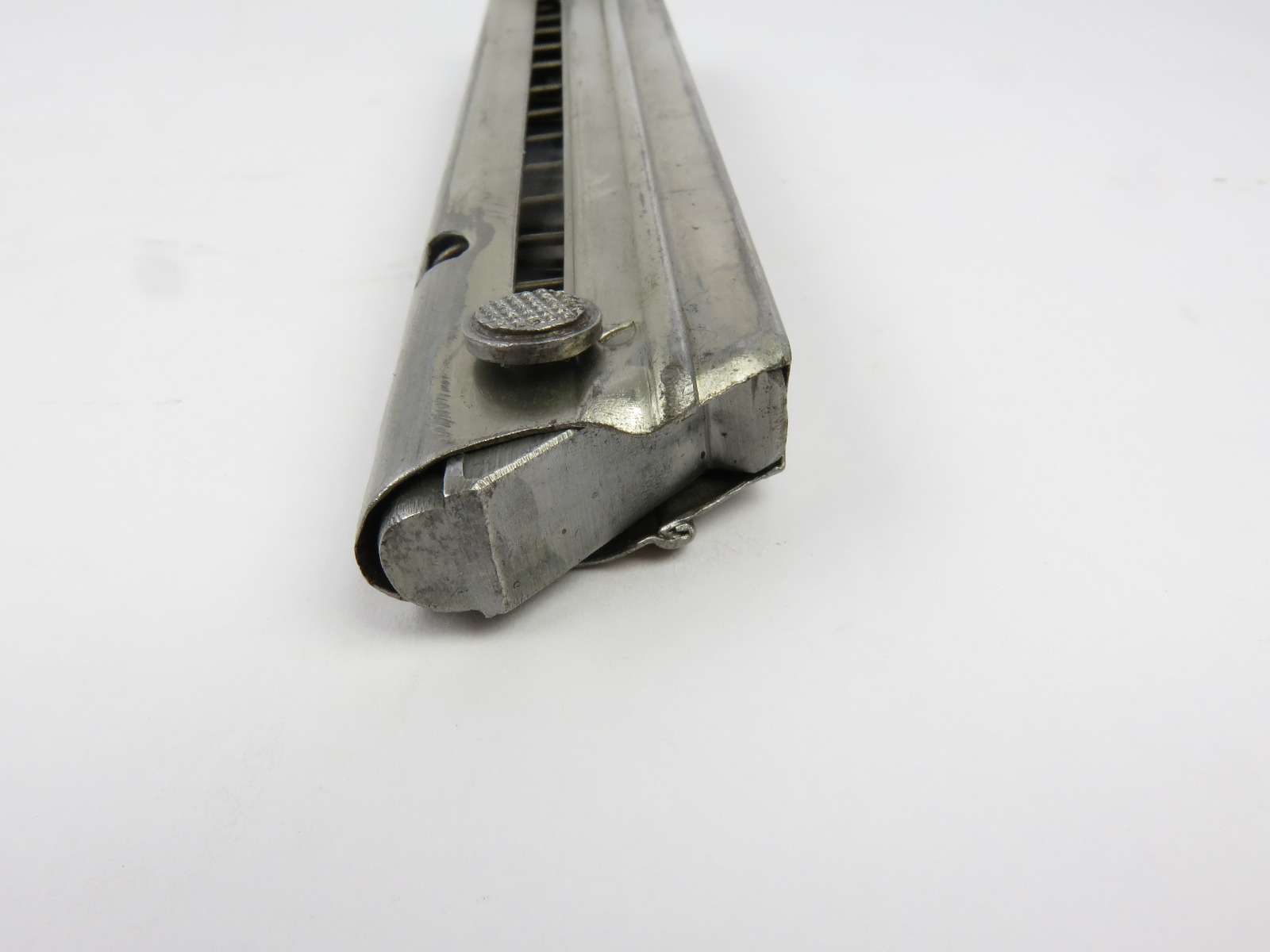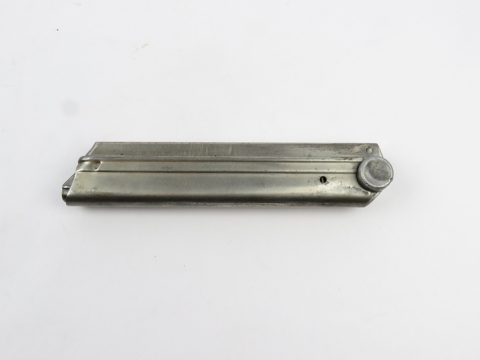 7/26/17 – This is an original WW2 era production replacement code Mauser Luger magazine. Mauser stamped their field replacement magazines “42” on the base. This magazine has that specialization, but there is also what appears to be a post-factory serial number stamp. This is a fairly minor offense, as these magazines were made to be re-issued and numbered to a new gun. The other minor offense on this magazine is the condition. There is light surface wear and surface scratches particularly on the spine. Priced accordingly. Fully functional and guaranteed original.