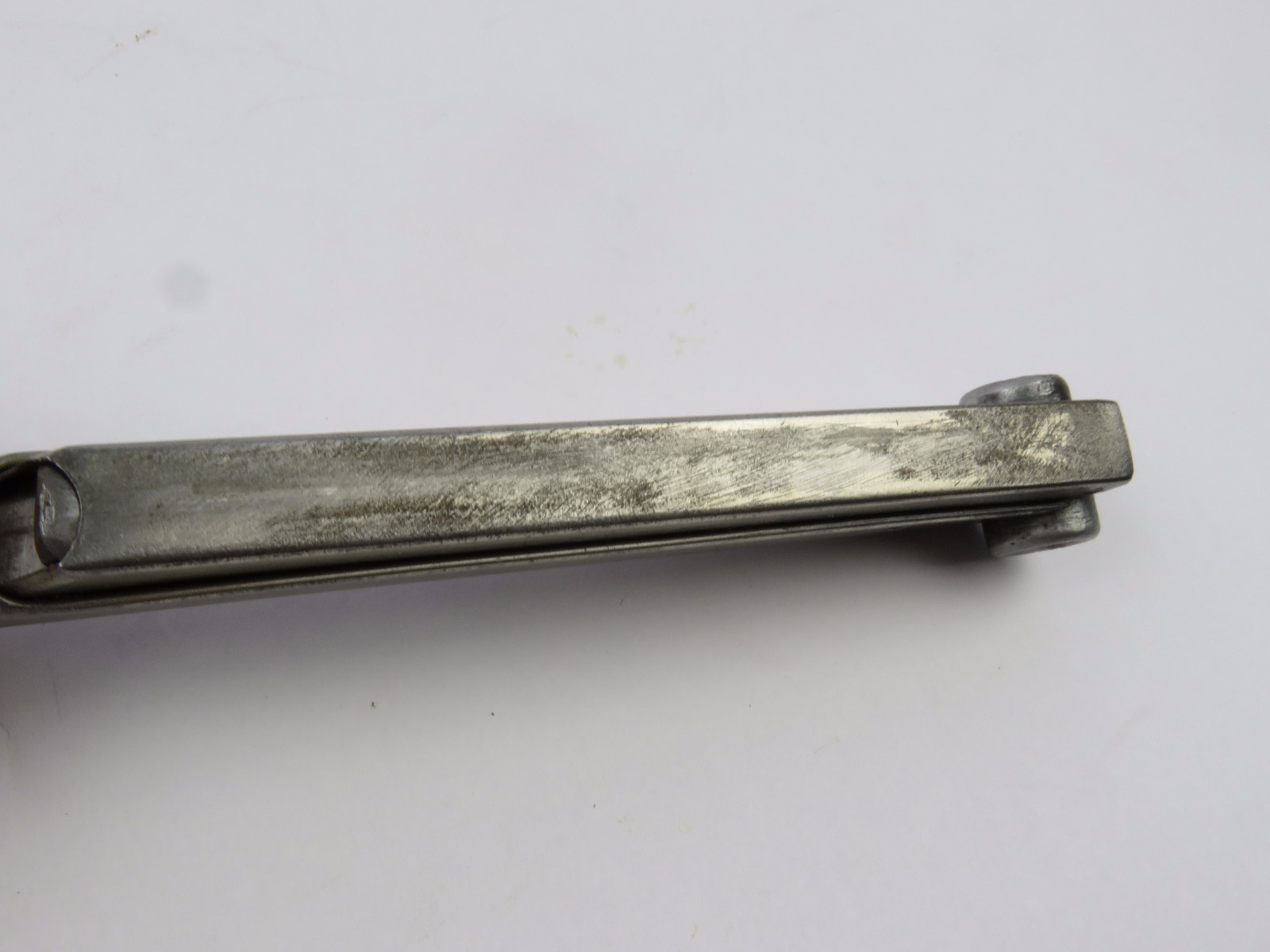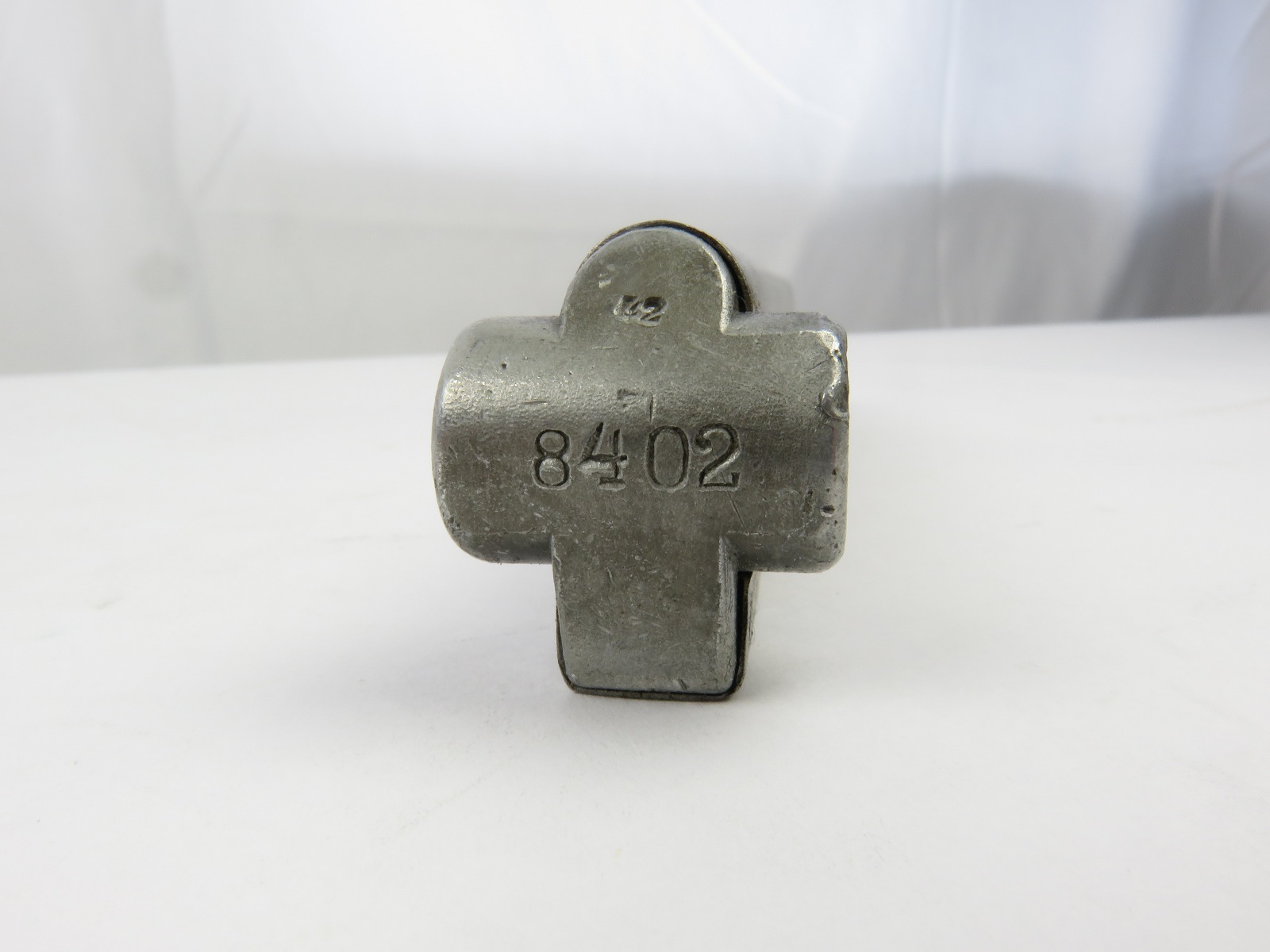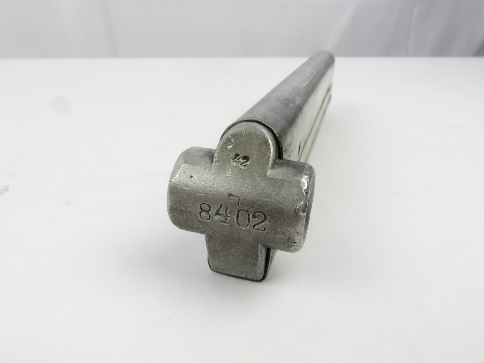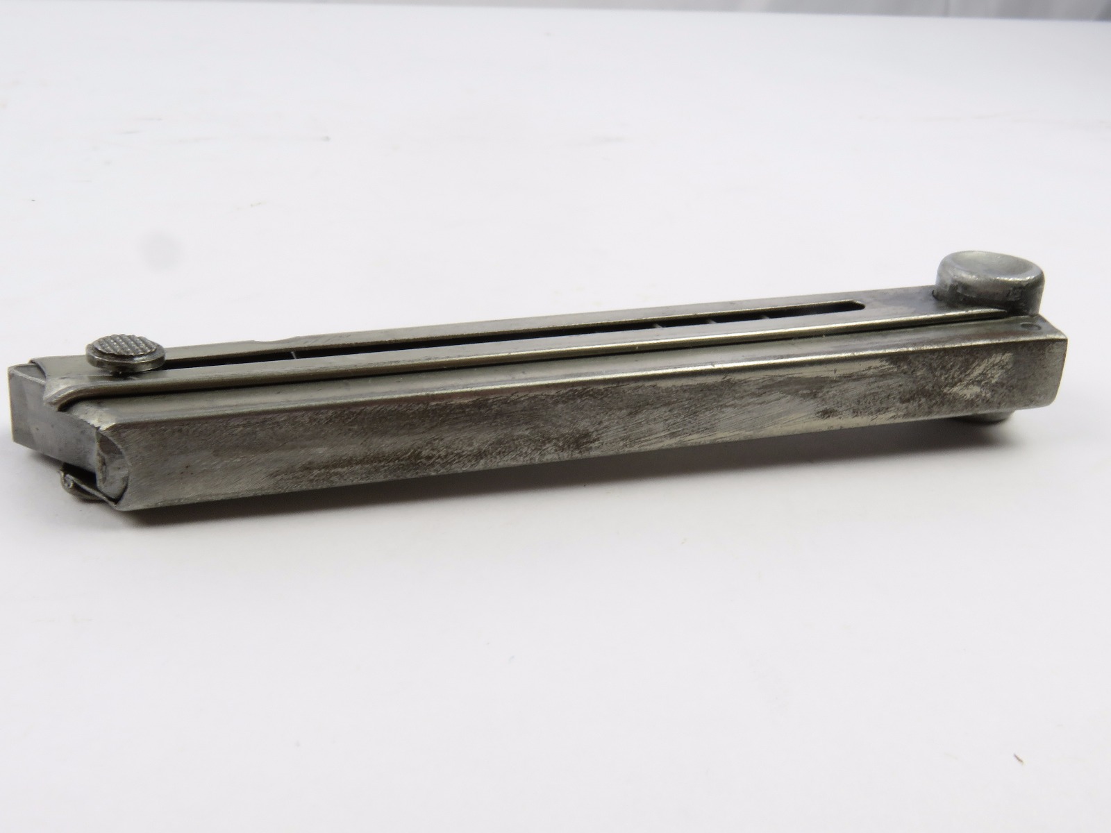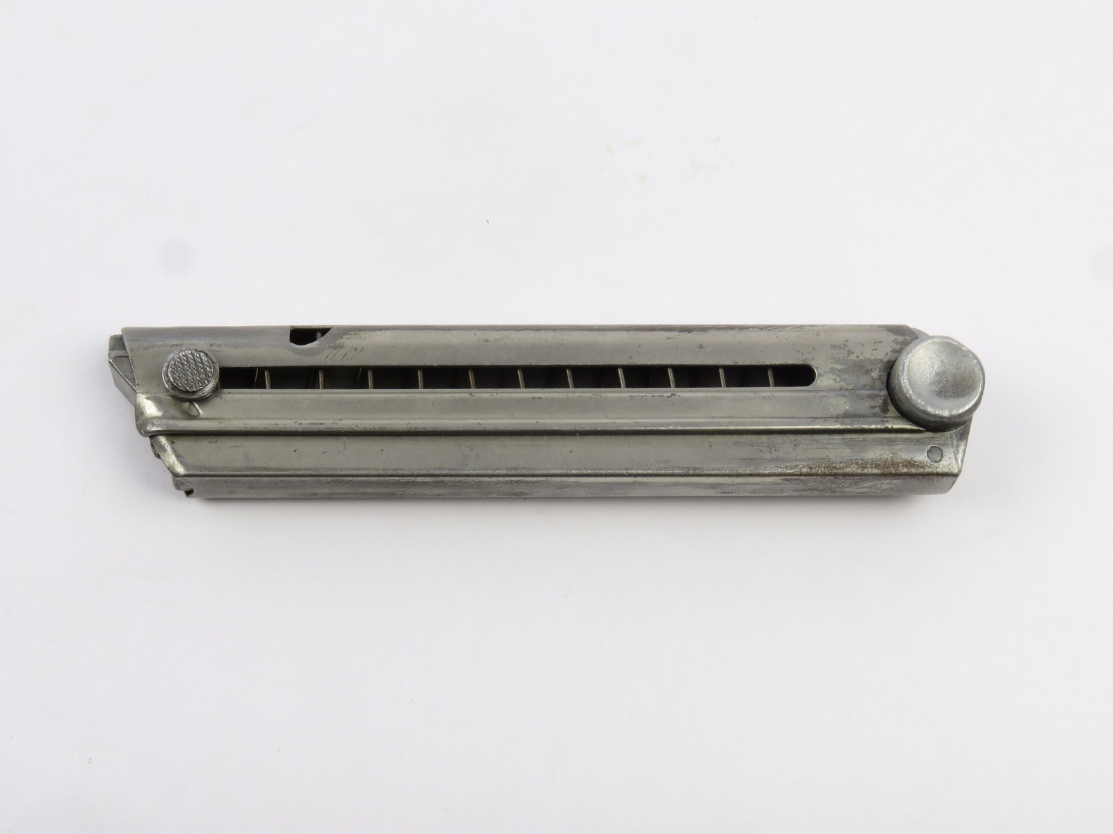 7/26/17 – This is an original WW2 era production replacement code Mauser Luger magazine. Mauser stamped their field replacement magazines “42” on the base. This magazine has that specialization, but there is also what appears to be a post-factory serial number stamp. This is a fairly minor offense, as these magazines were made to be re-issued and numbered to a new gun. The other minor offense on this magazine is the condition. There is light surface wear and surface scratches particularly on the spine. Priced accordingly. Fully functional and guaranteed original.