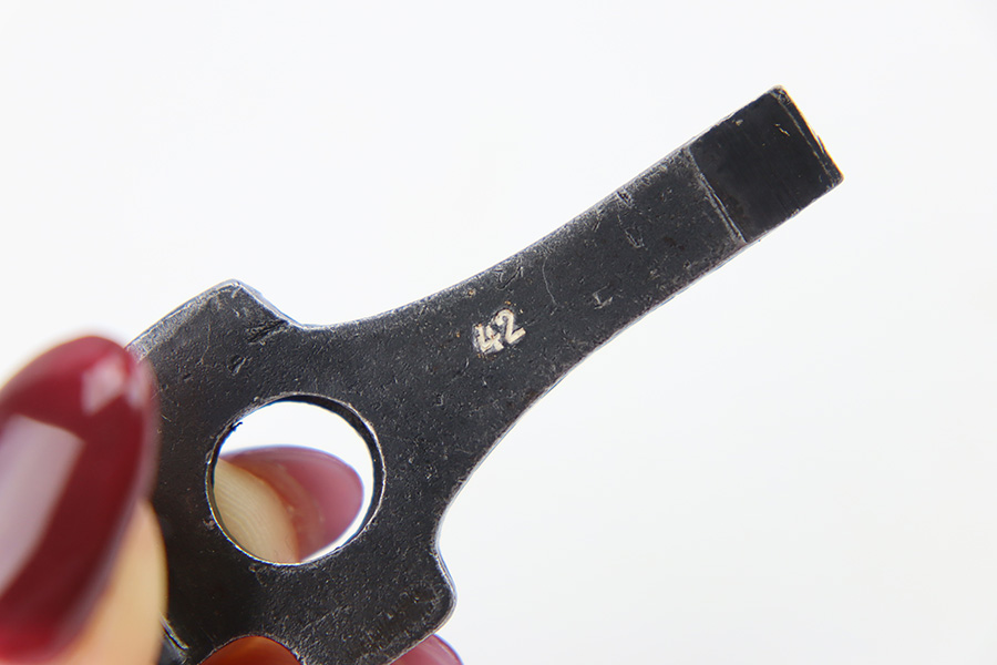 12/18/23 – This is an original WW2 Mauser “42 Code” Luger tool. The tool is stamped on the front metal with “42” which is an armory stamp for field replacement parts, such as magazines and tools. The tool is in excellent overall condition with minimal finish loss.