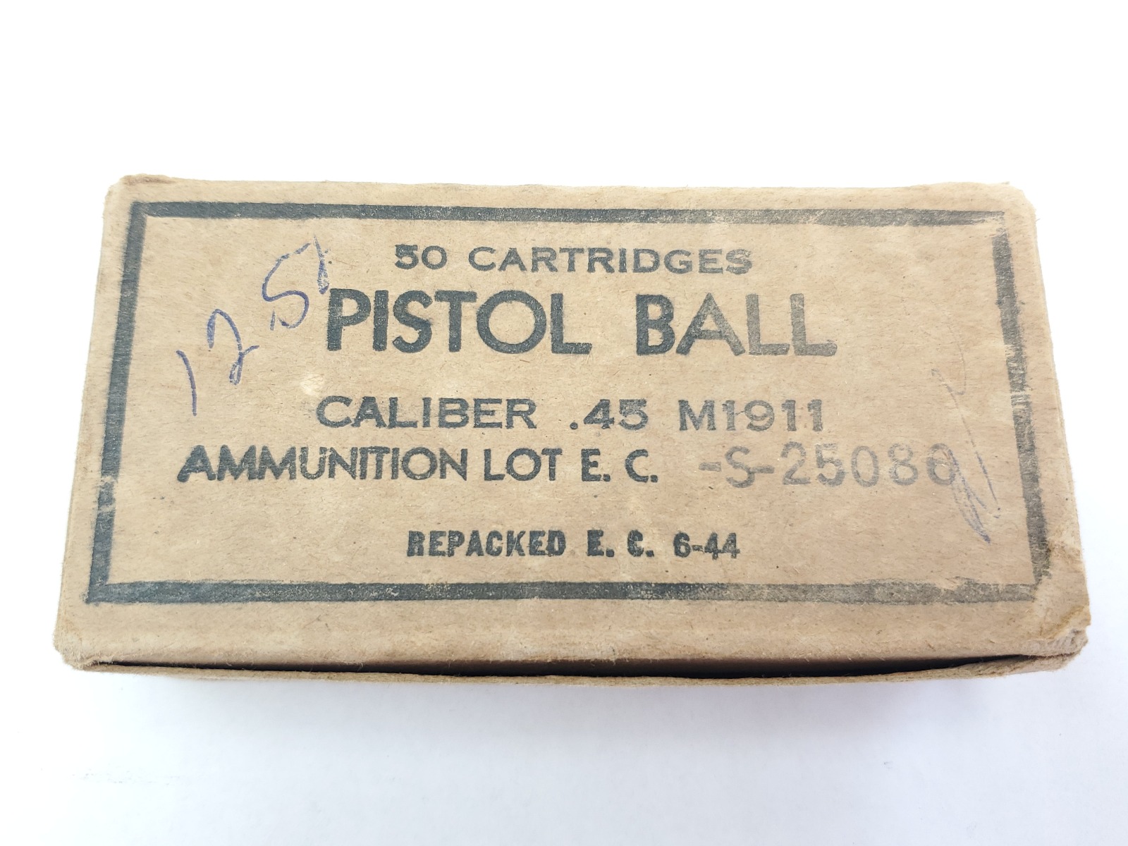 7/1/20 – This is an original box of 50 rounds for the model 1911A1 pistol made during WW2. The original box is in great condition and completely in tact. All rounds are present inside the box and also in great condition. Stamped “E C 43” on the headstamp.